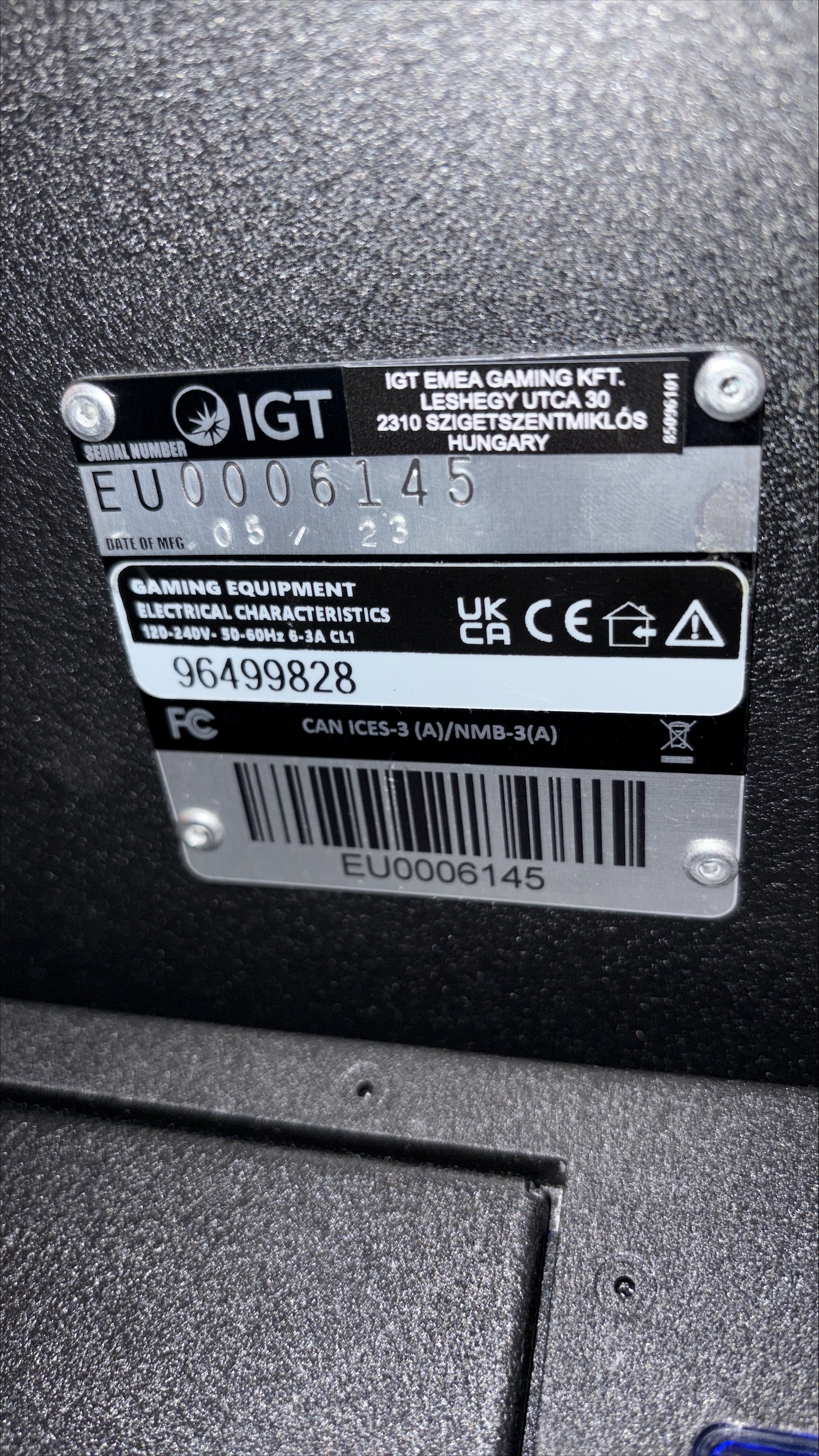 Casino-rated slot machine of slant top model with no games, function tested May 13, 2025.
