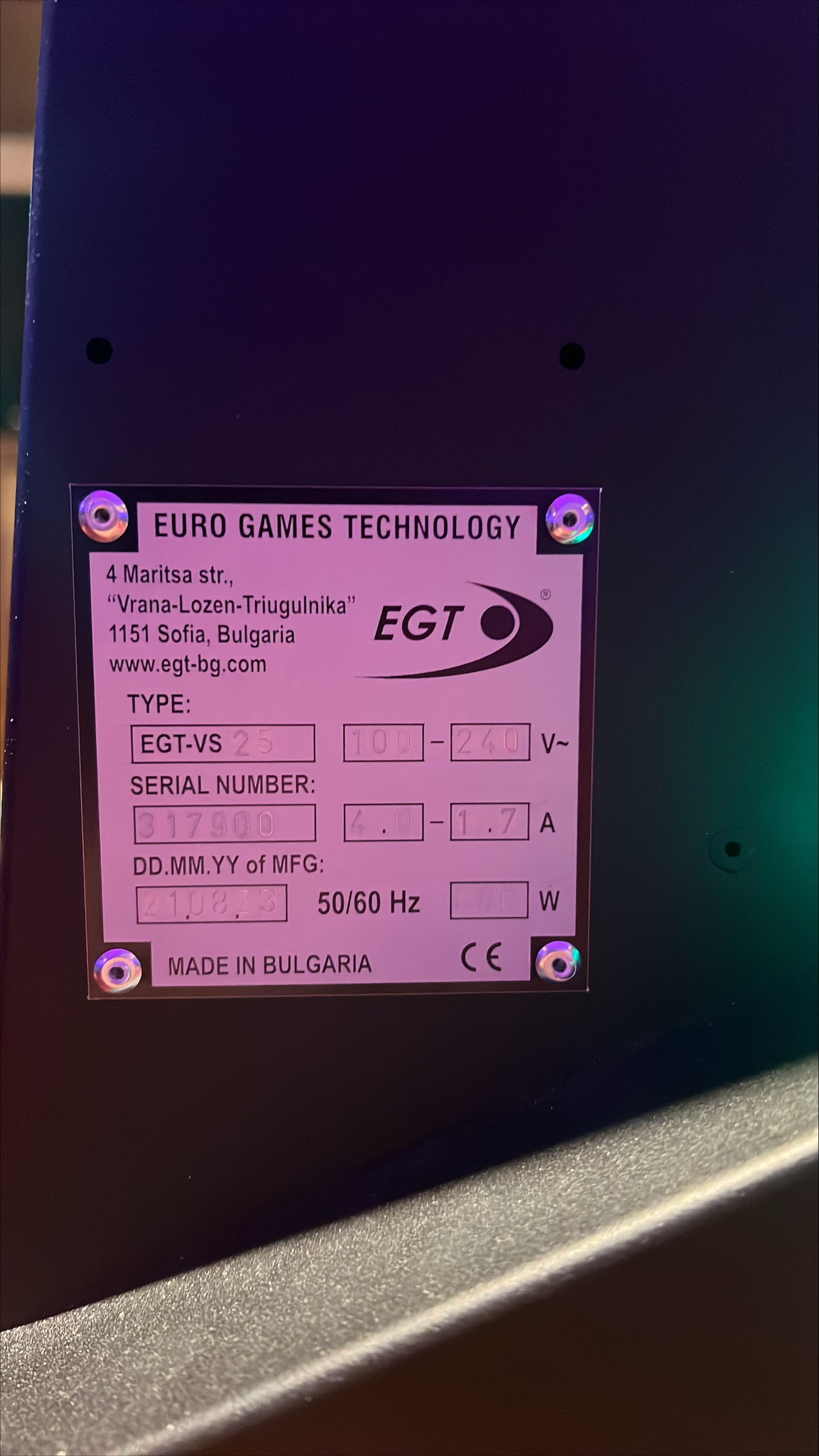 Casino-grade slot machine of slant top model with one game, top sign and VIP chair. Function tested May 21, 2025.