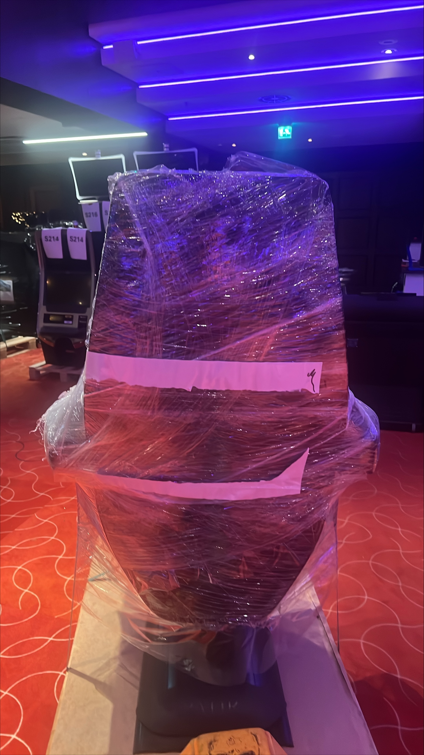 Casino-grade slot machine of slant top model with one game, top sign and VIP chair. Function tested May 21, 2025.