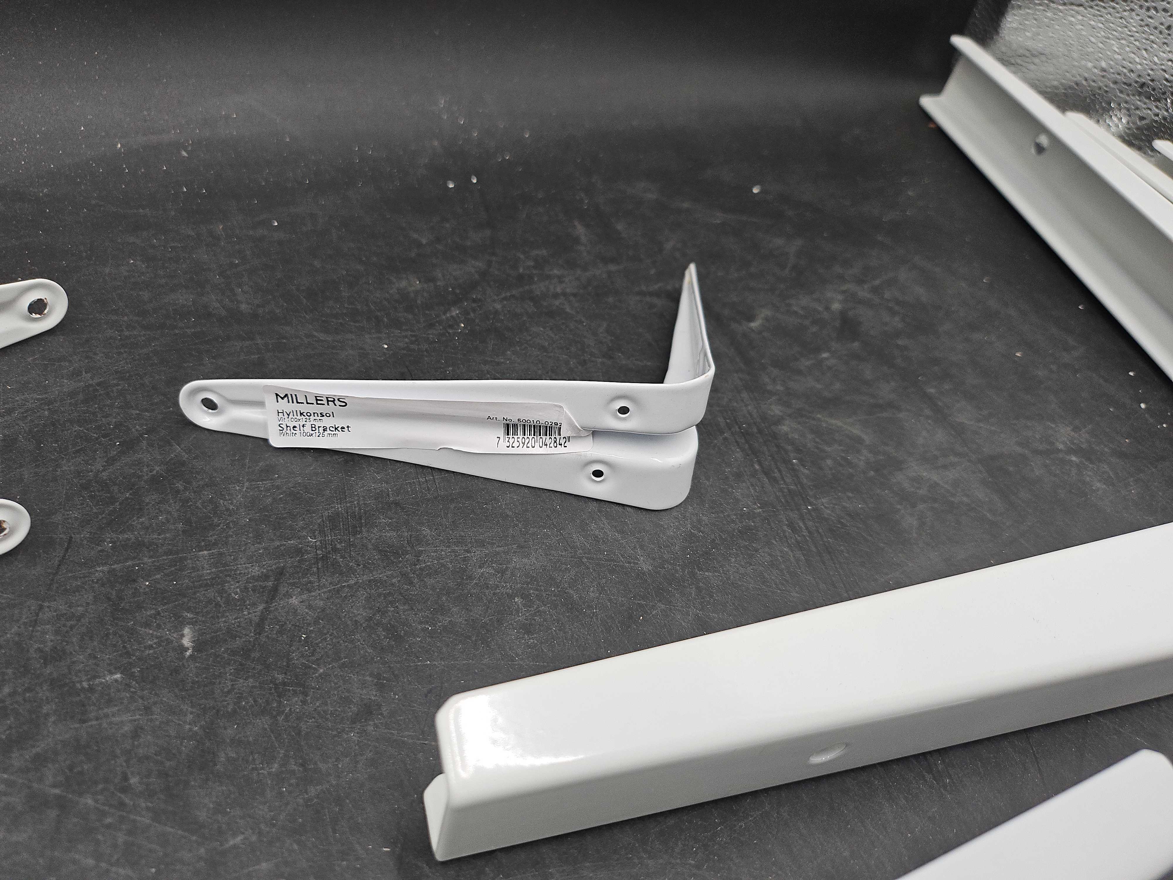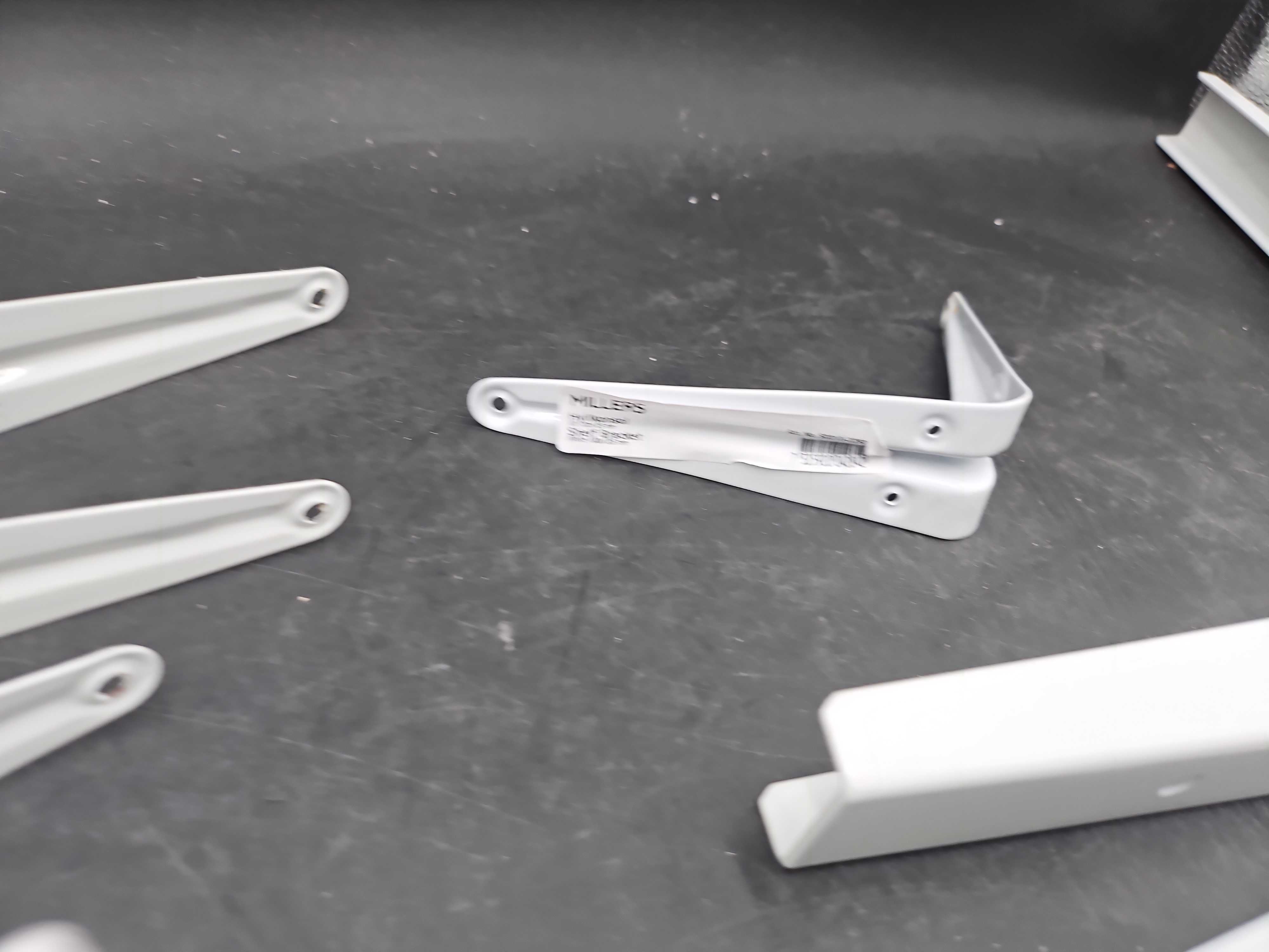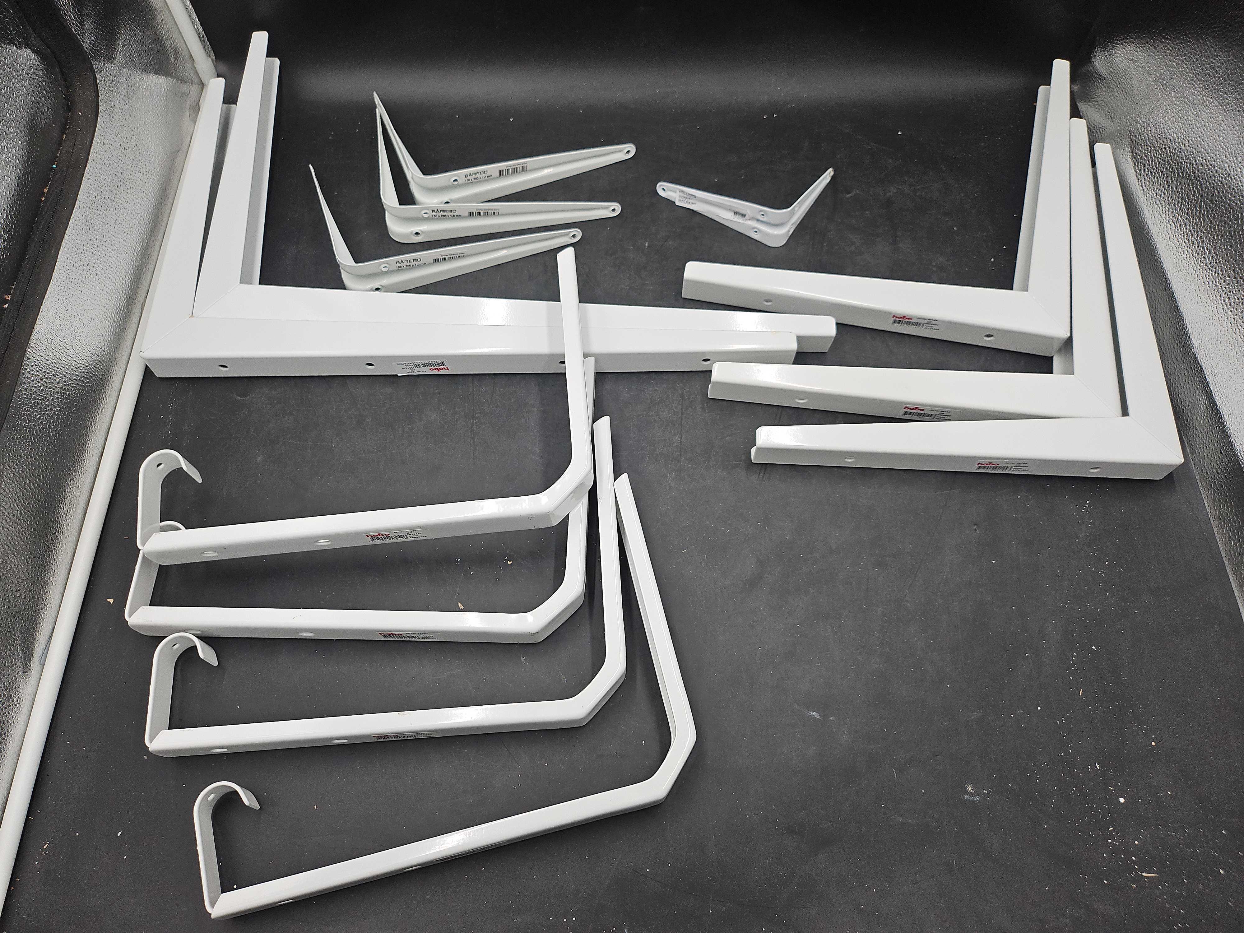 Mix of white metal wall brackets for mounting shelves and wall solutions. Various models and sizes from Habo, Bårebo and Millers.