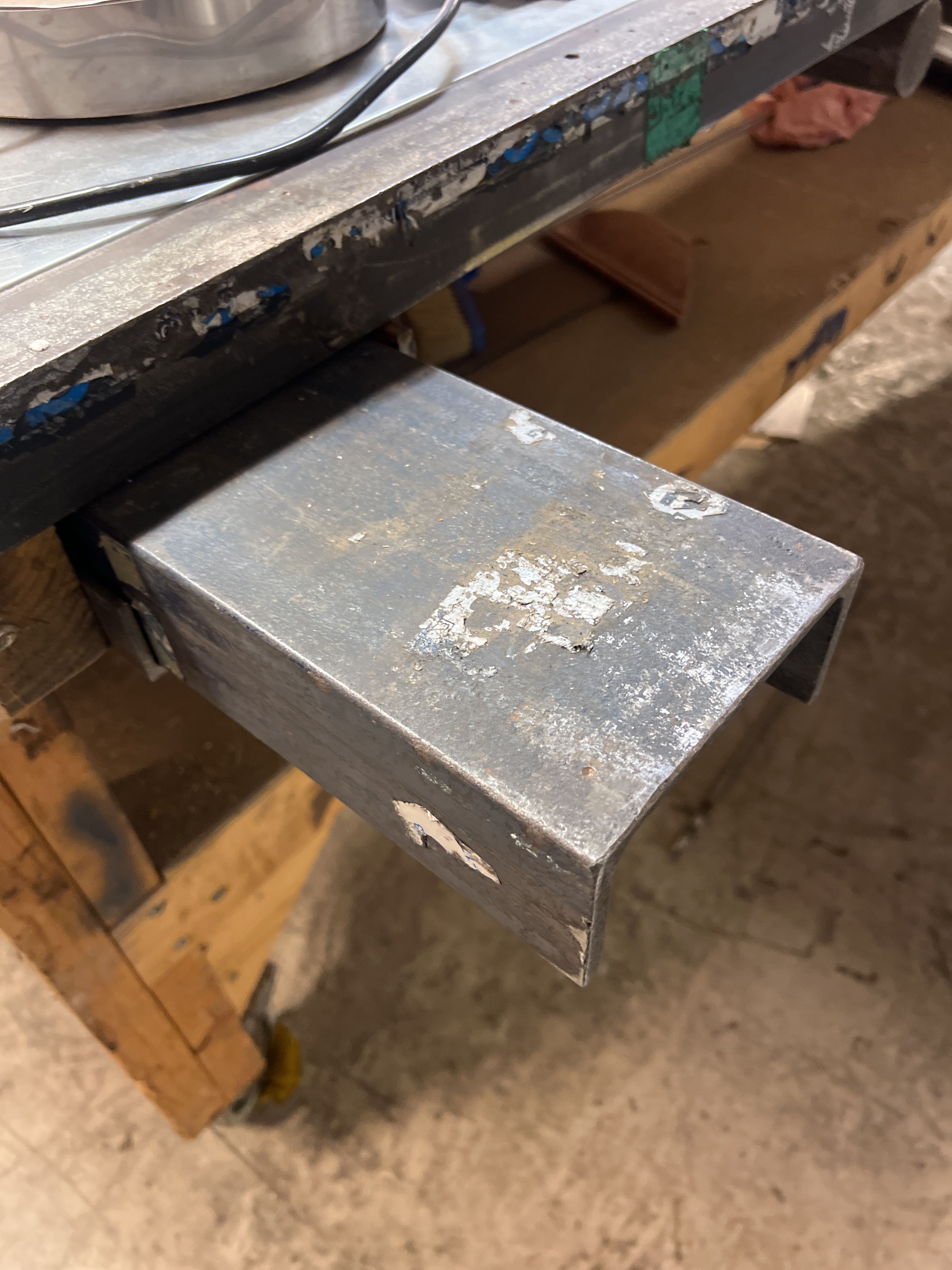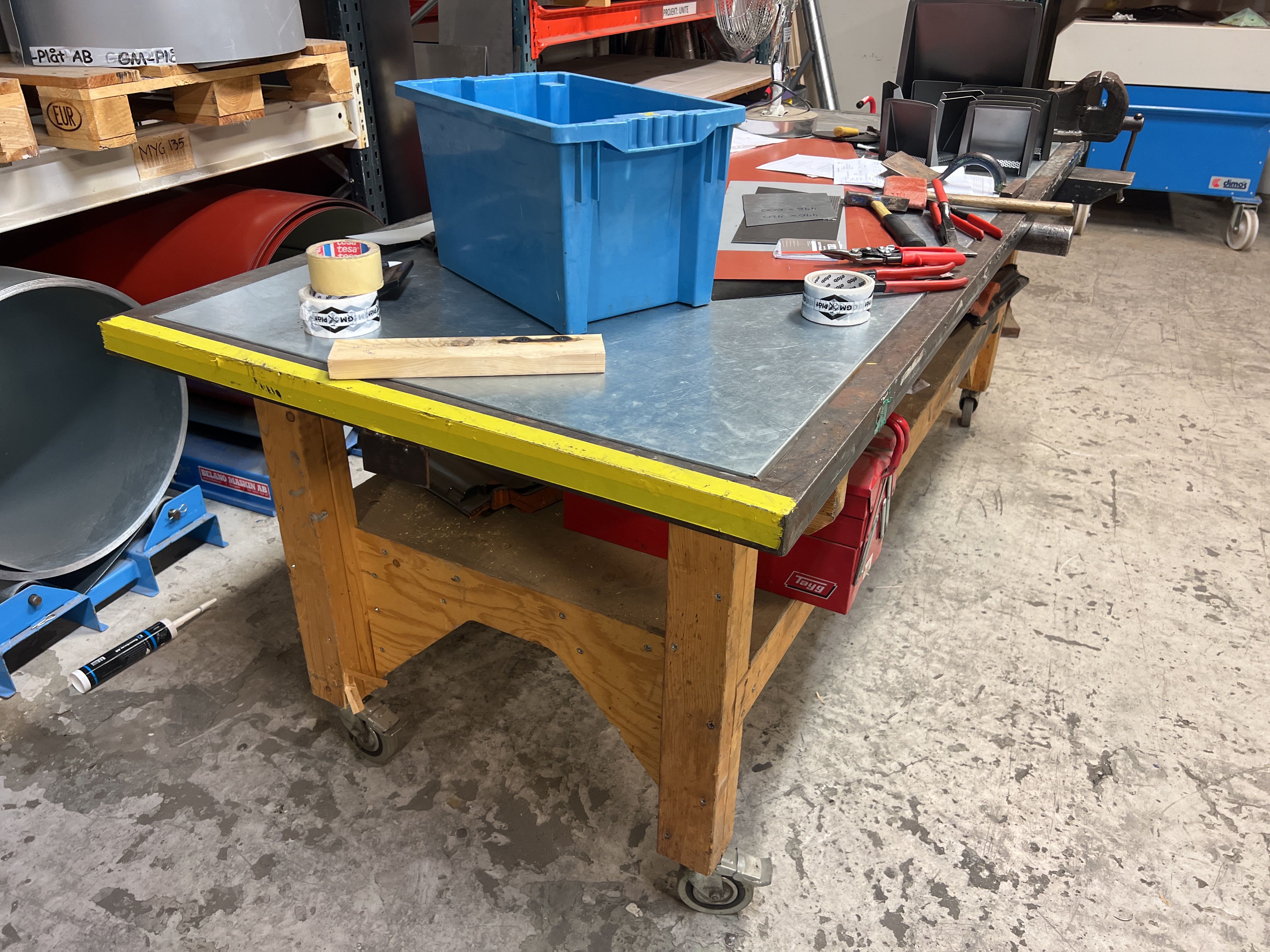 Sheet metal workbench on wheels with fixed vise and sheet metal work details