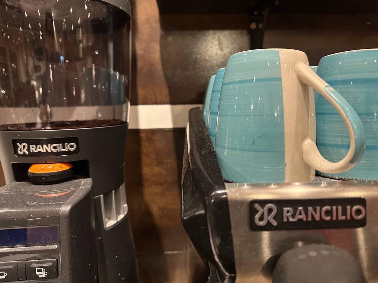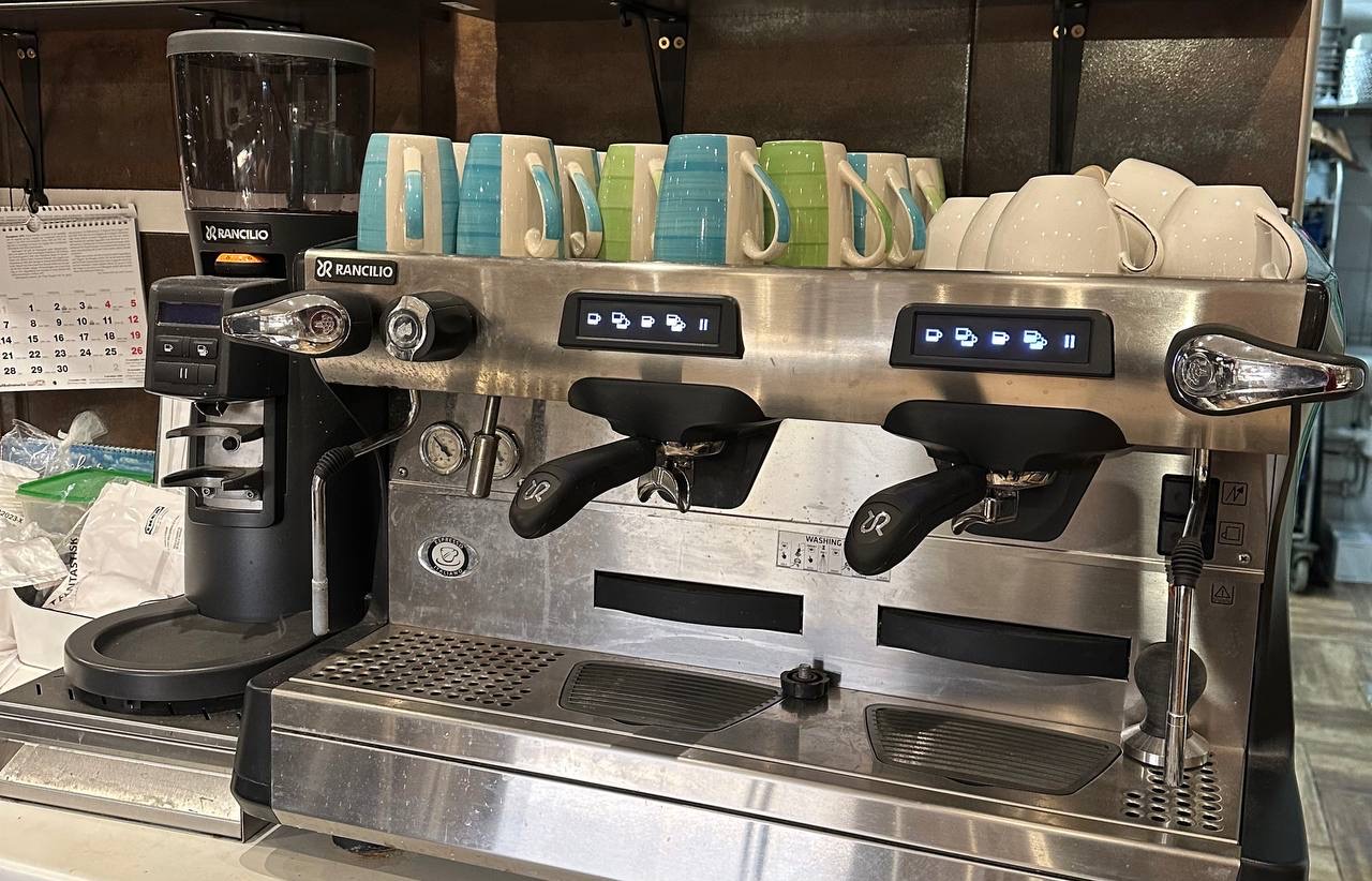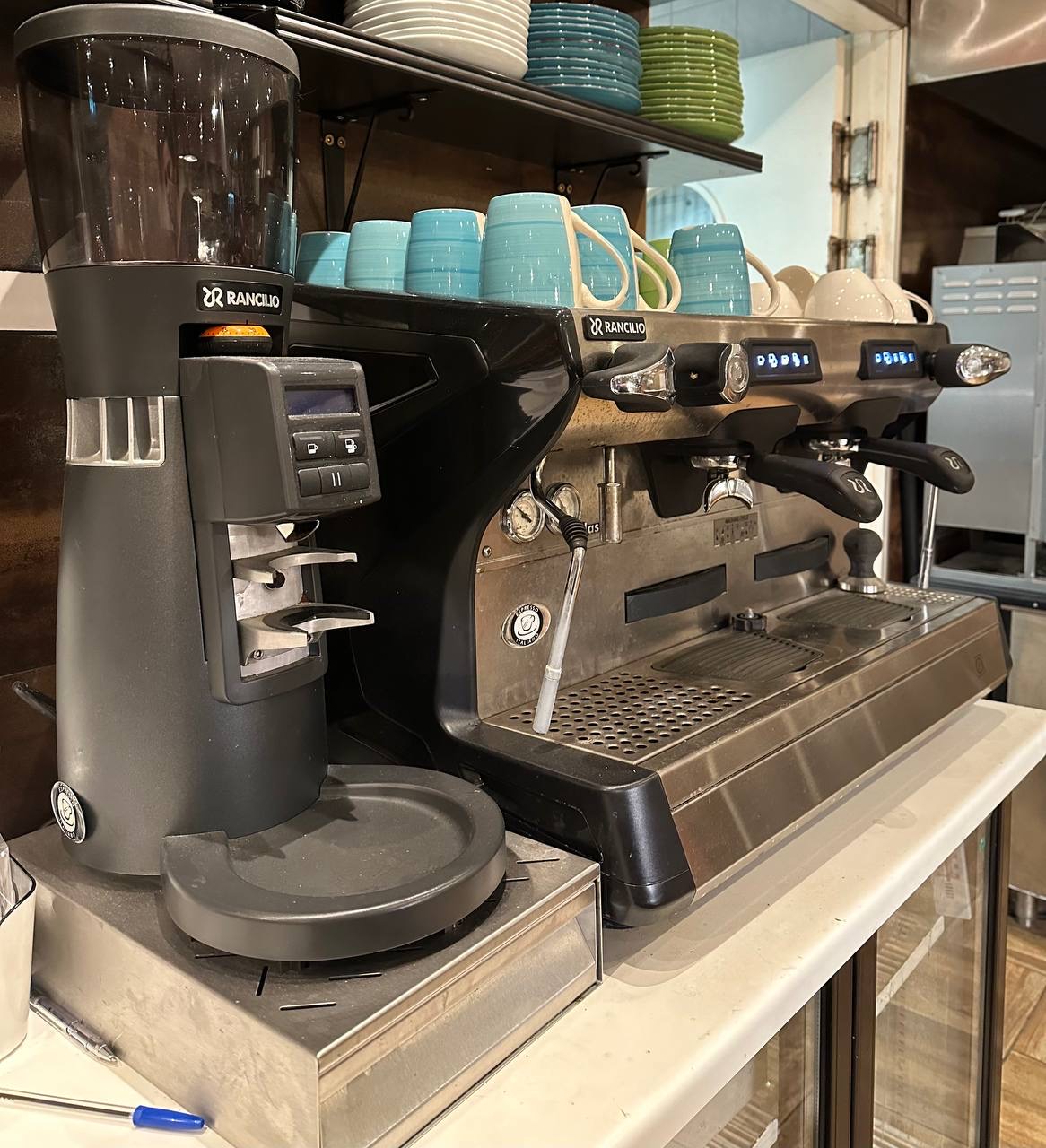 • Equipment: 2 brewing groups, steam wand, hot water outlet, cup warmer
