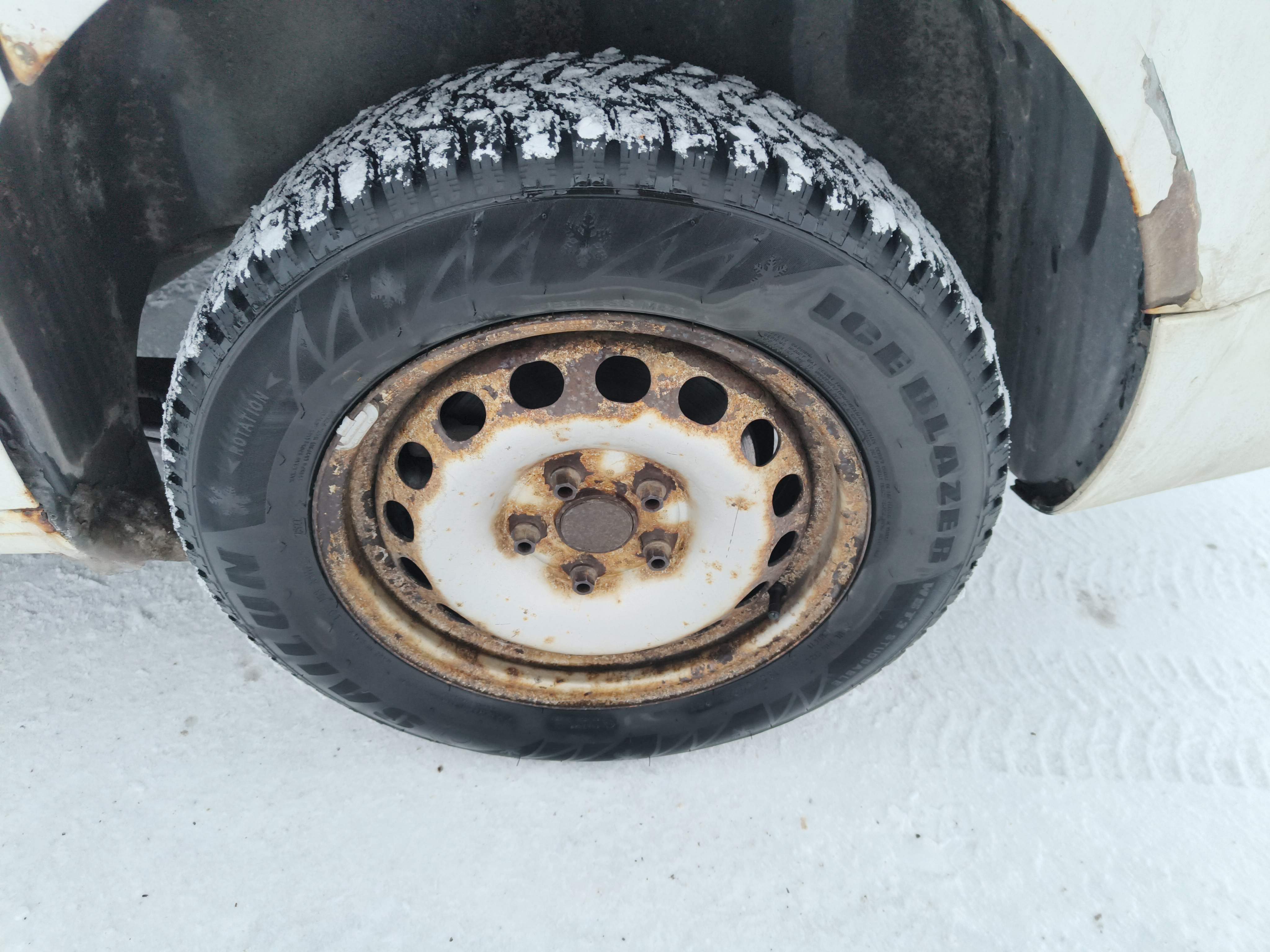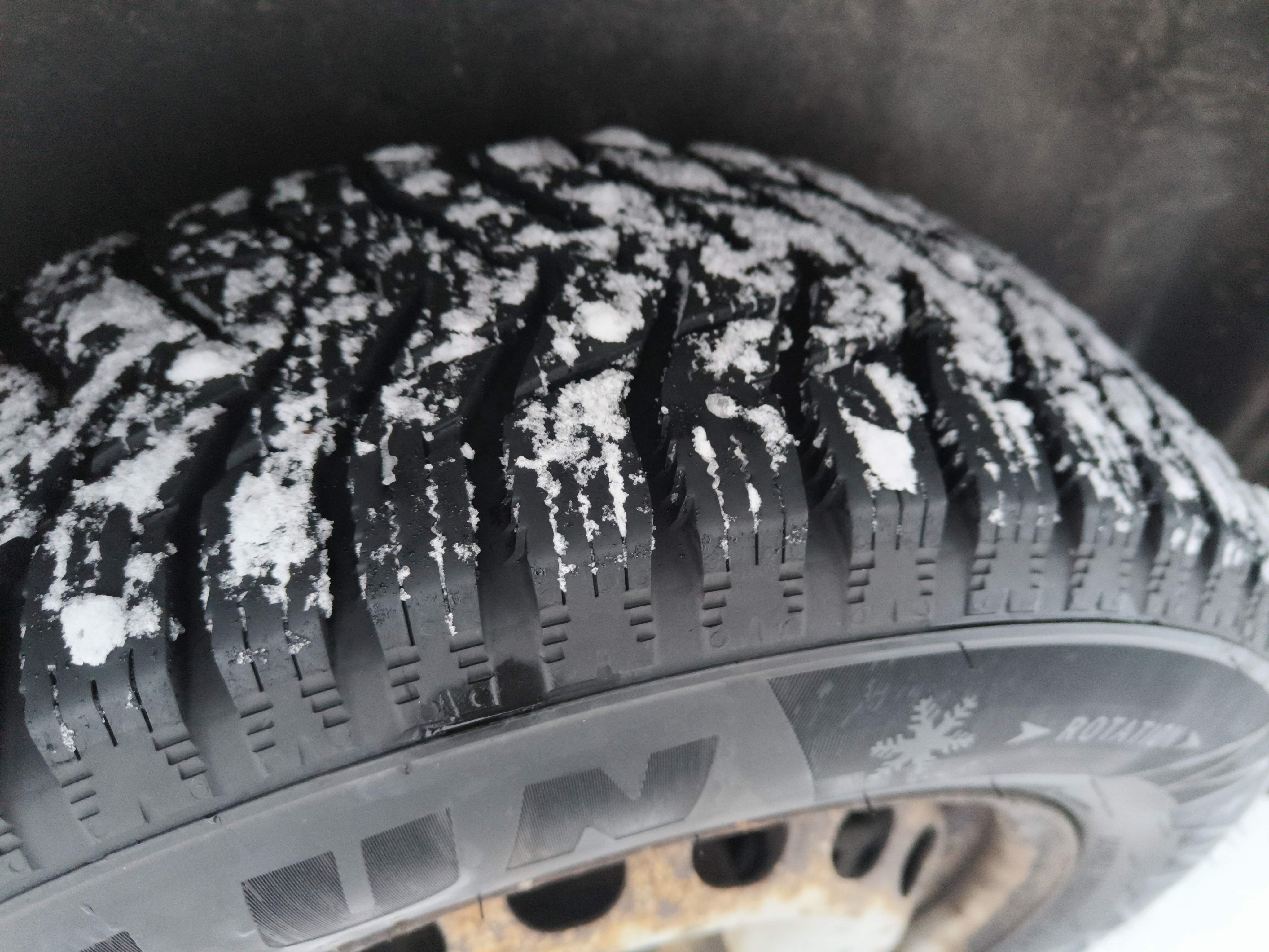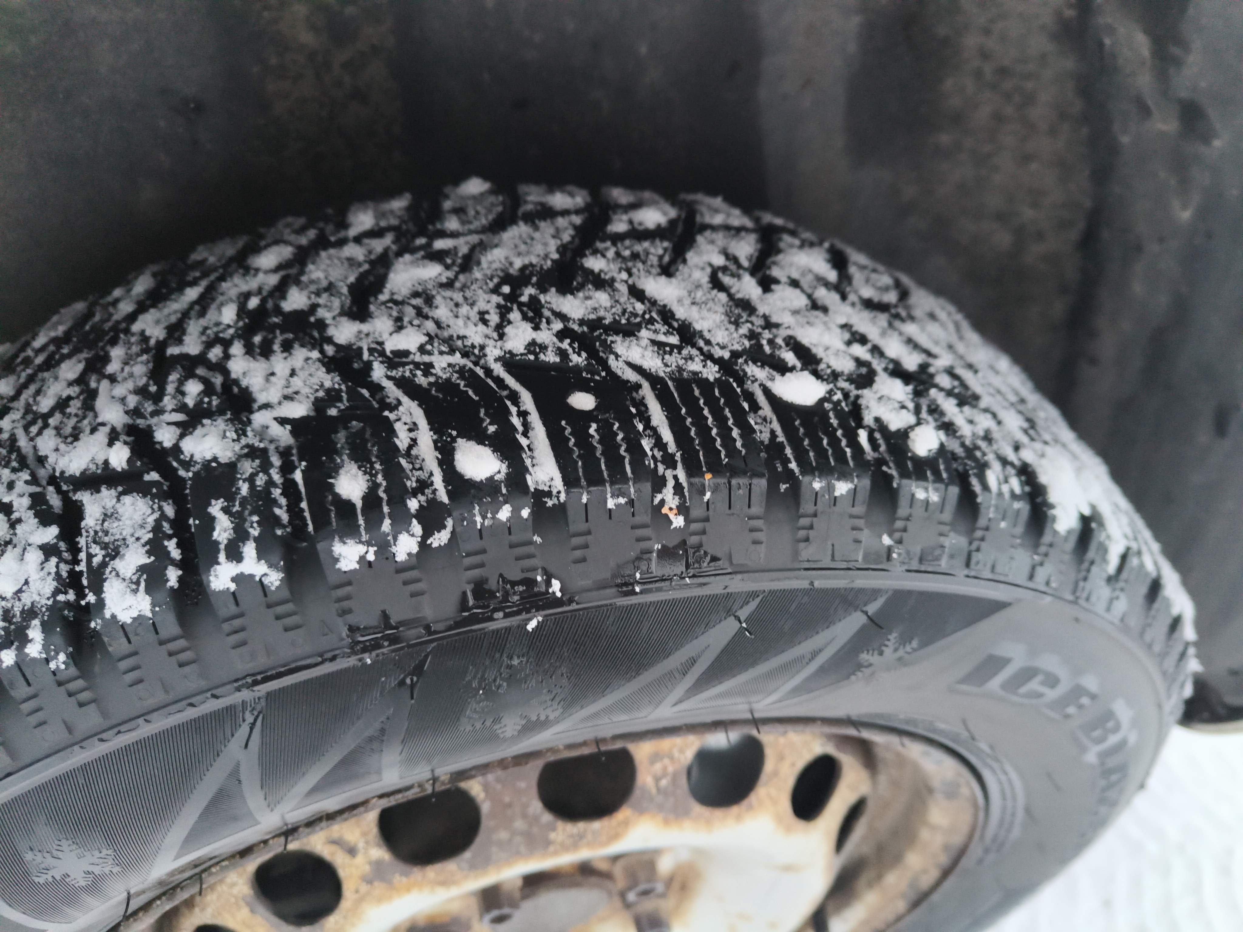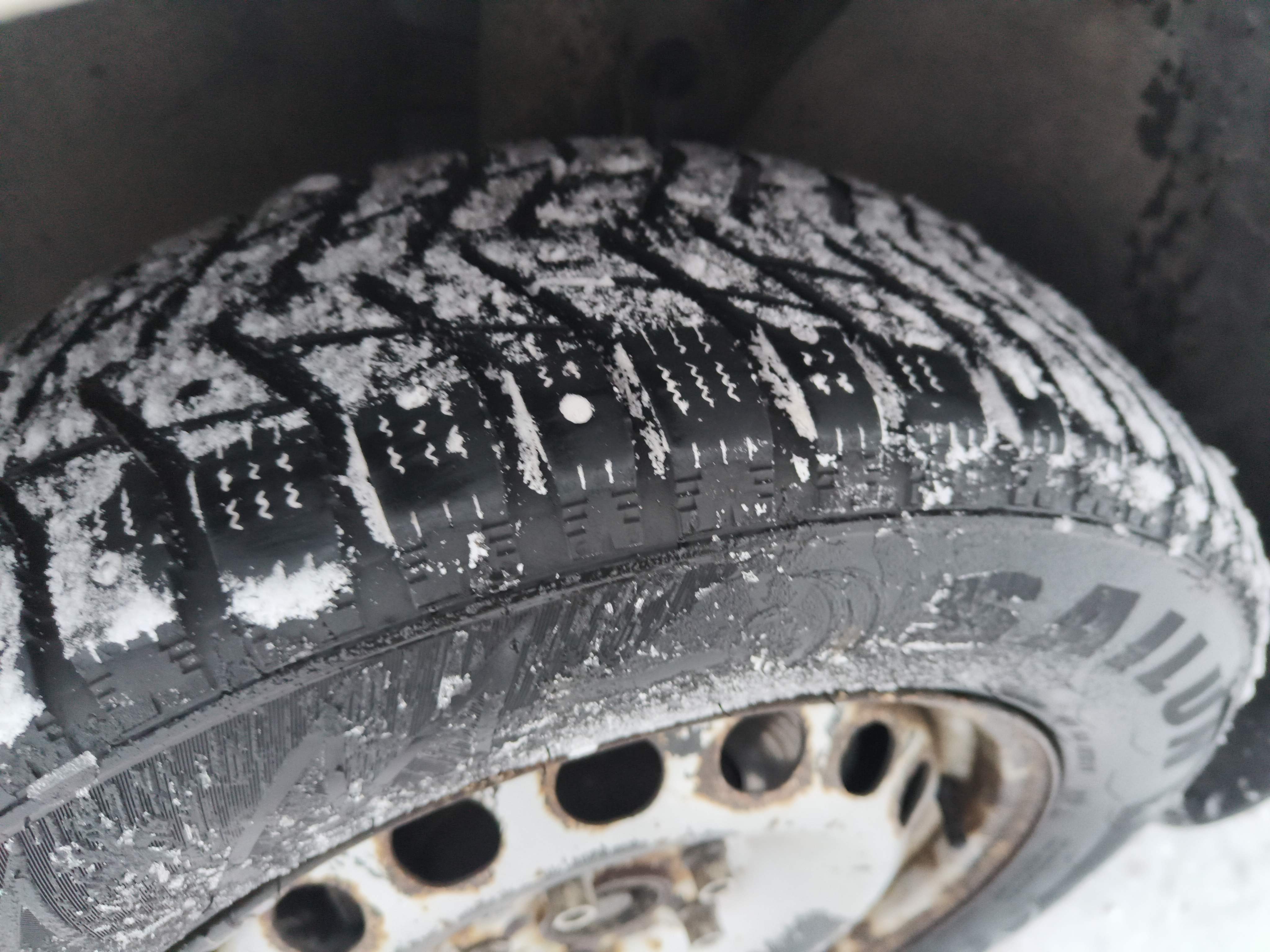 Studded winter tires on steel rims, approximately 30-40% of the tread depth remains.