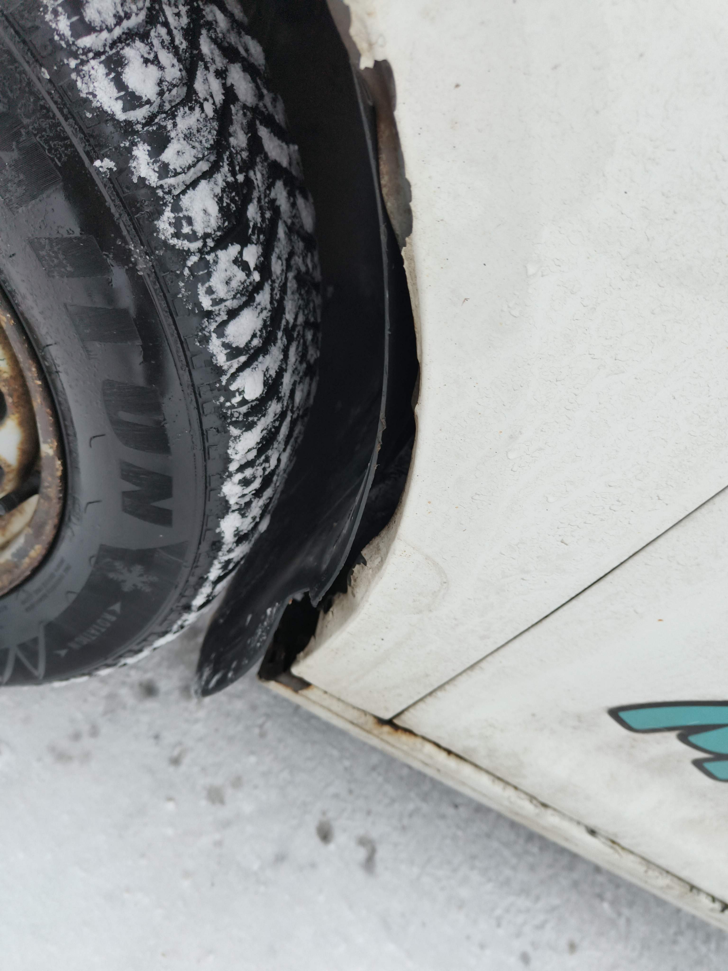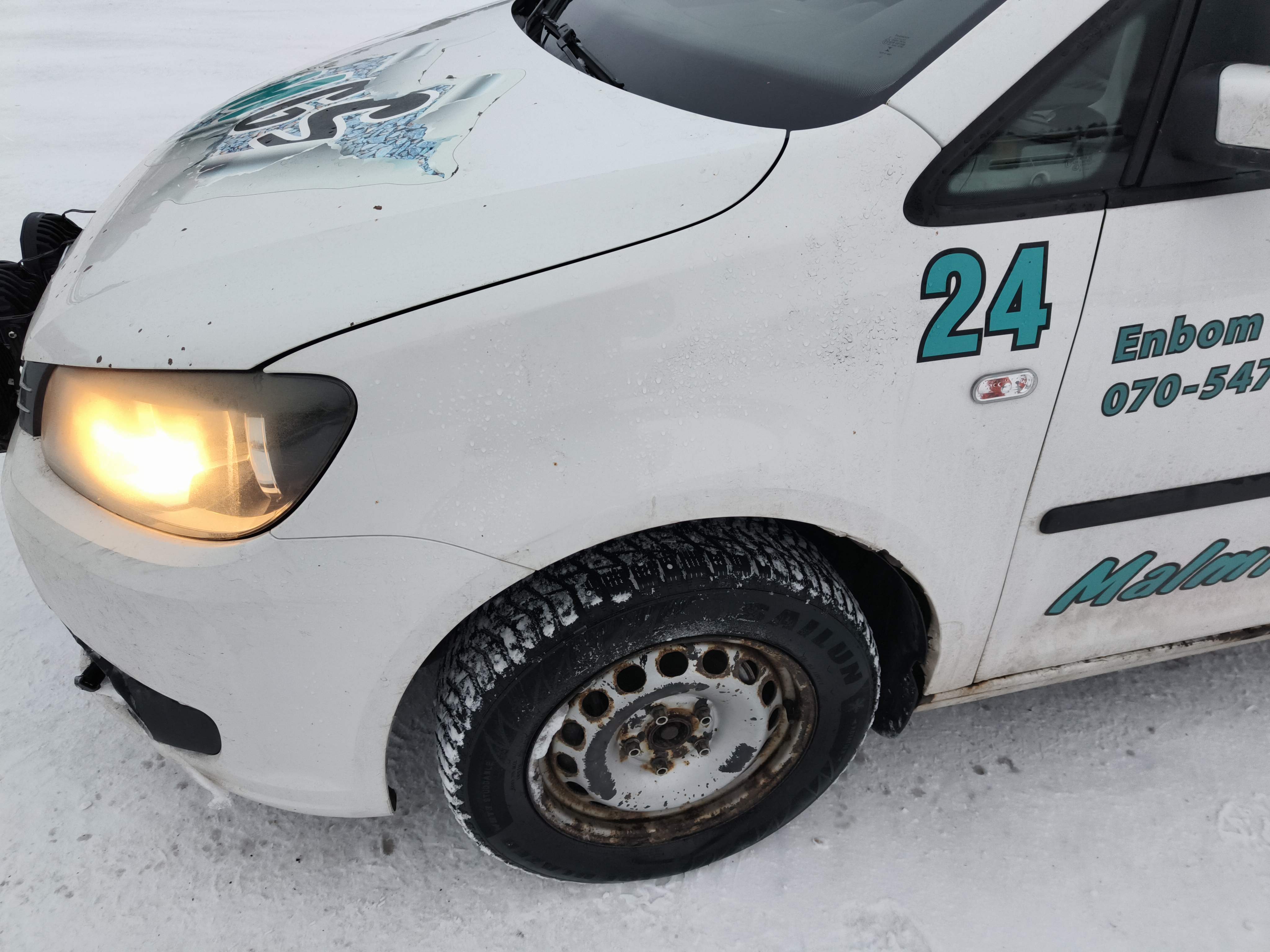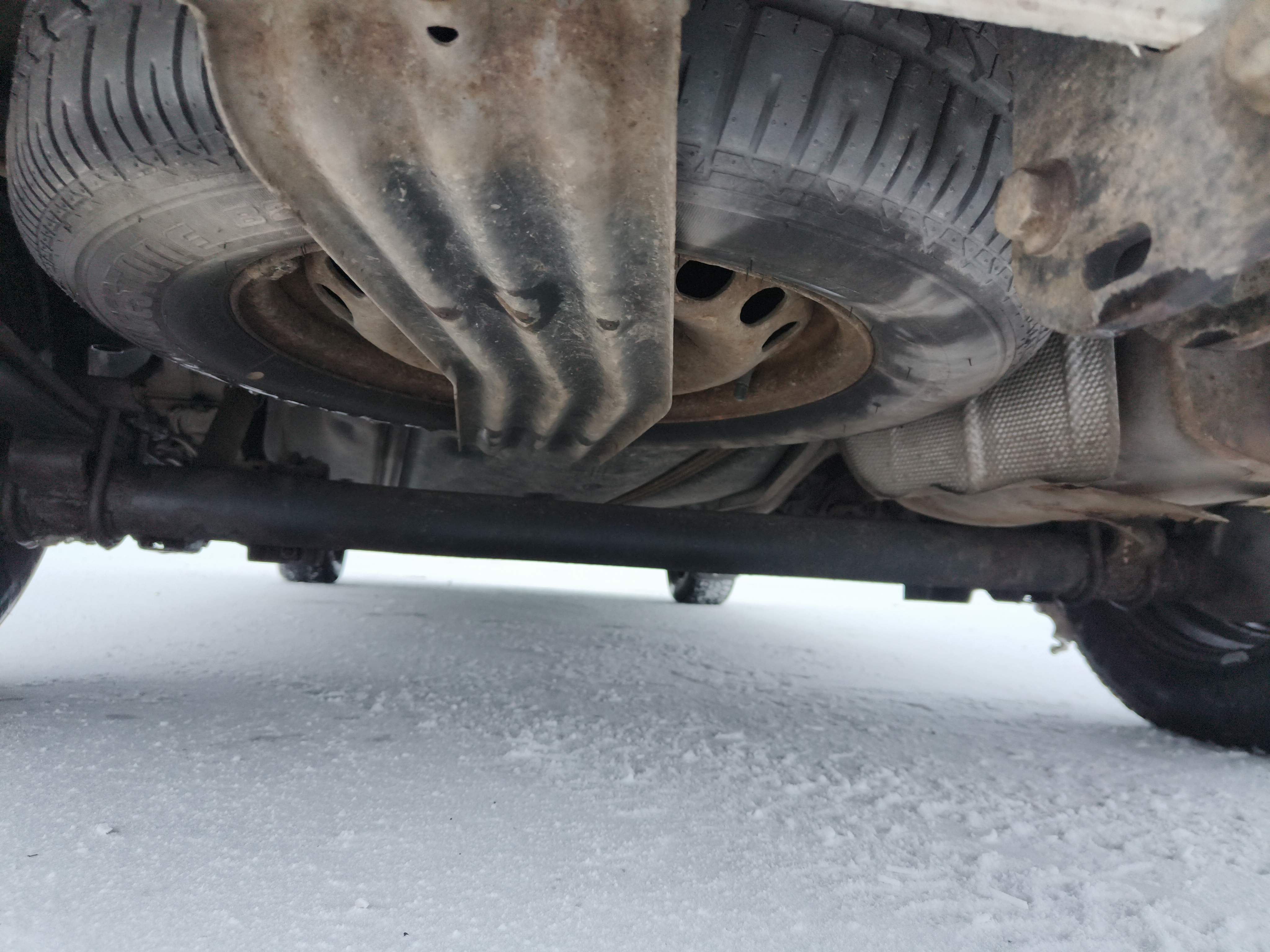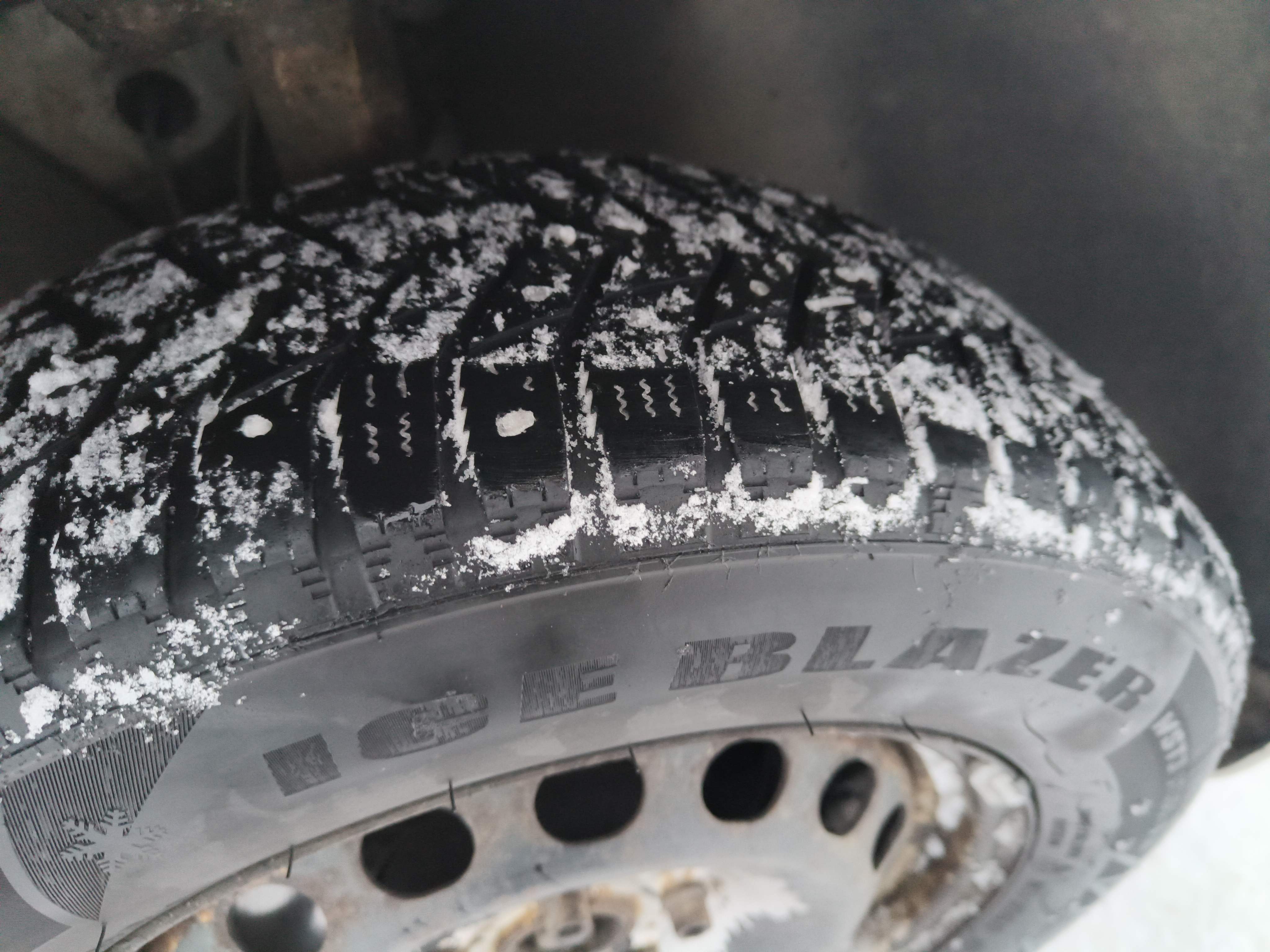 Studded winter tires on steel rims, approximately 30-40% of the tread depth remains.