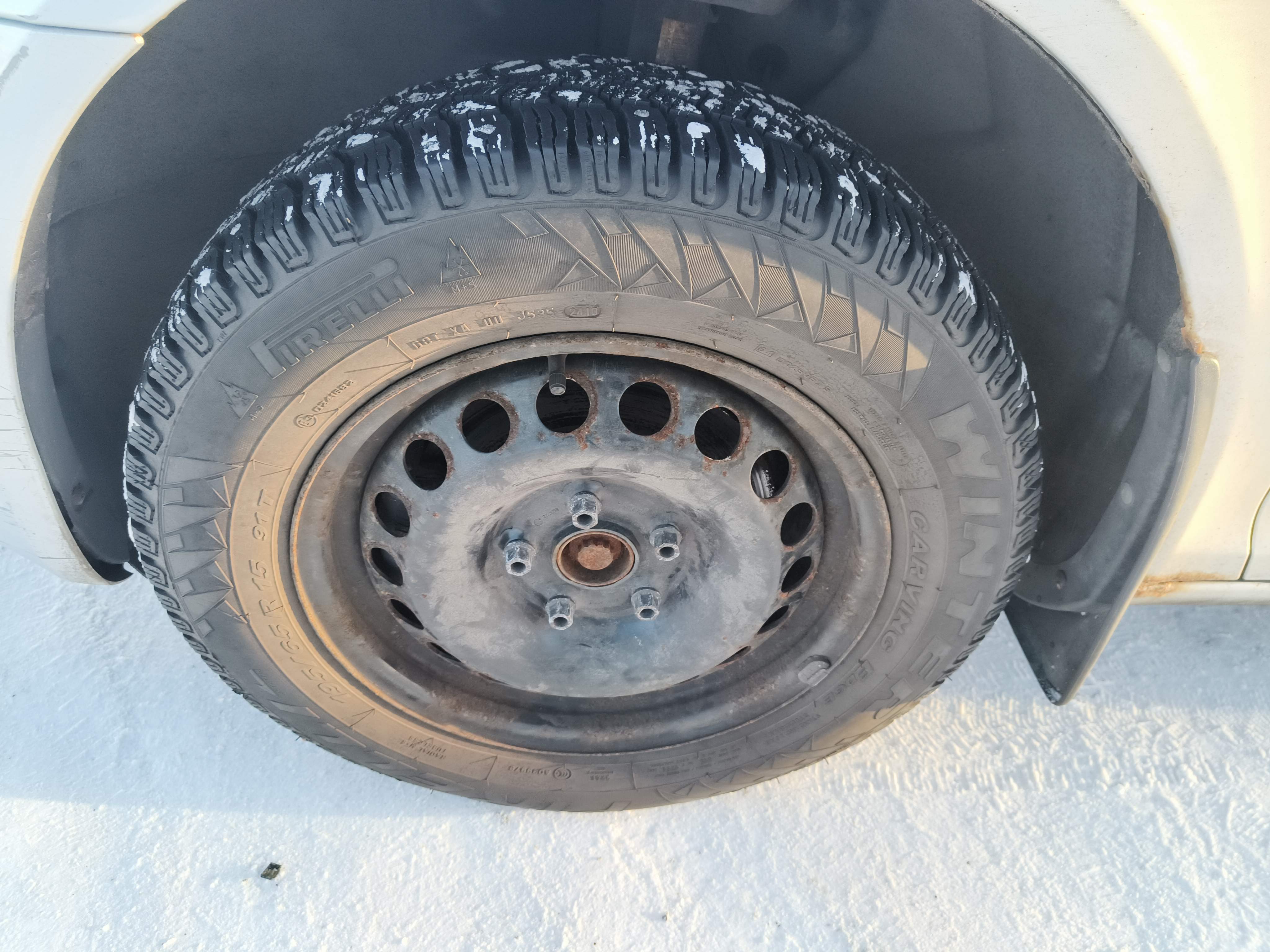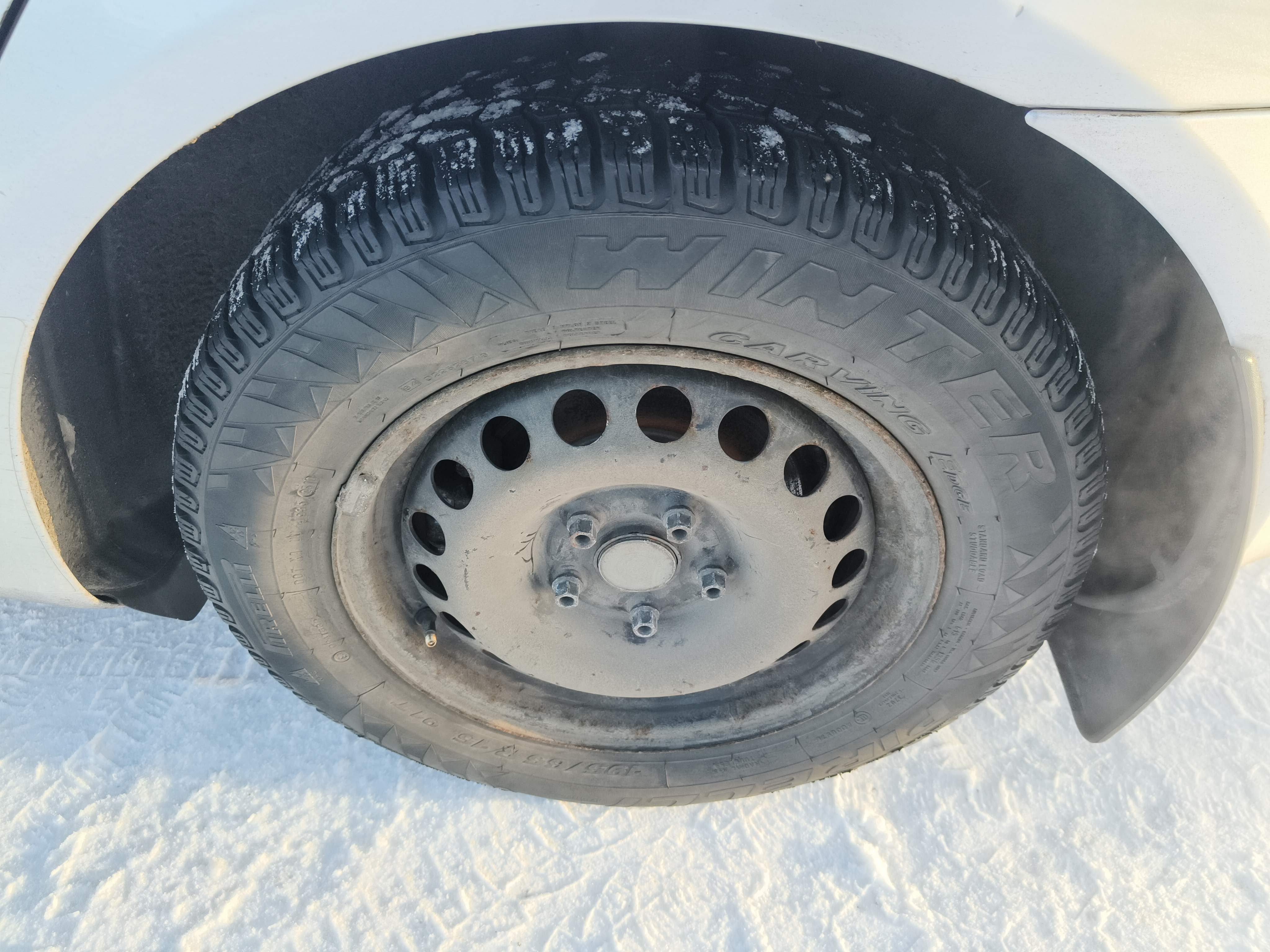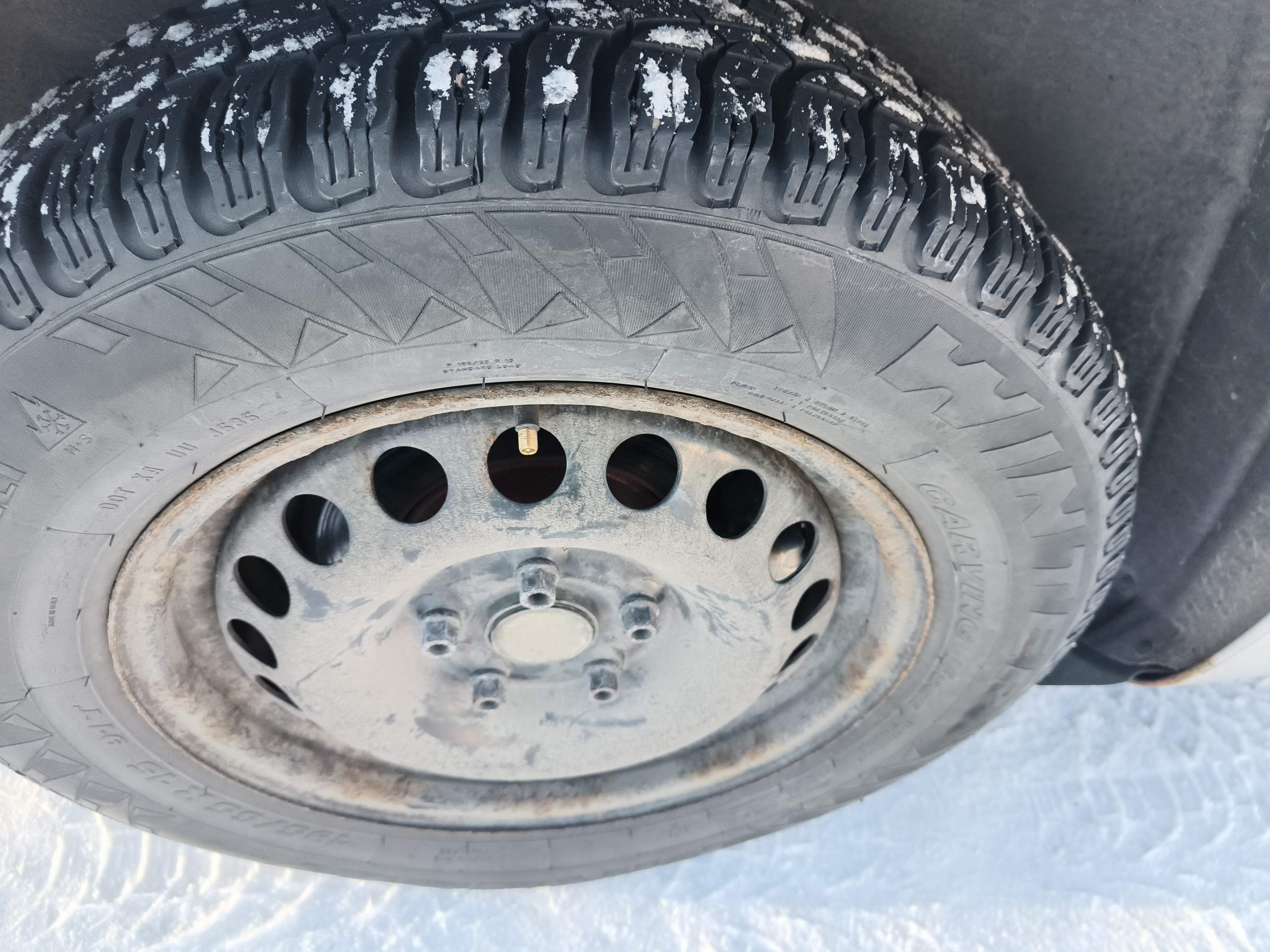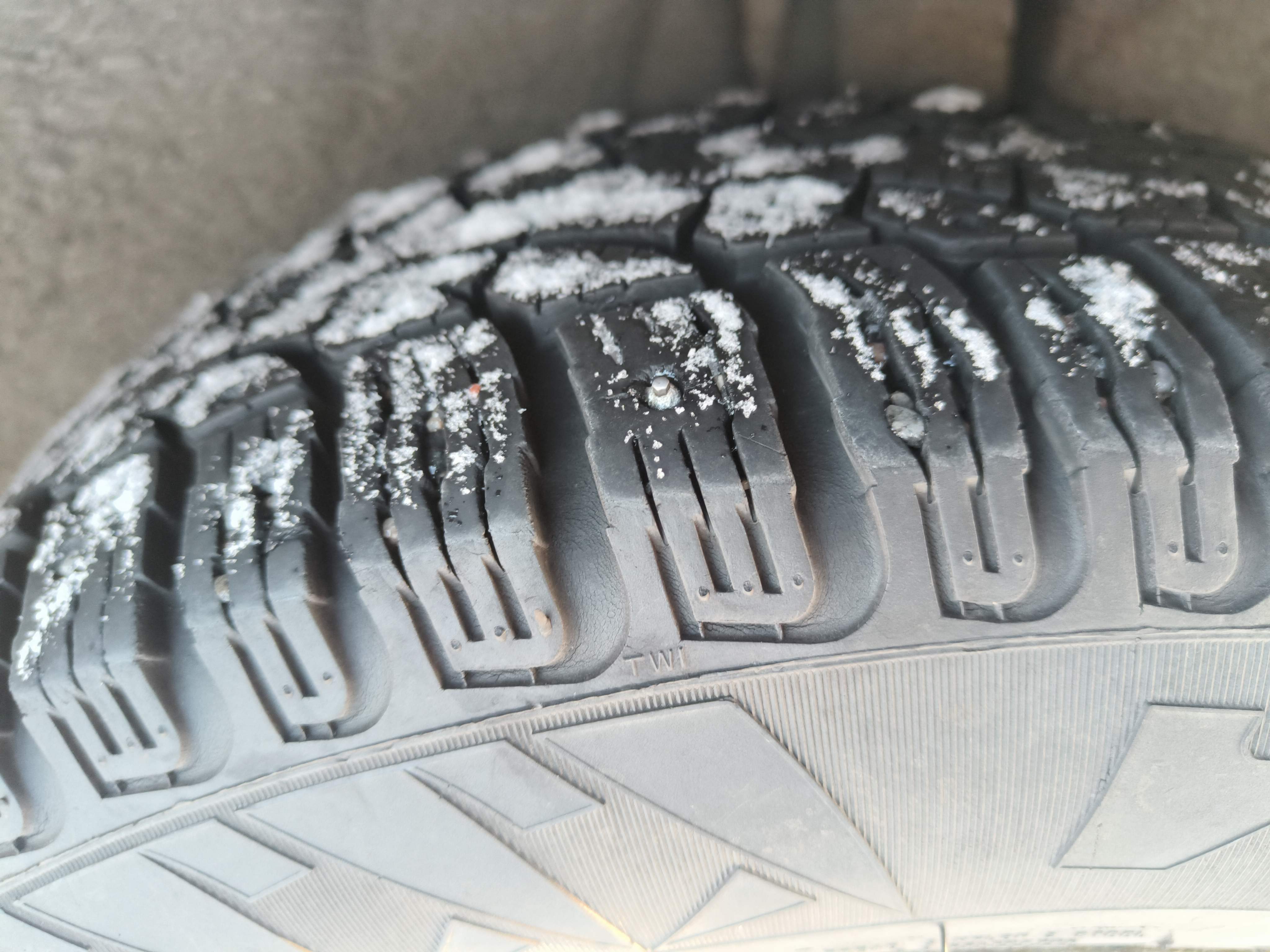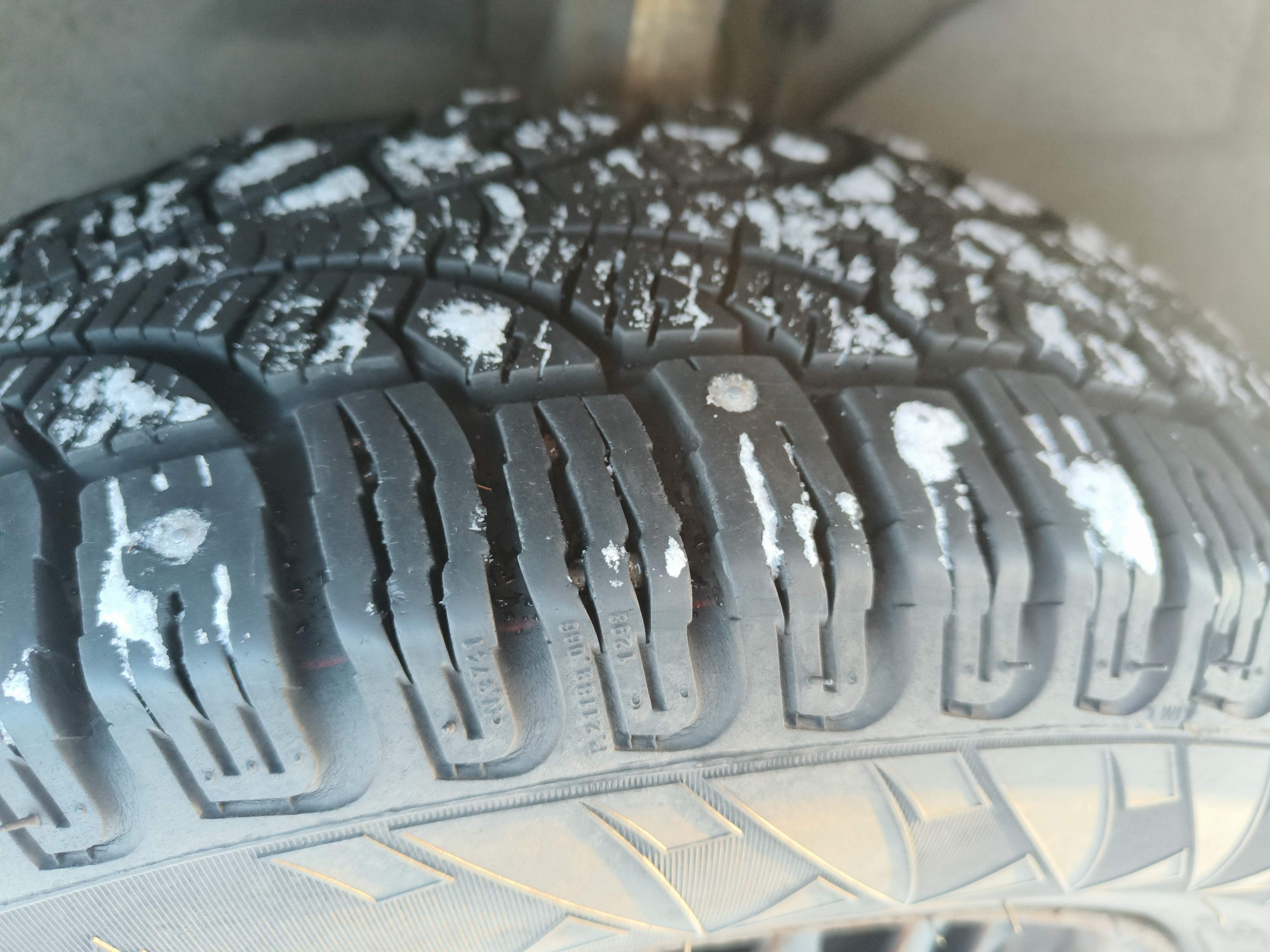 Studded winter tires are mounted on the car, approximately 50-60% of the tread depth remains.