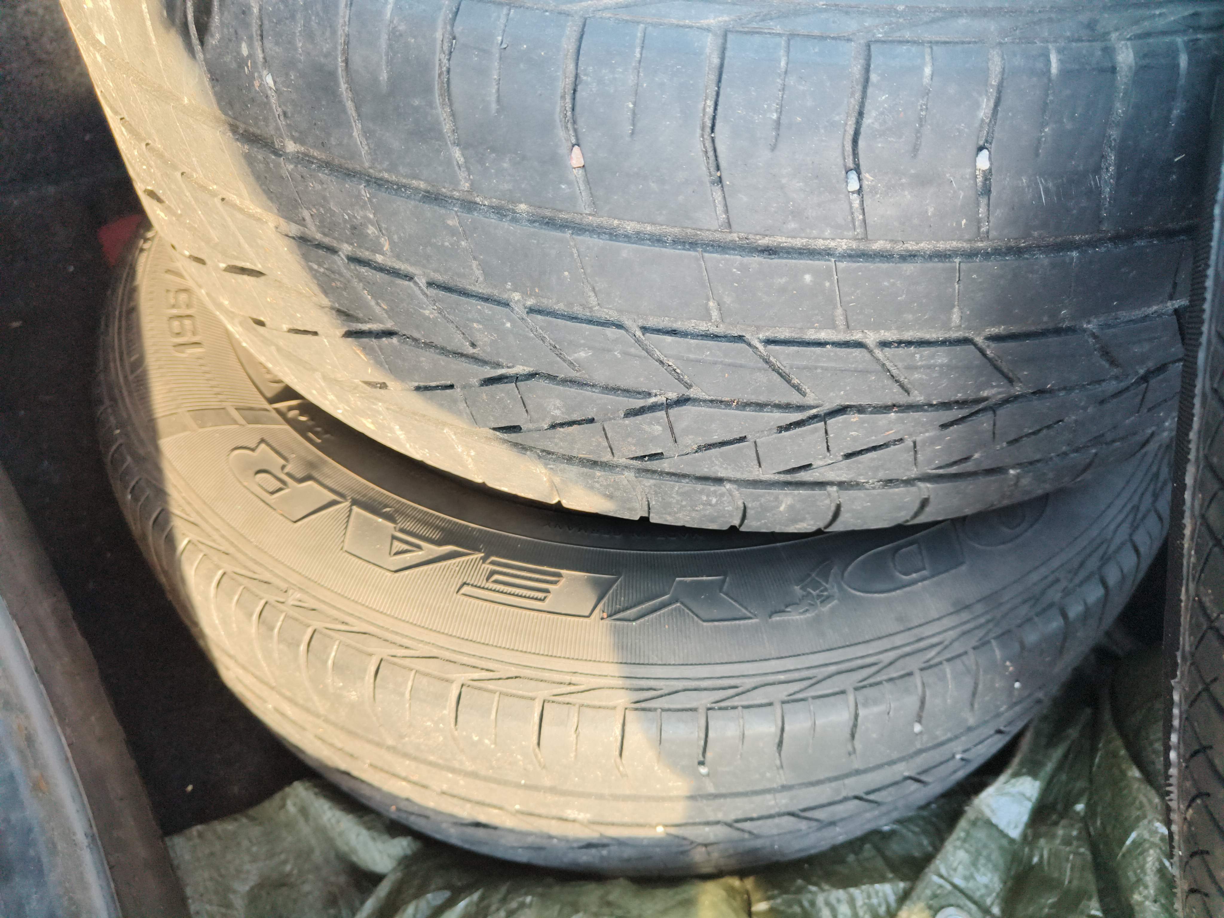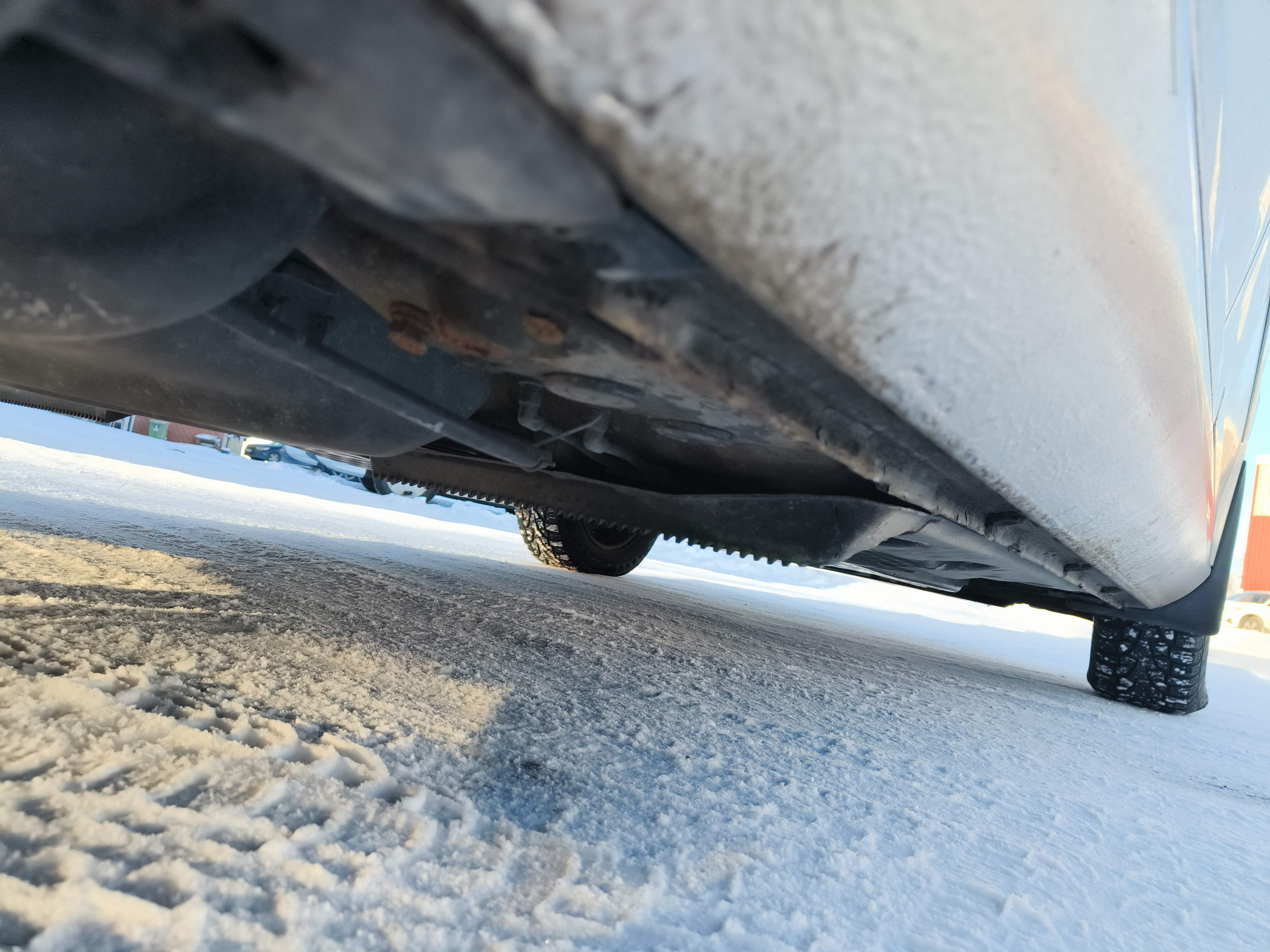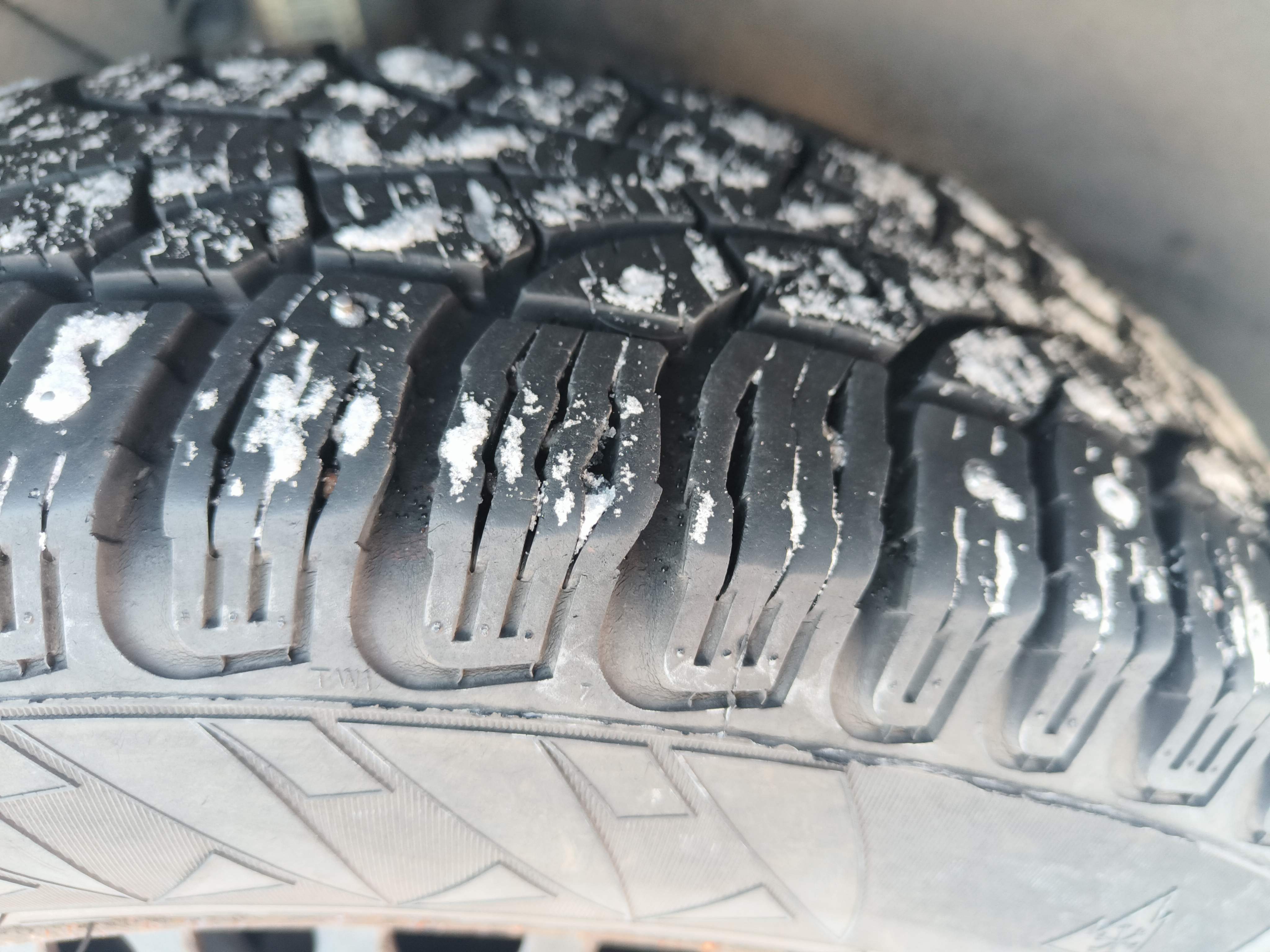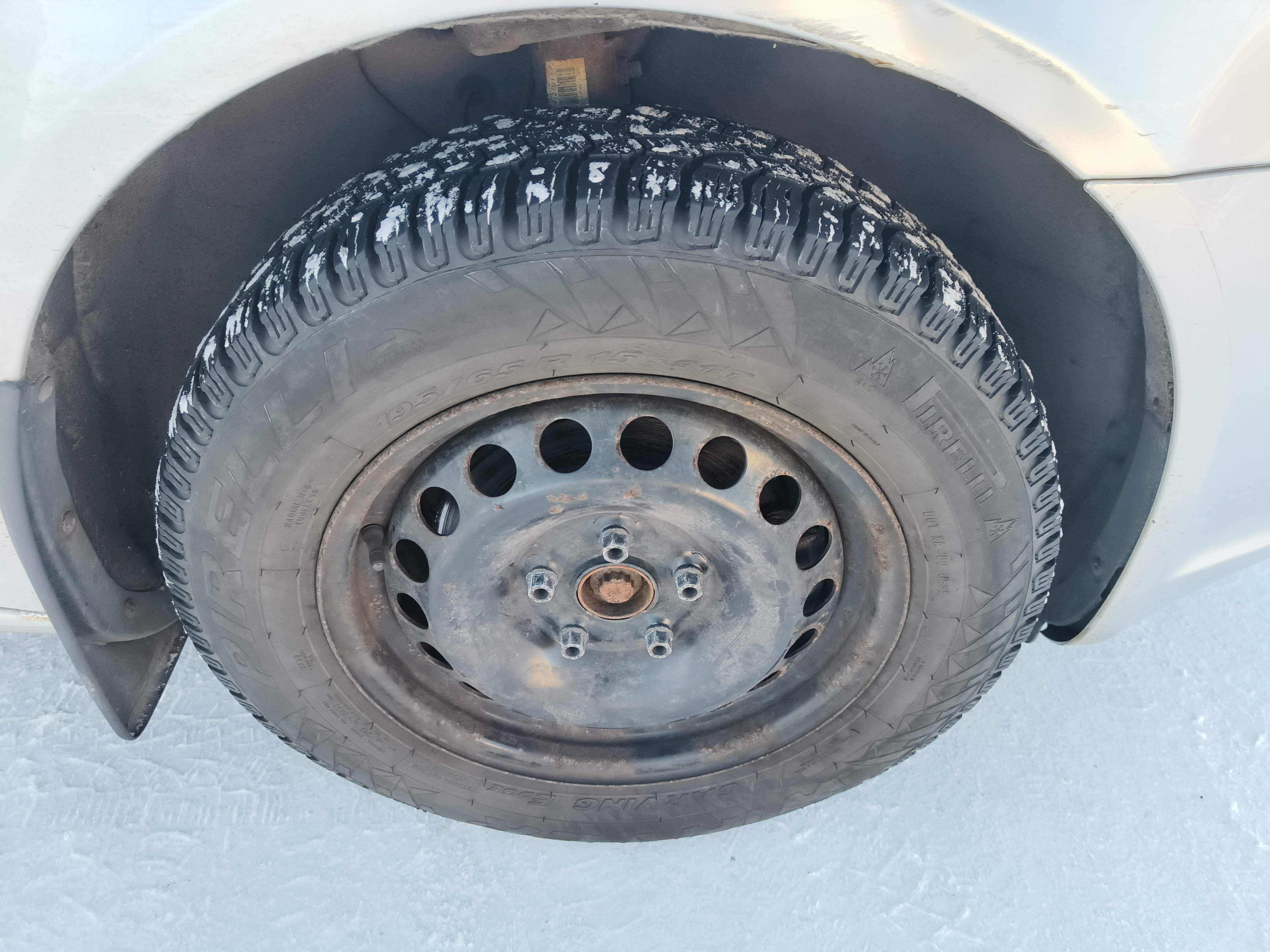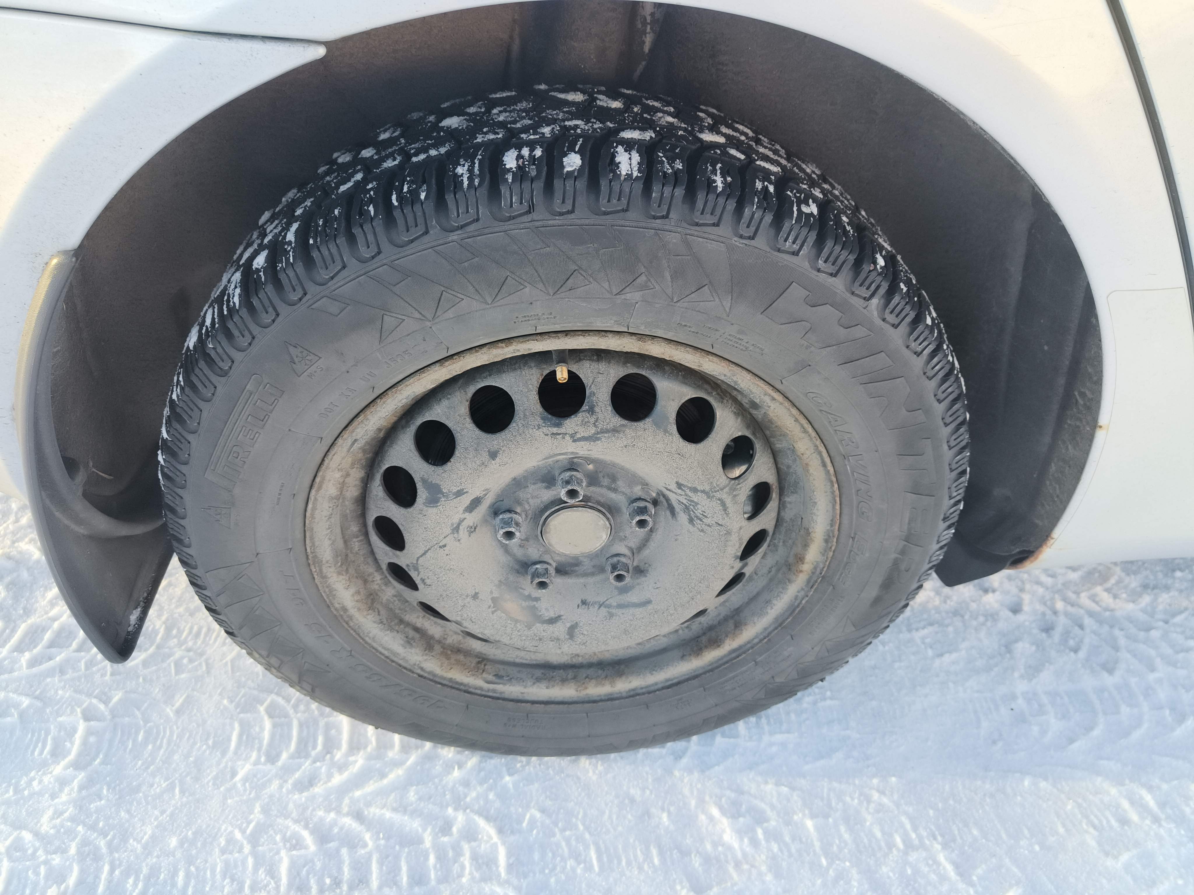Studded winter tires are mounted on the car, approximately 50-60% of the tread depth remains.
