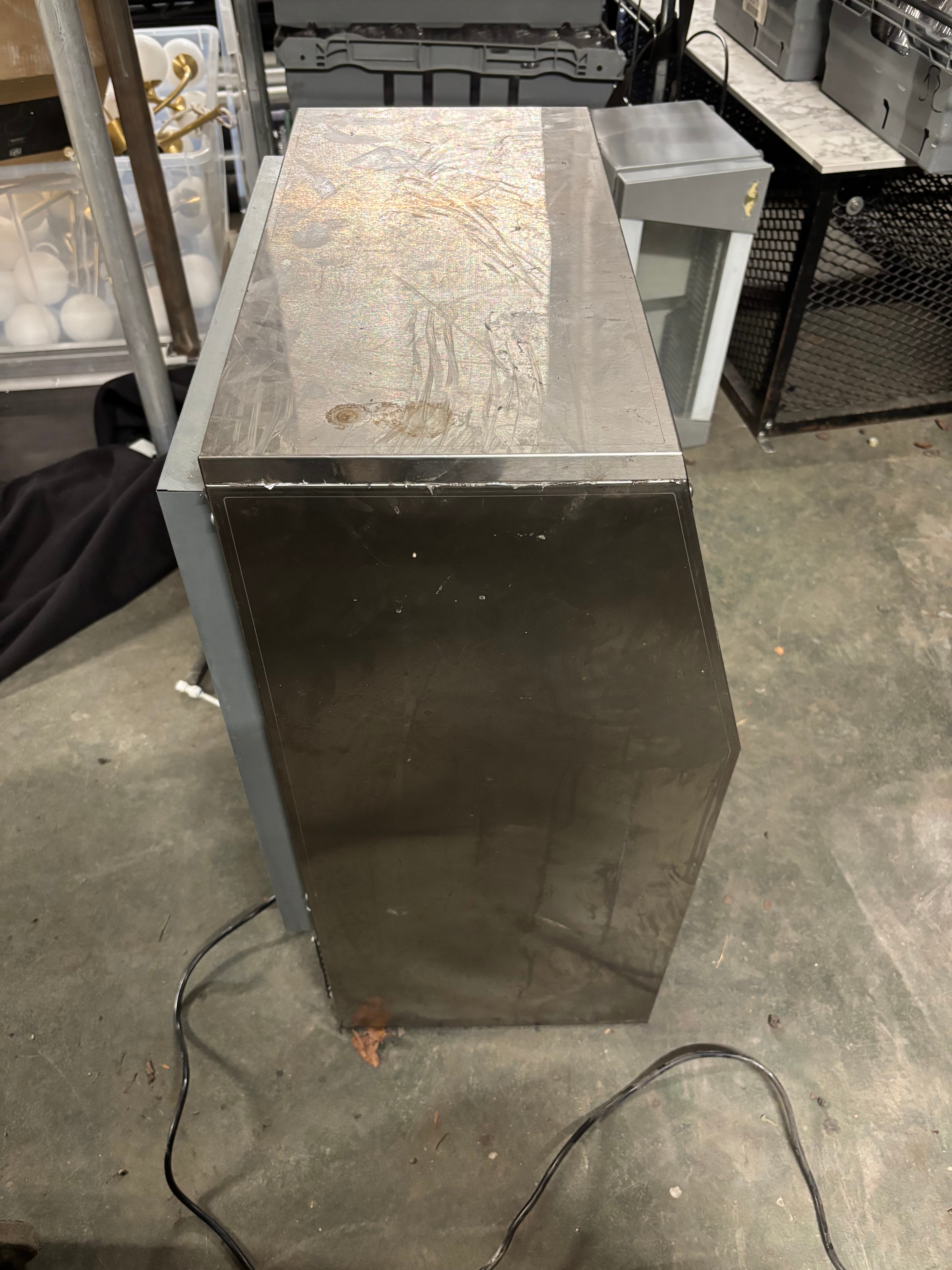 Among the items are ice machine, artificial plant panels, gas heater, stainless steel work table, steel shelf with mesh surface - freestanding, disco ball with motor mount, ice machine, glass, etc.