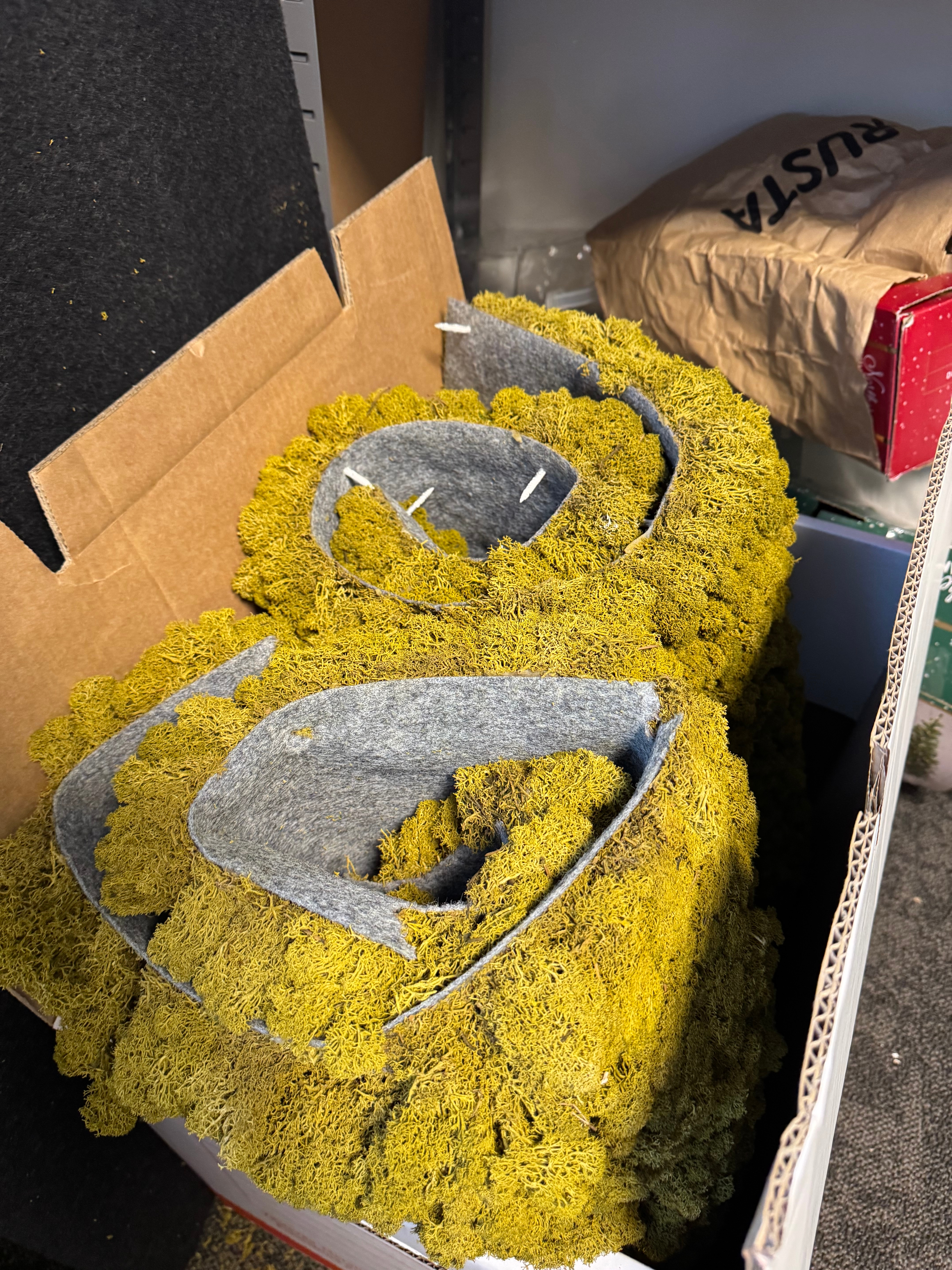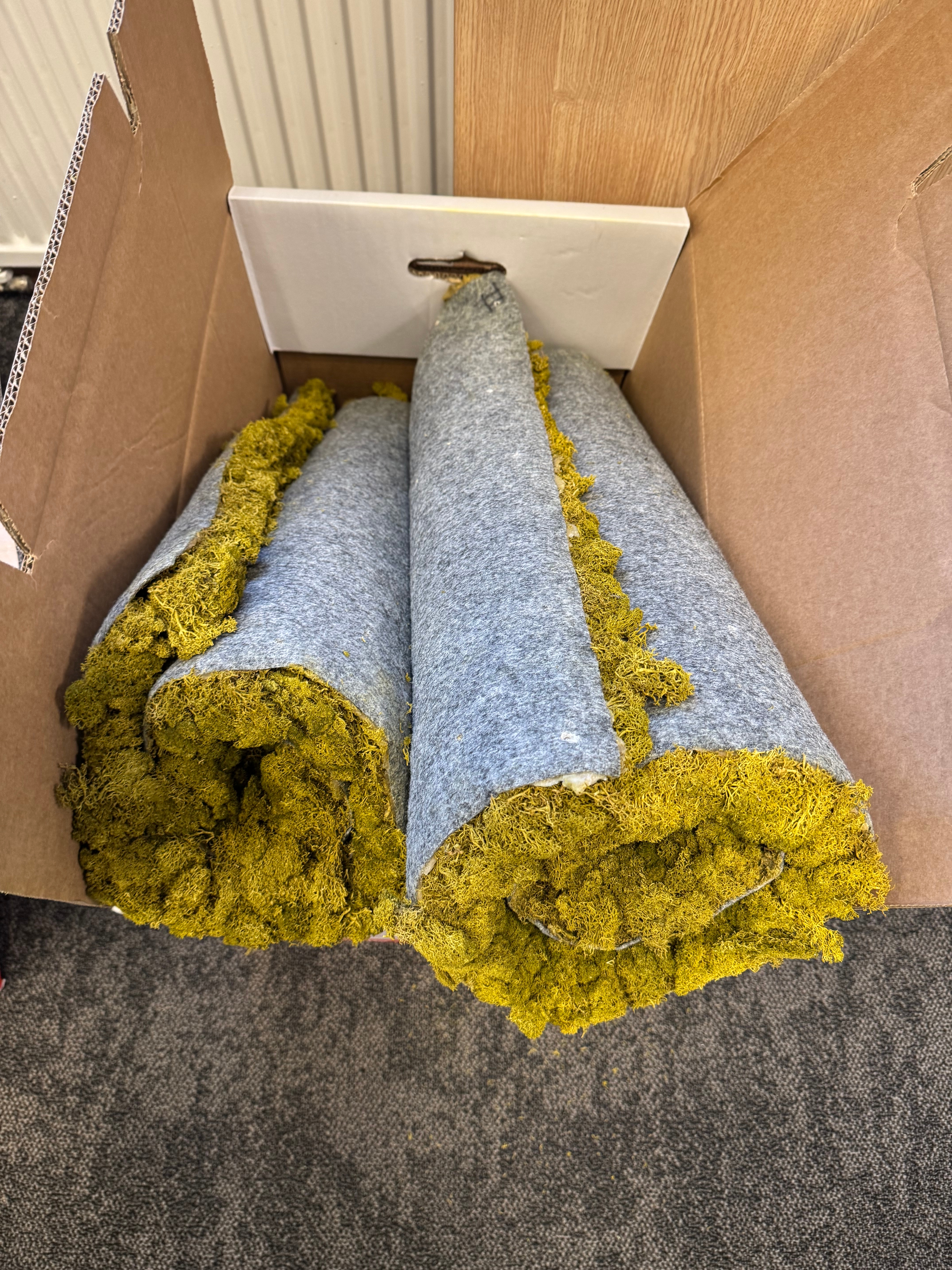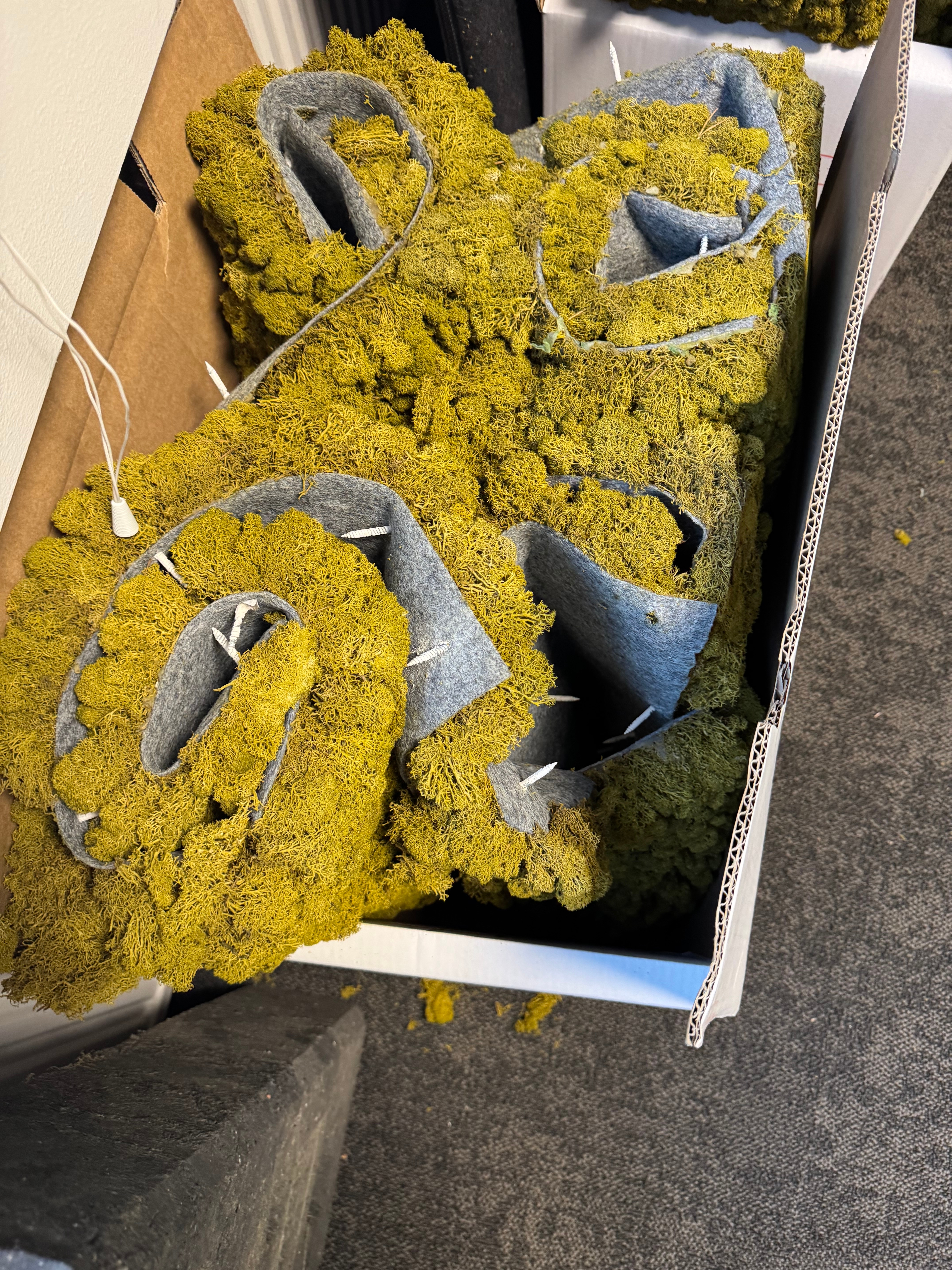 Decorative moss wall consisting of approximately 10 squares of stabilized, dry moss. Stored in cardboard boxes.