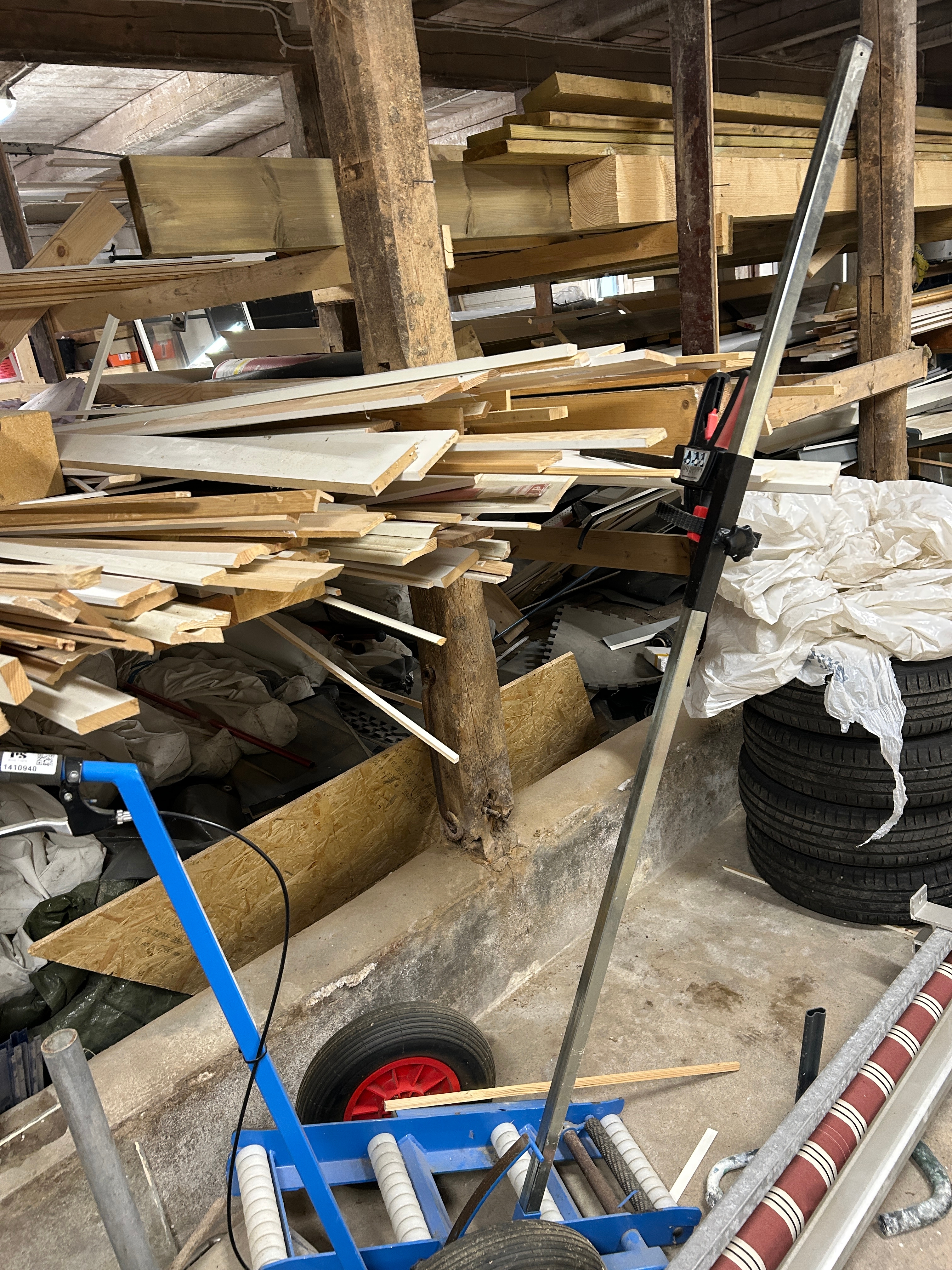 1410932 Lot with hand tools, fastening materials and storage shelves etc.