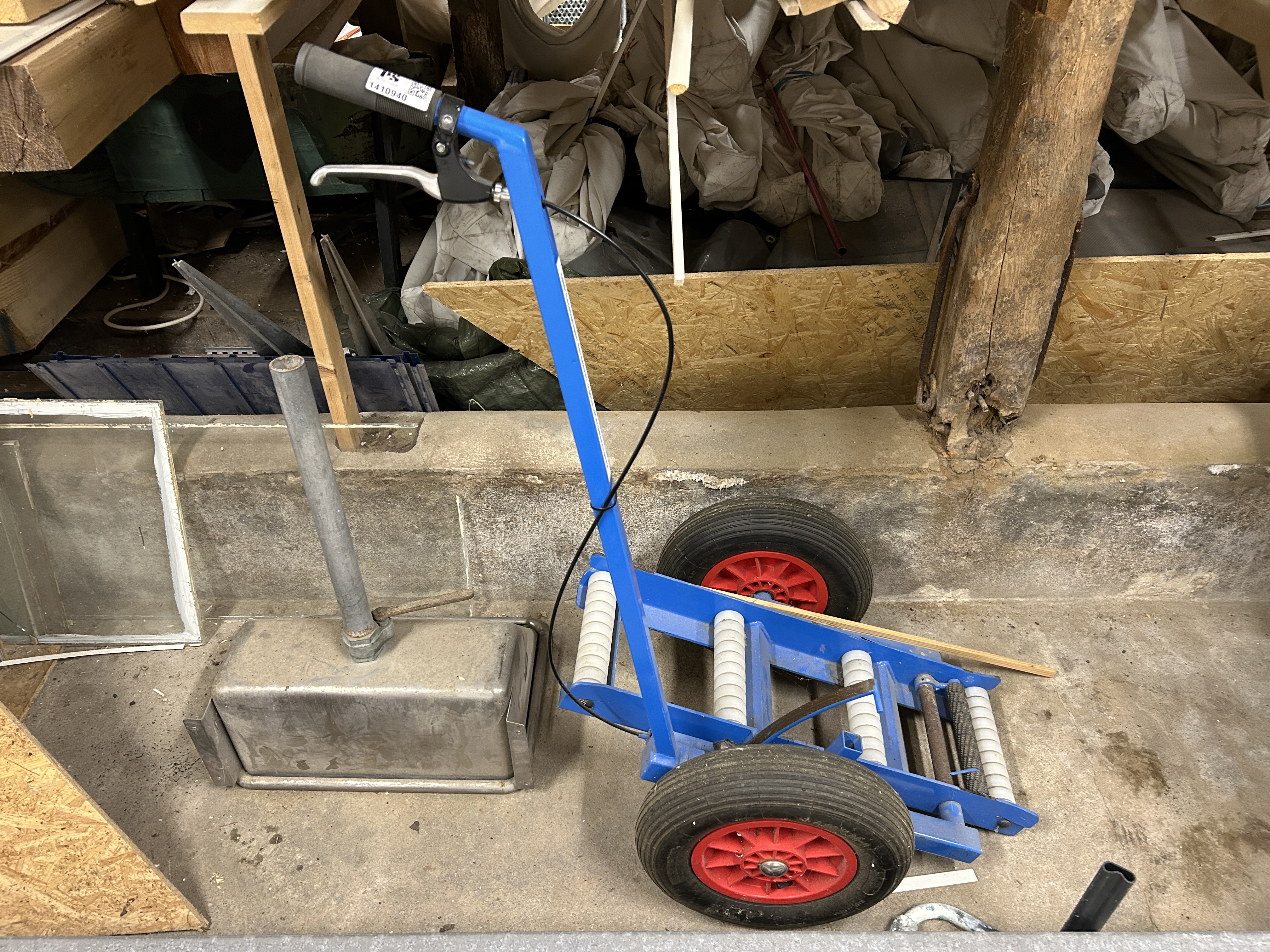 Trolley with handbrake, double wheels and rollers for easy loading/transportation of glass or sheet material
