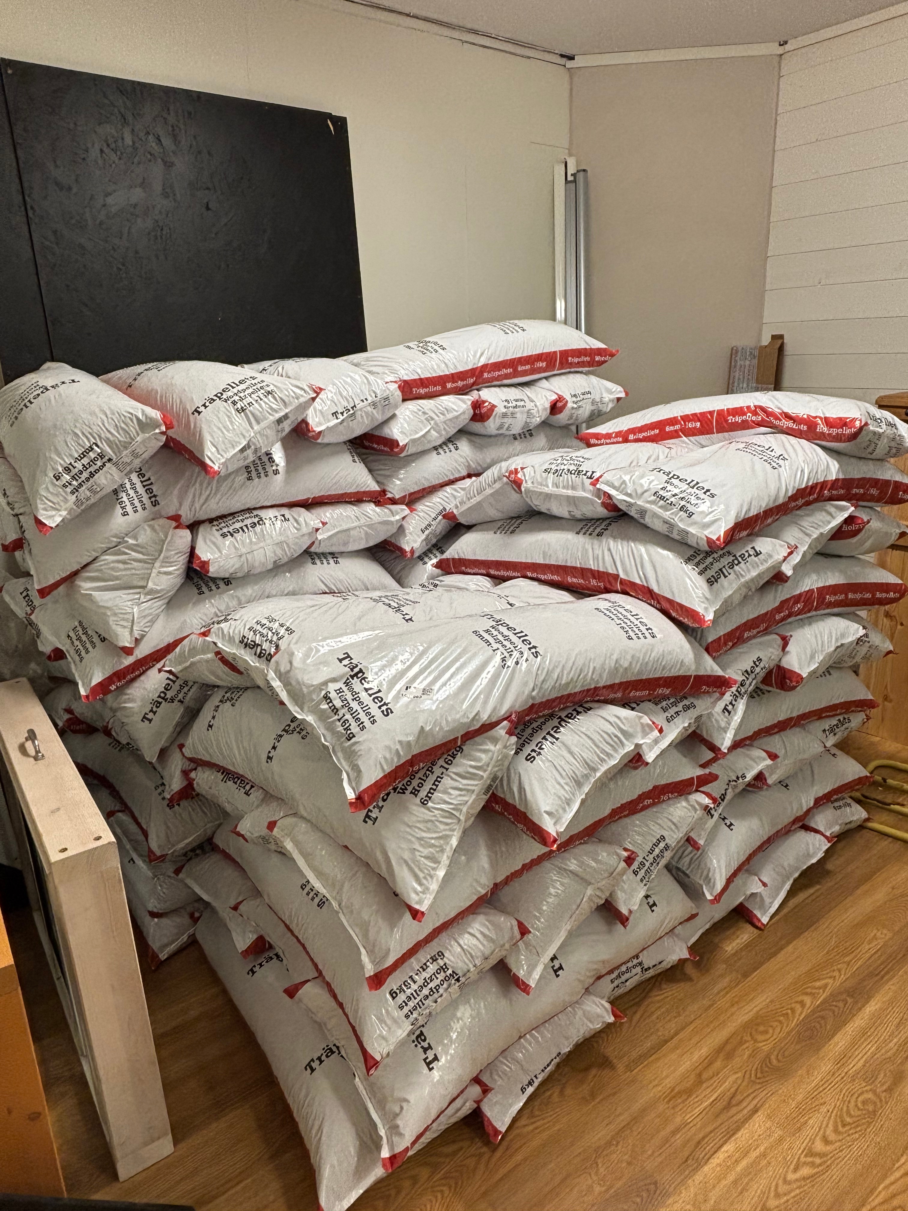 Approximately 95 bags of wood pellets.