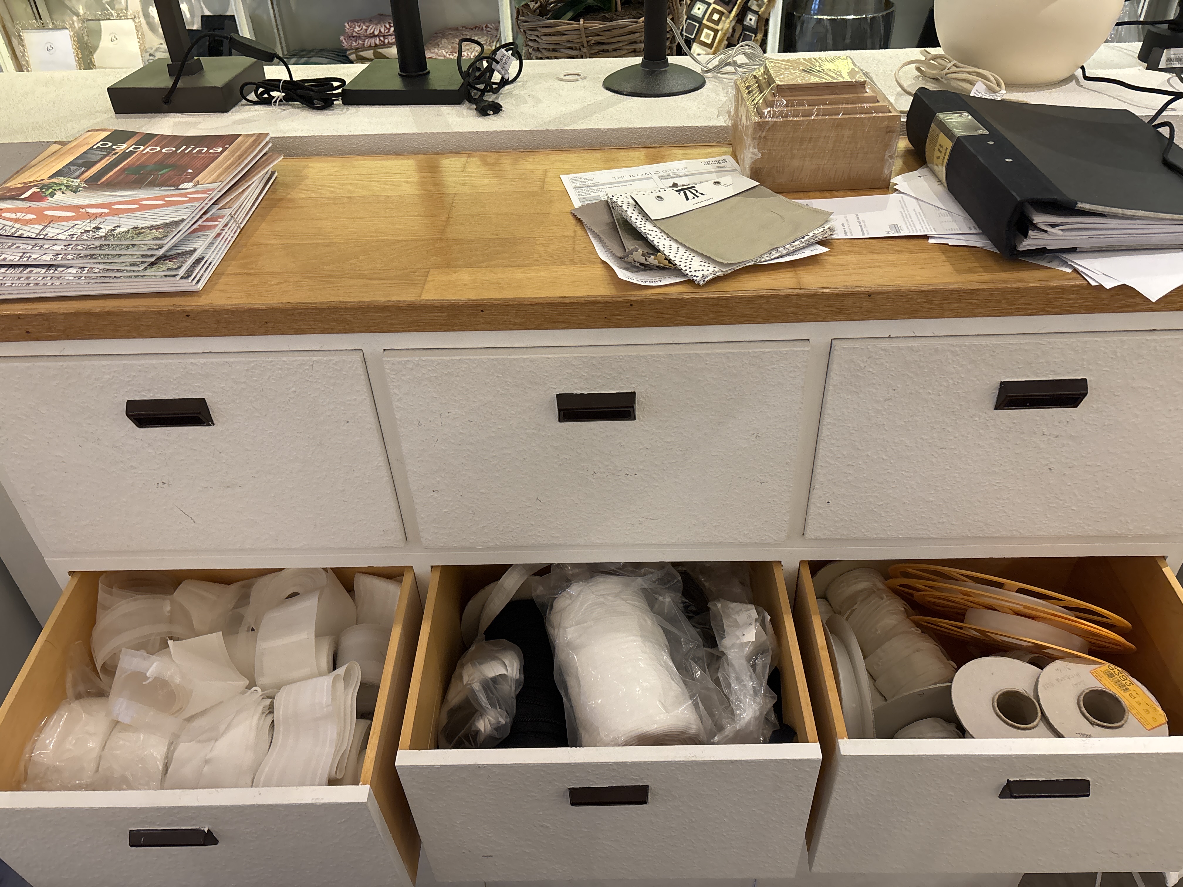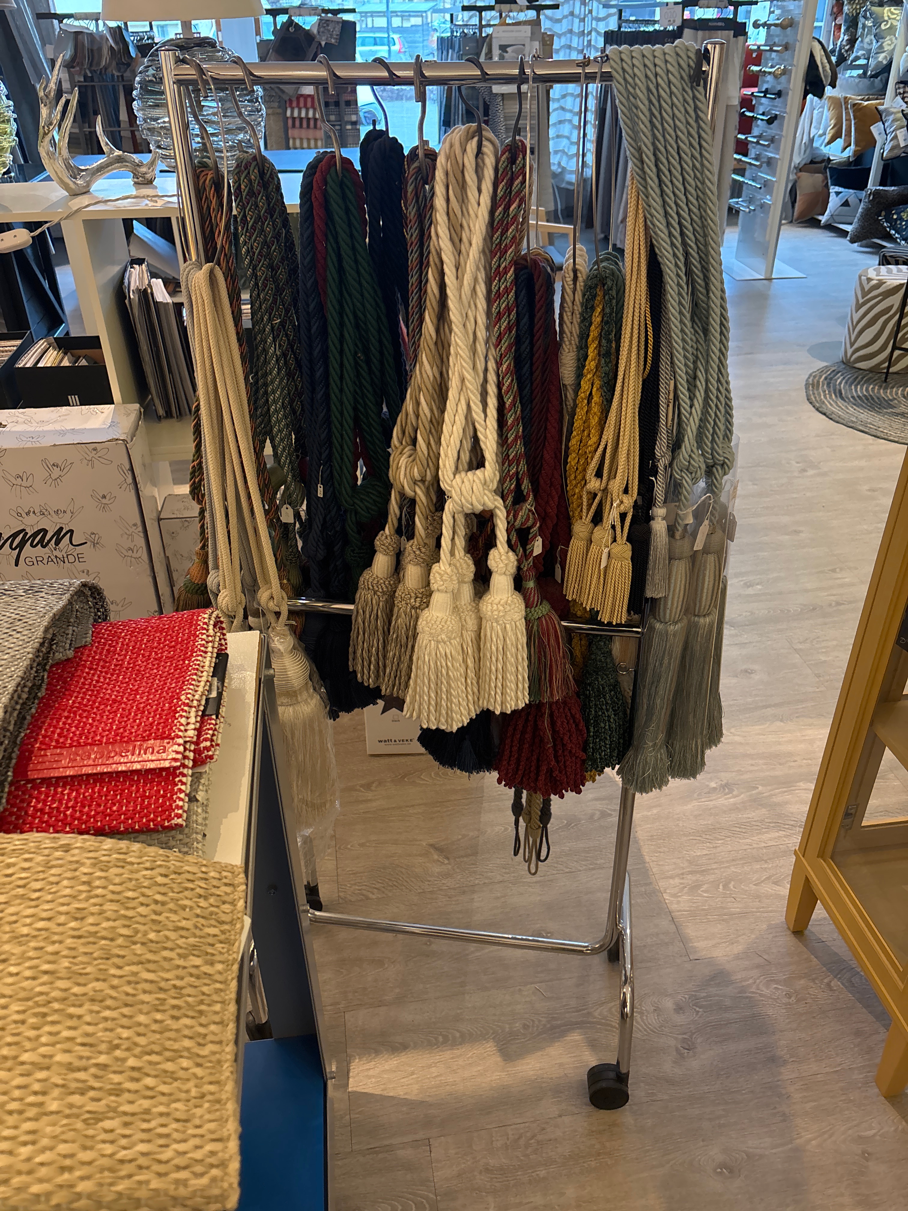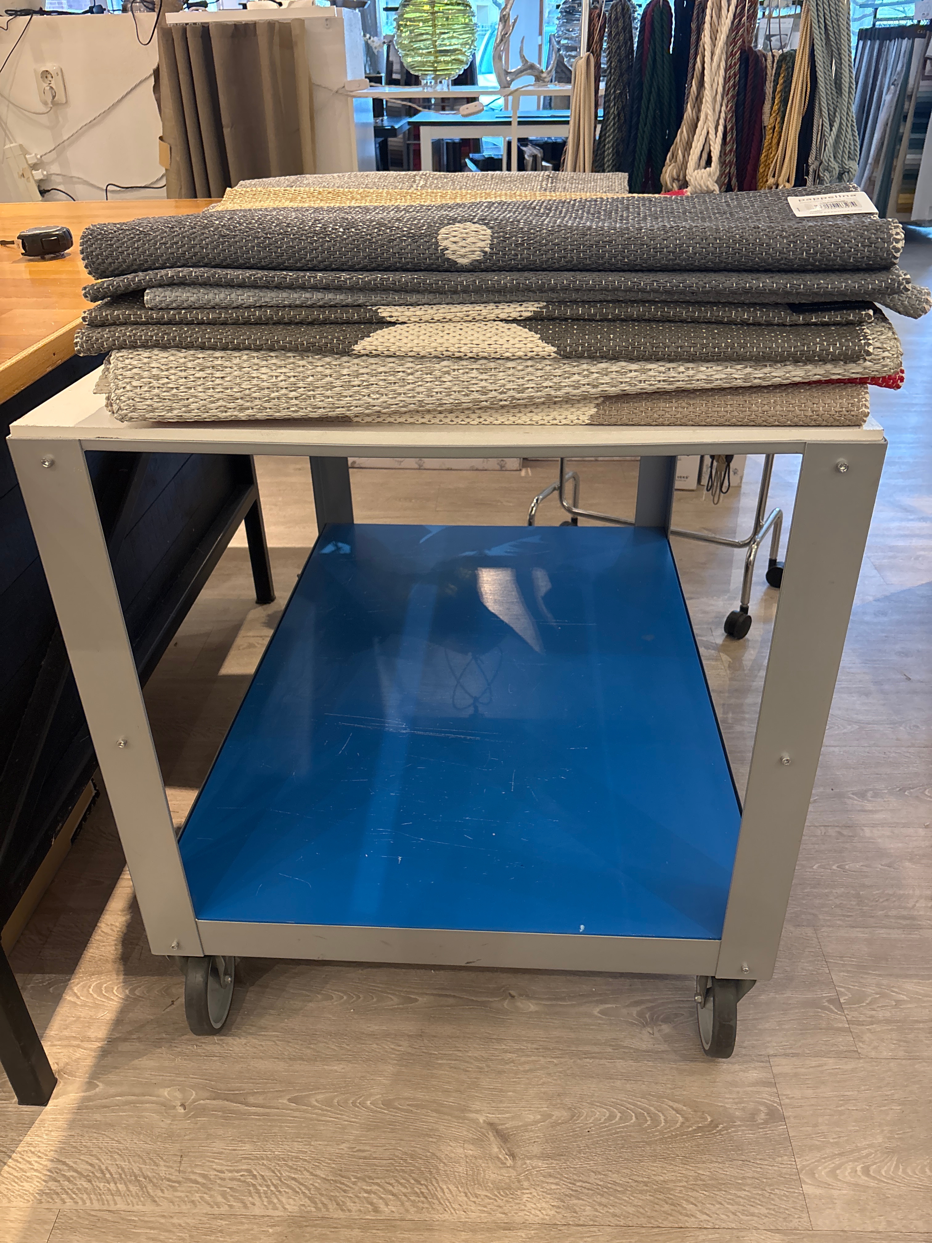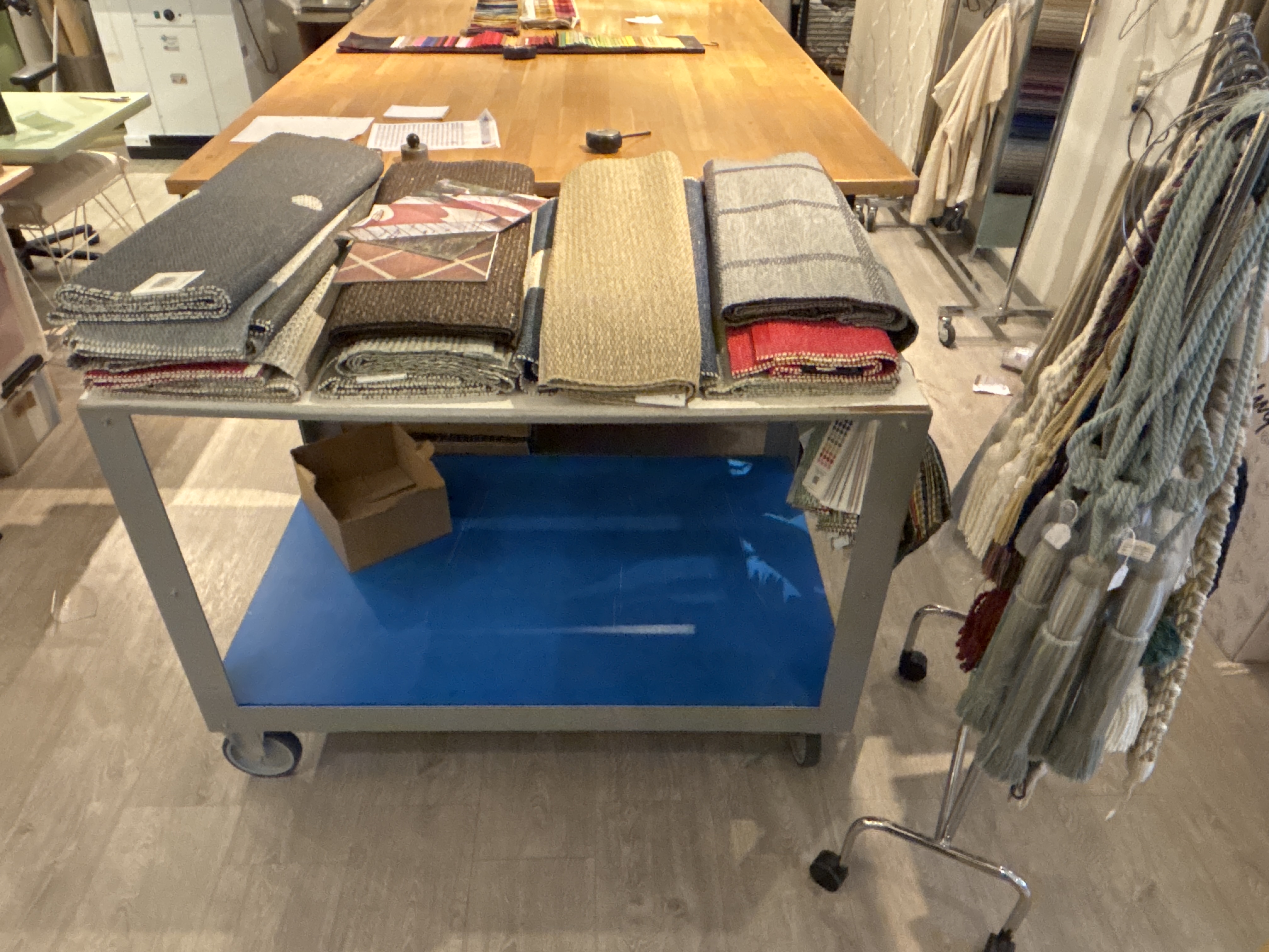 Rolling table, rolling stand and sideboard including textiles.