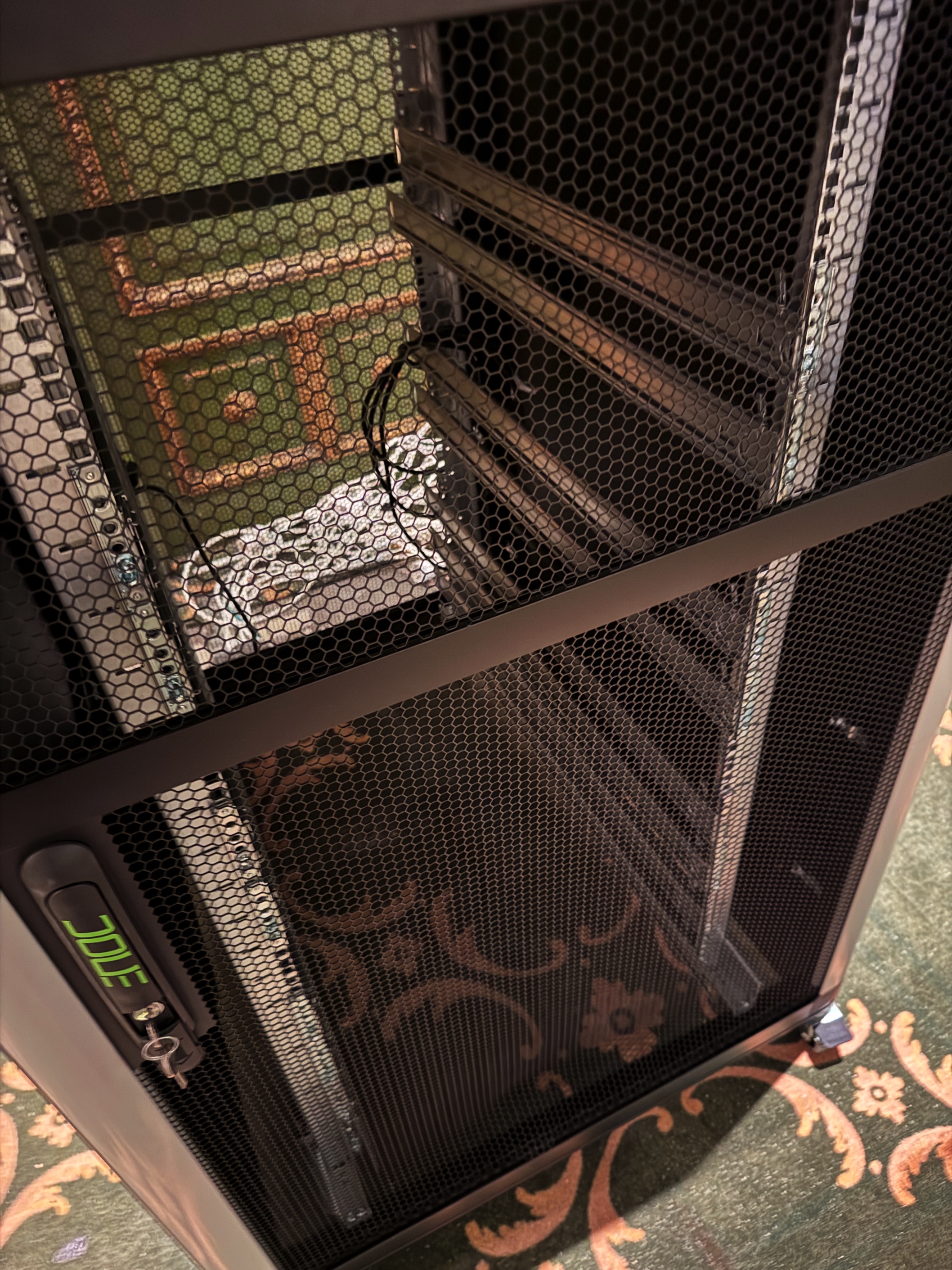 Freestanding server rack with mesh sides and doors, mounted on wheels for easy movement.