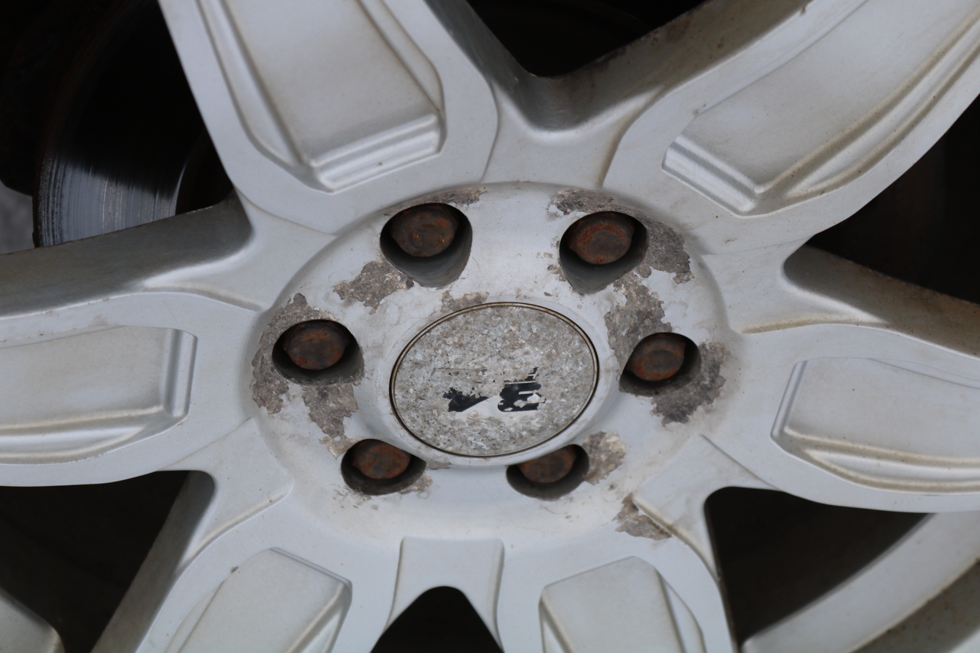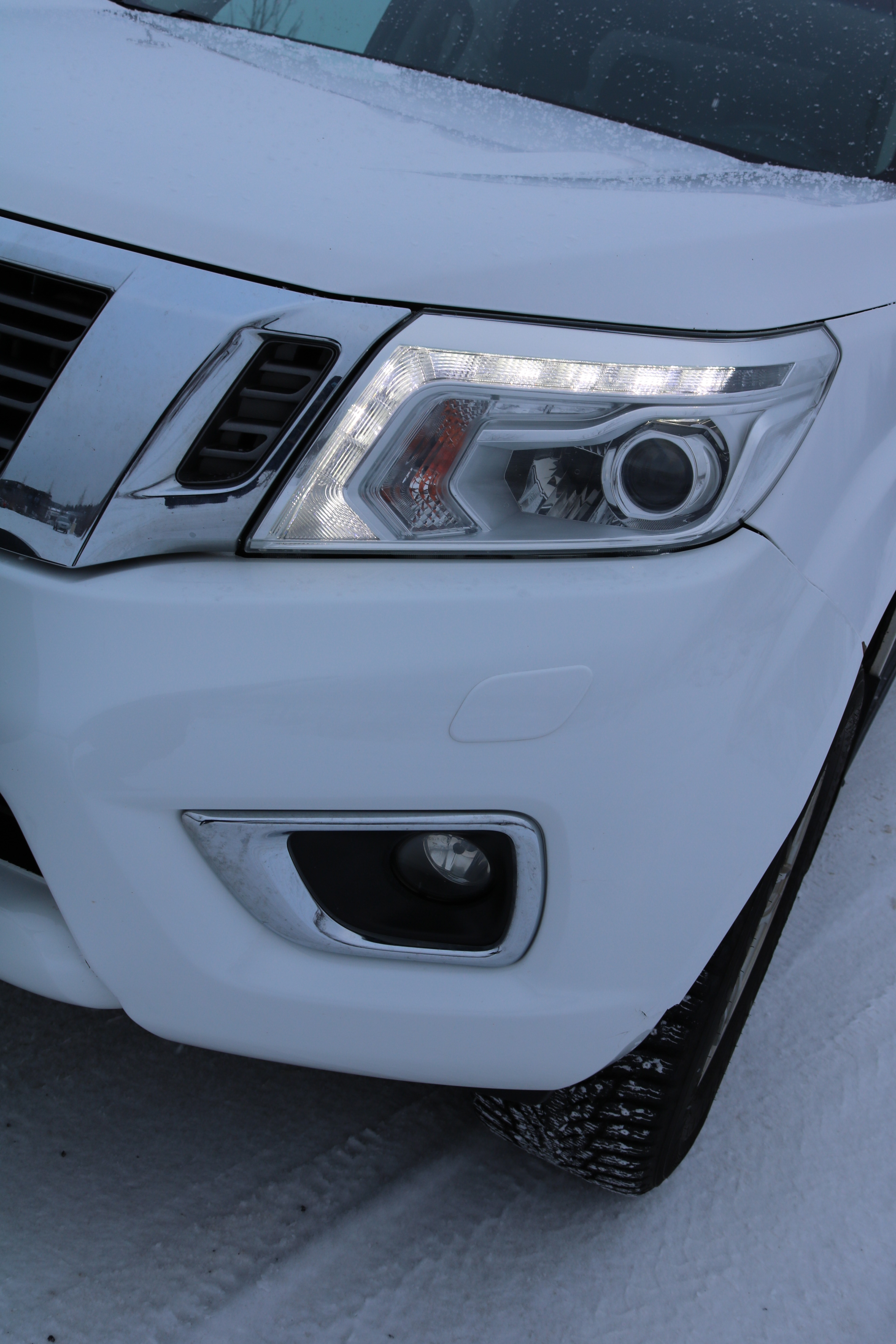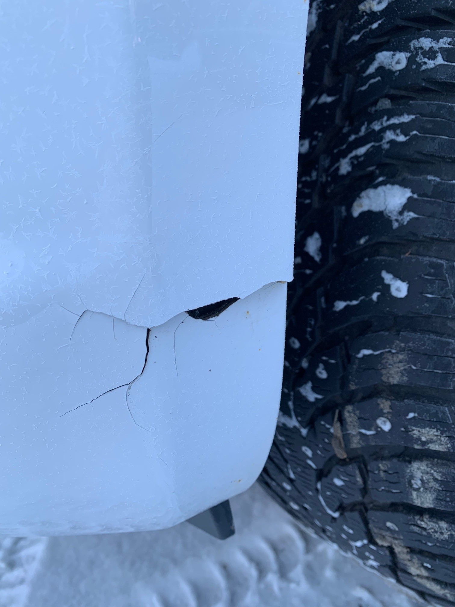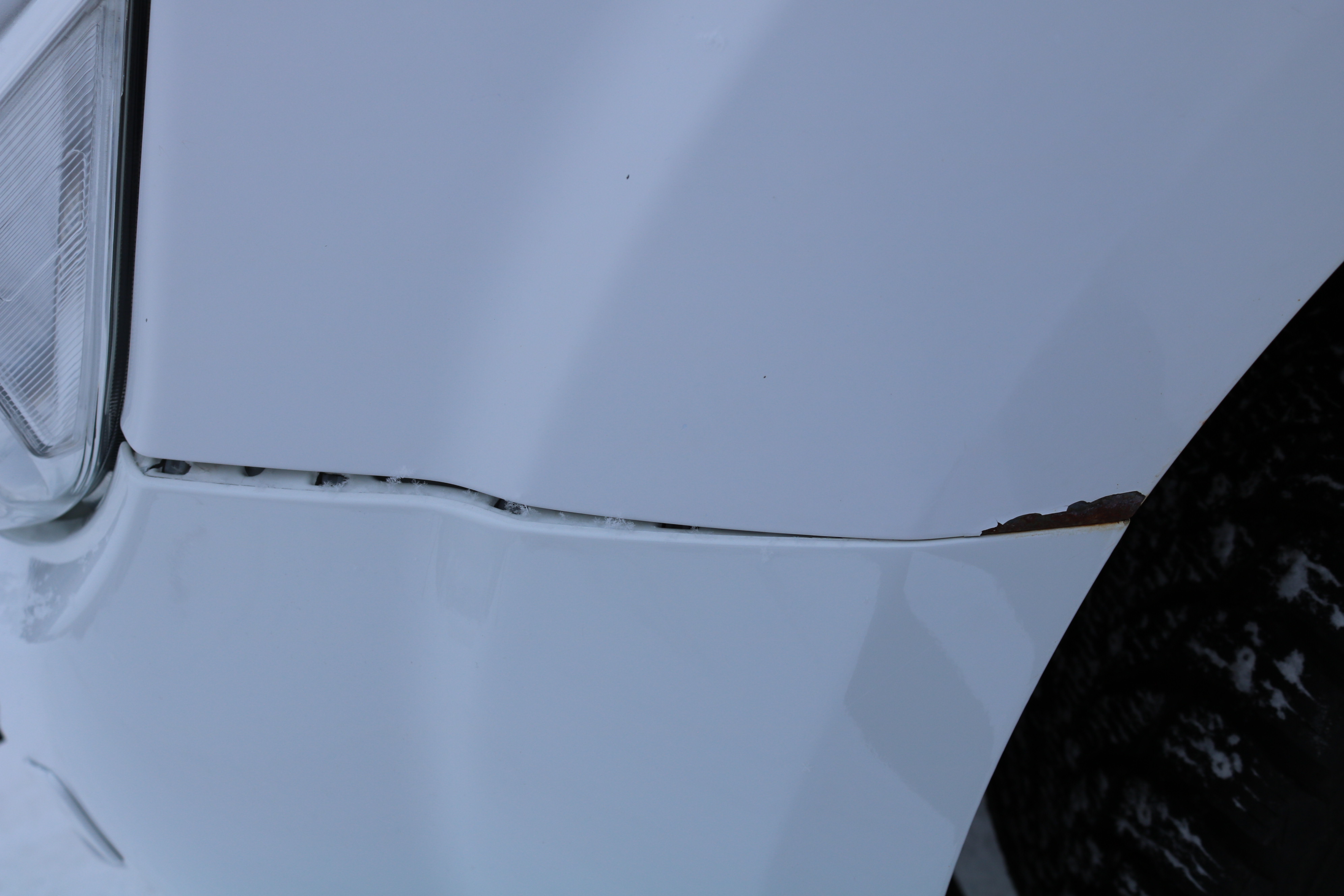 There are scratches, stone chips, paint chips, minor dents, surface rust/corrosion and a crack in the plastic/front left bumper.