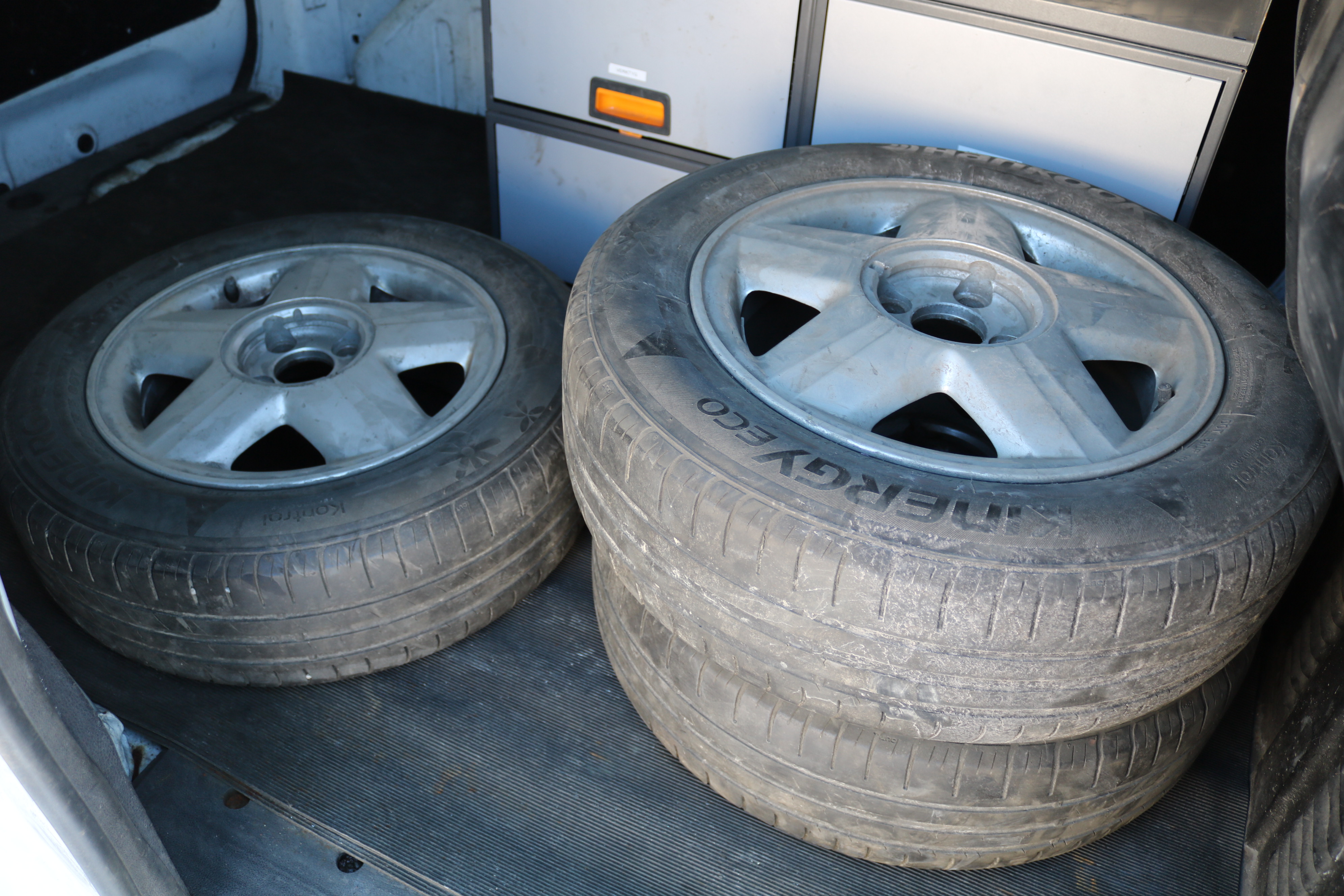 NOTE: Includes 3 summer tires with aluminum rims. One tire/rim is missing. Worn.