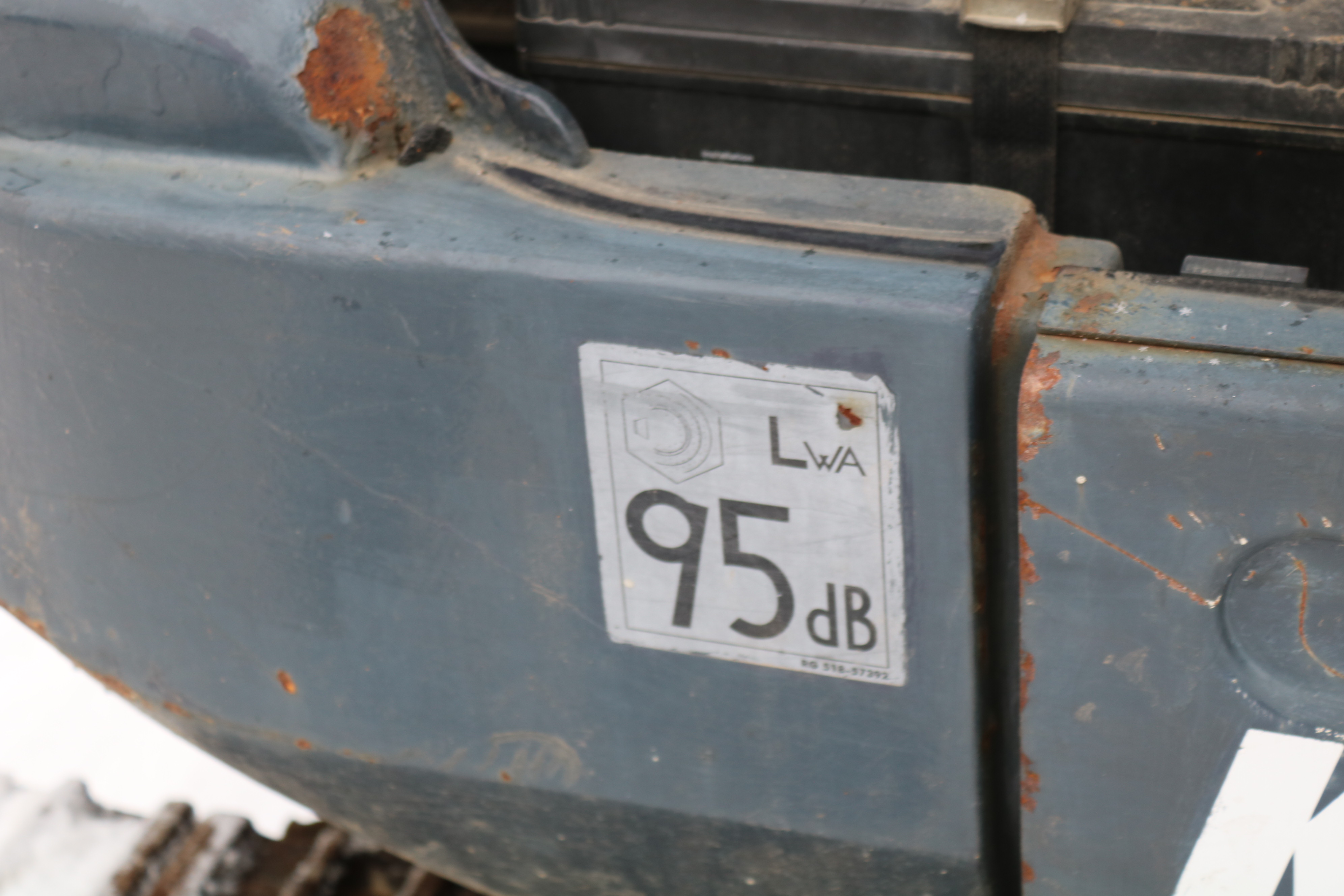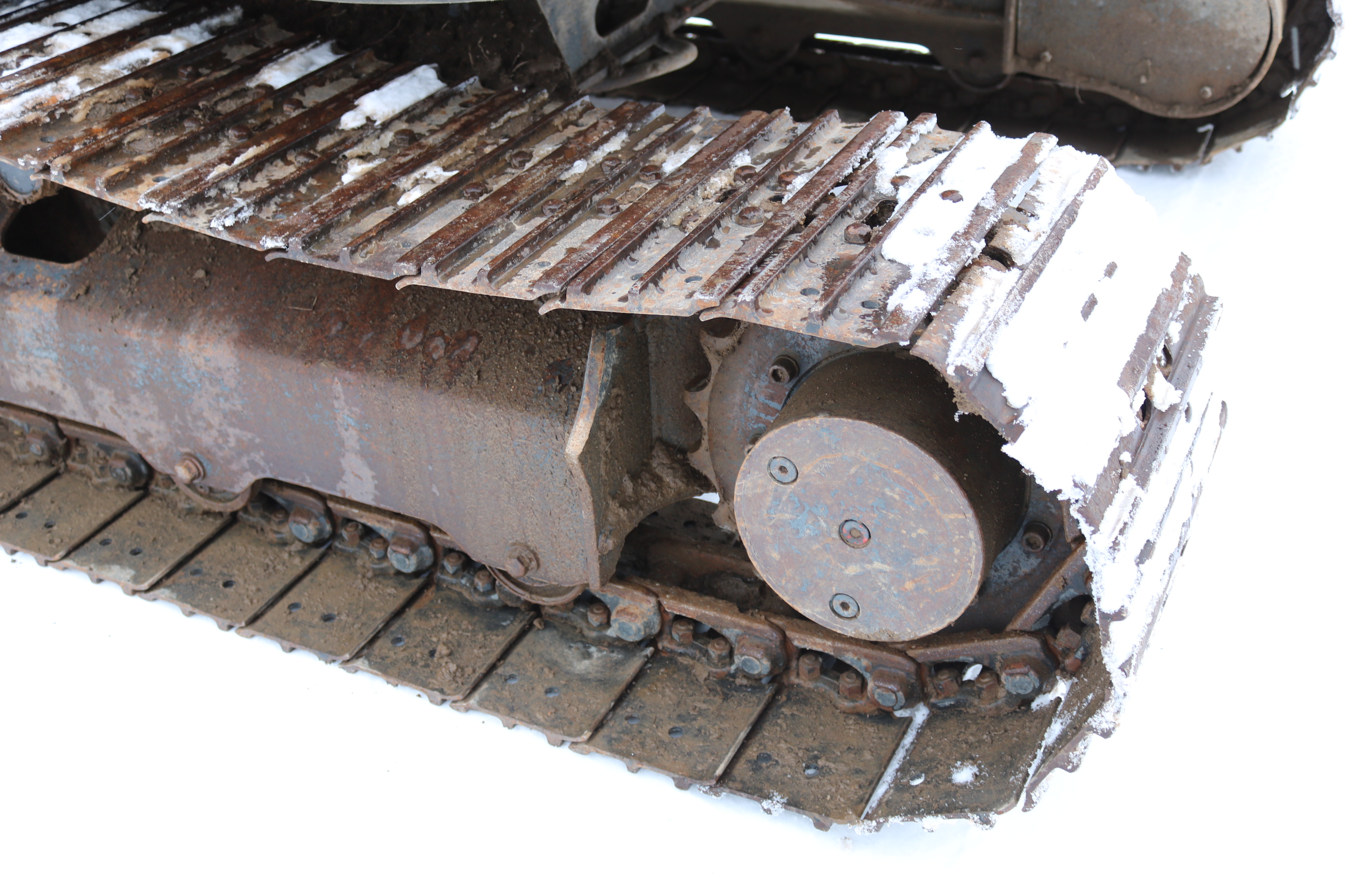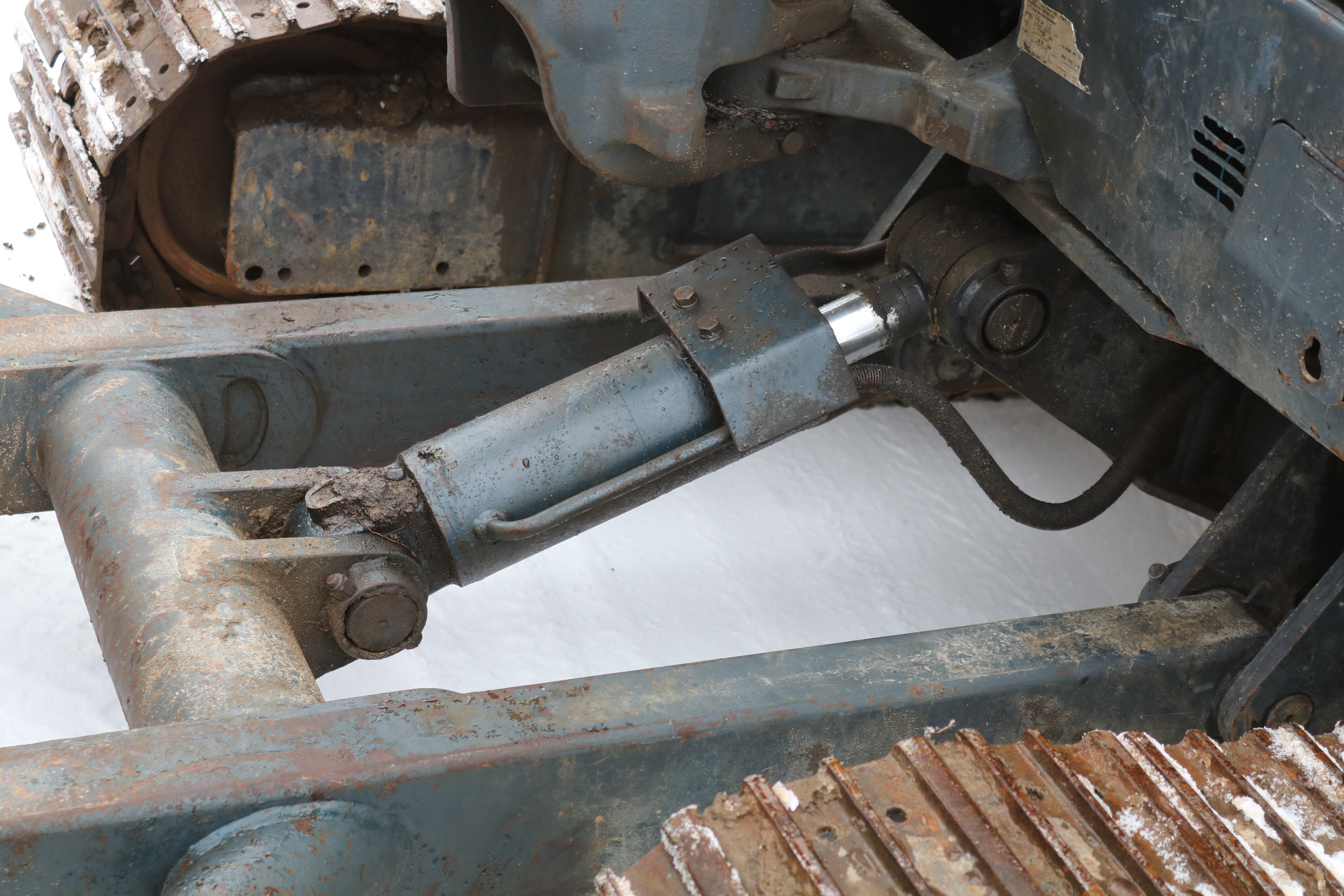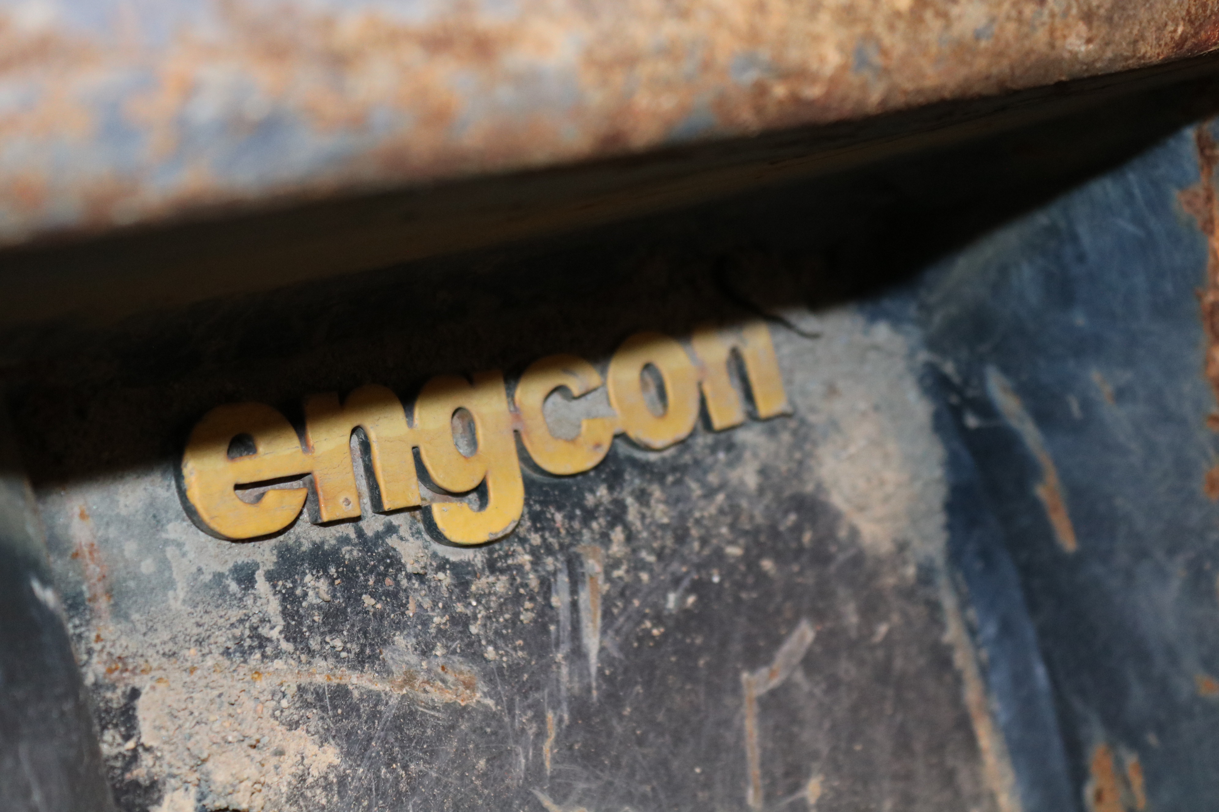 The excavator has its damage and wear and is dirty but starts and runs.
