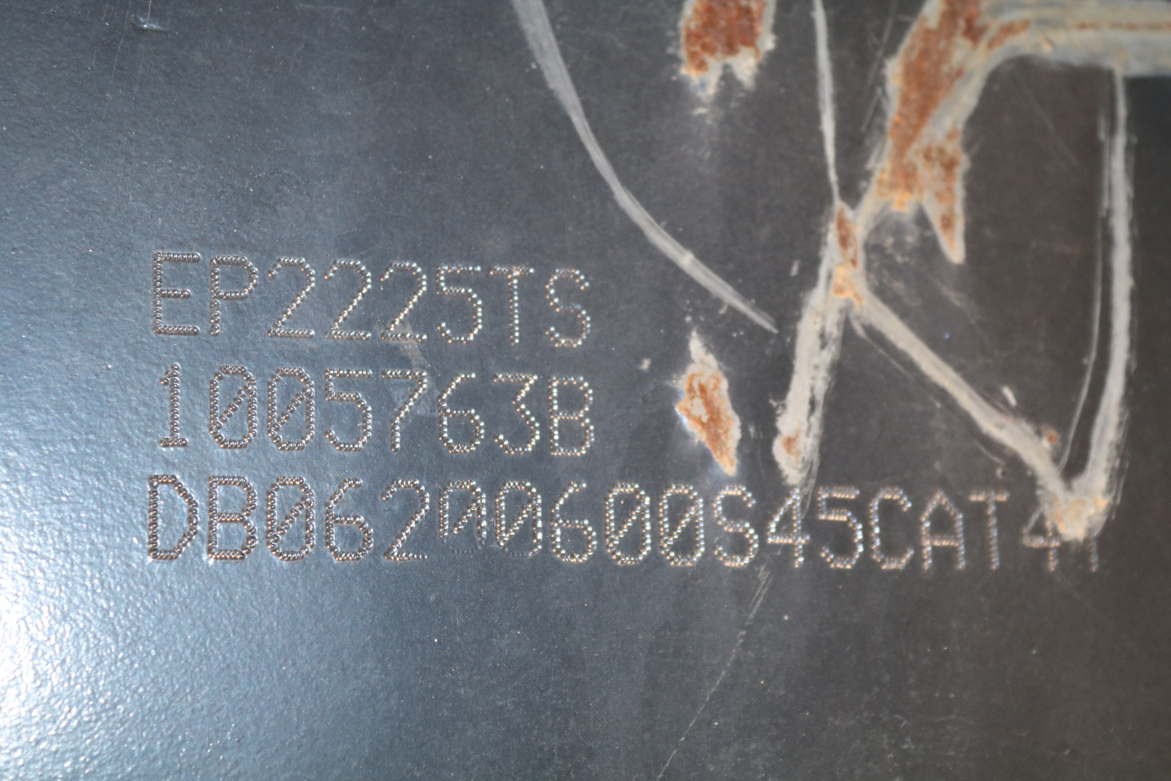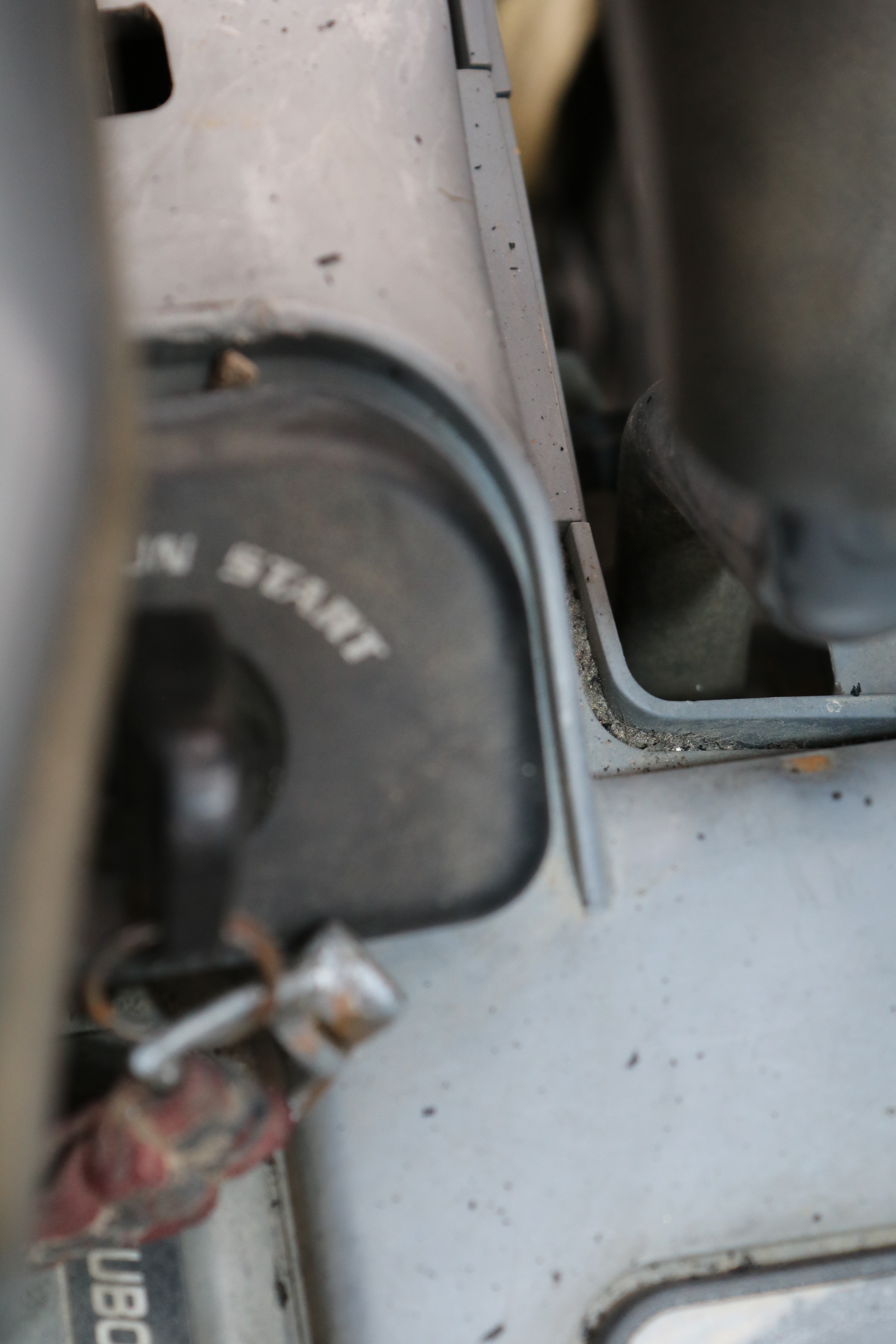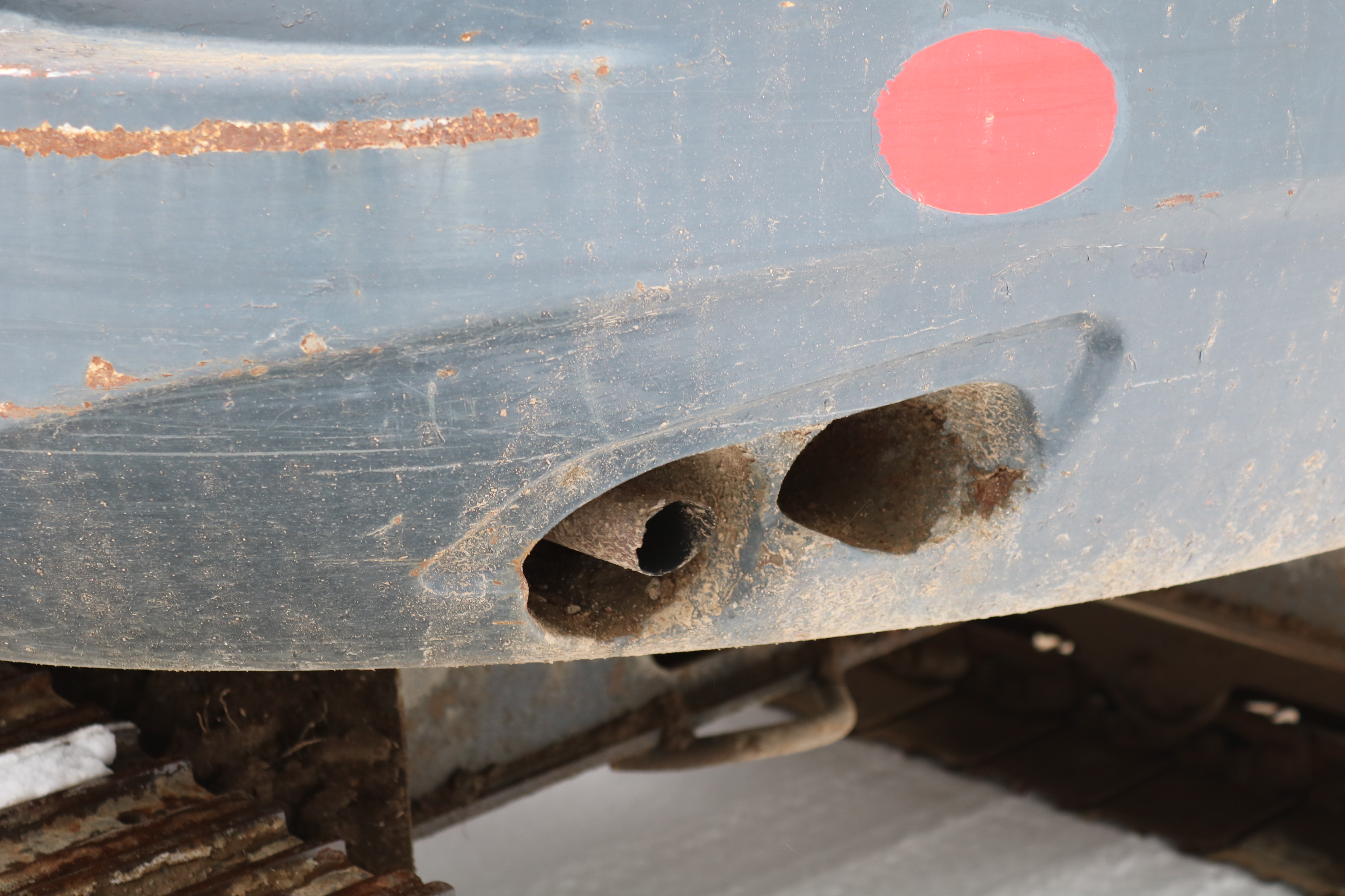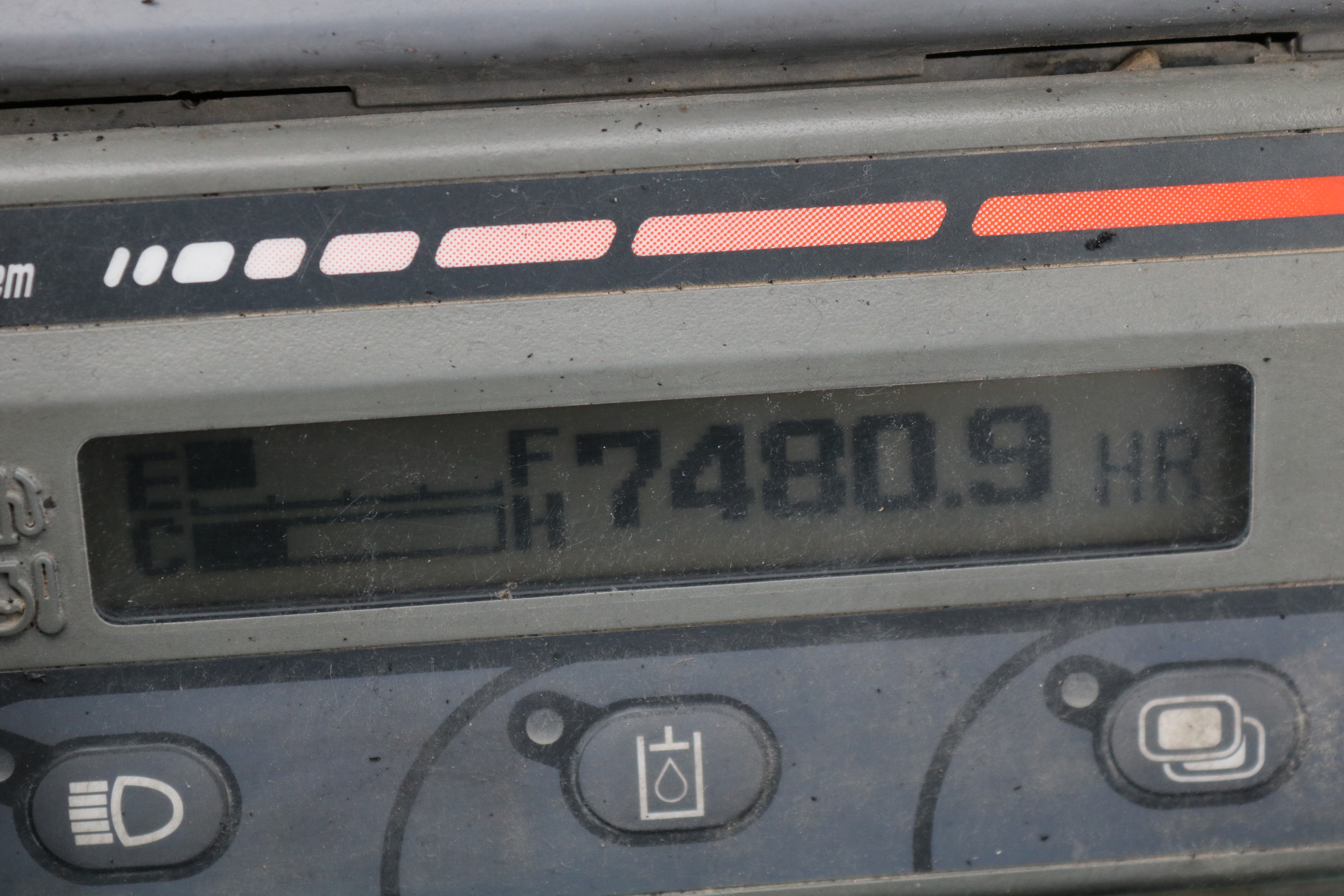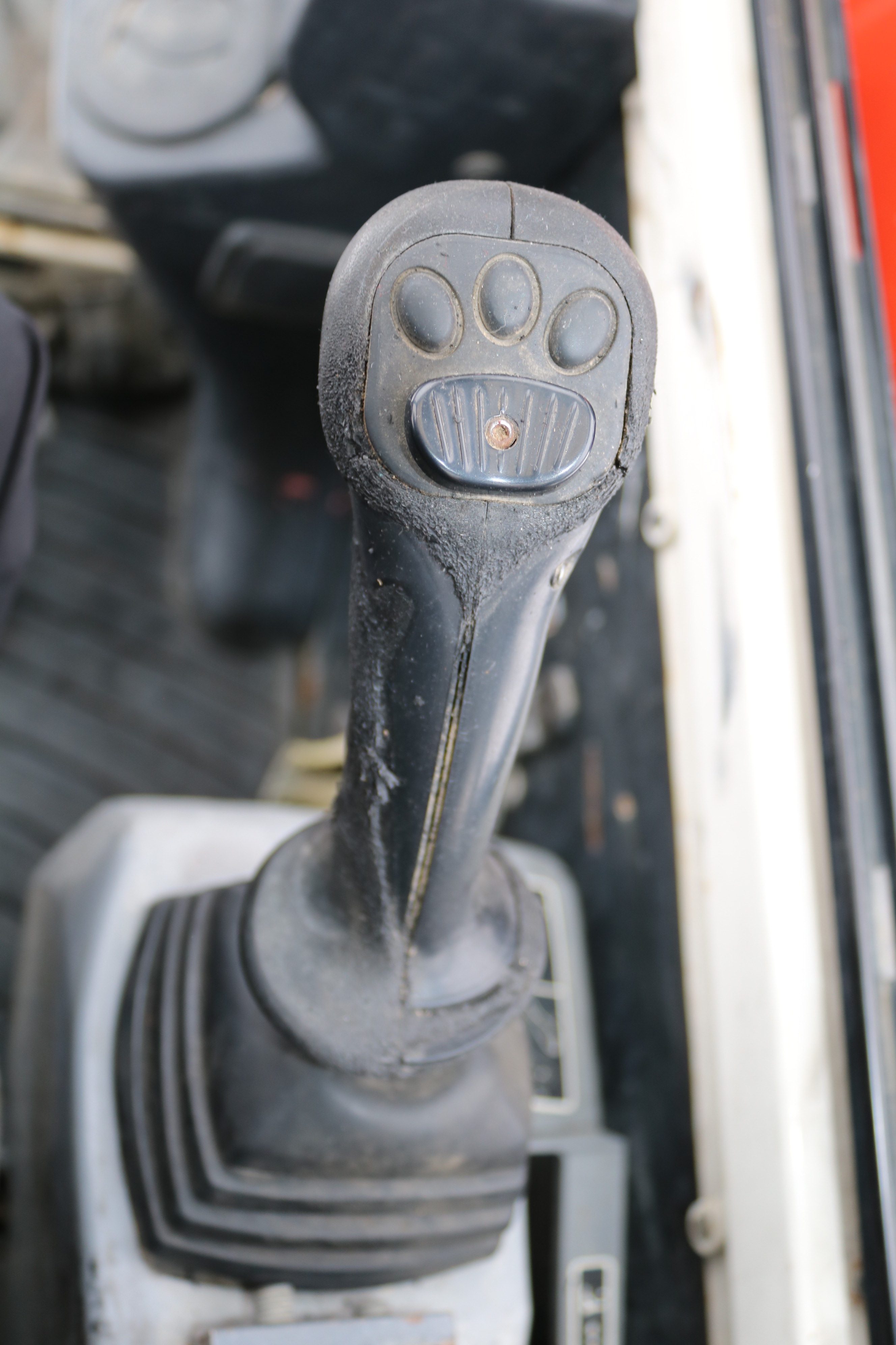 The excavator has its damage and wear and is dirty but starts and runs.