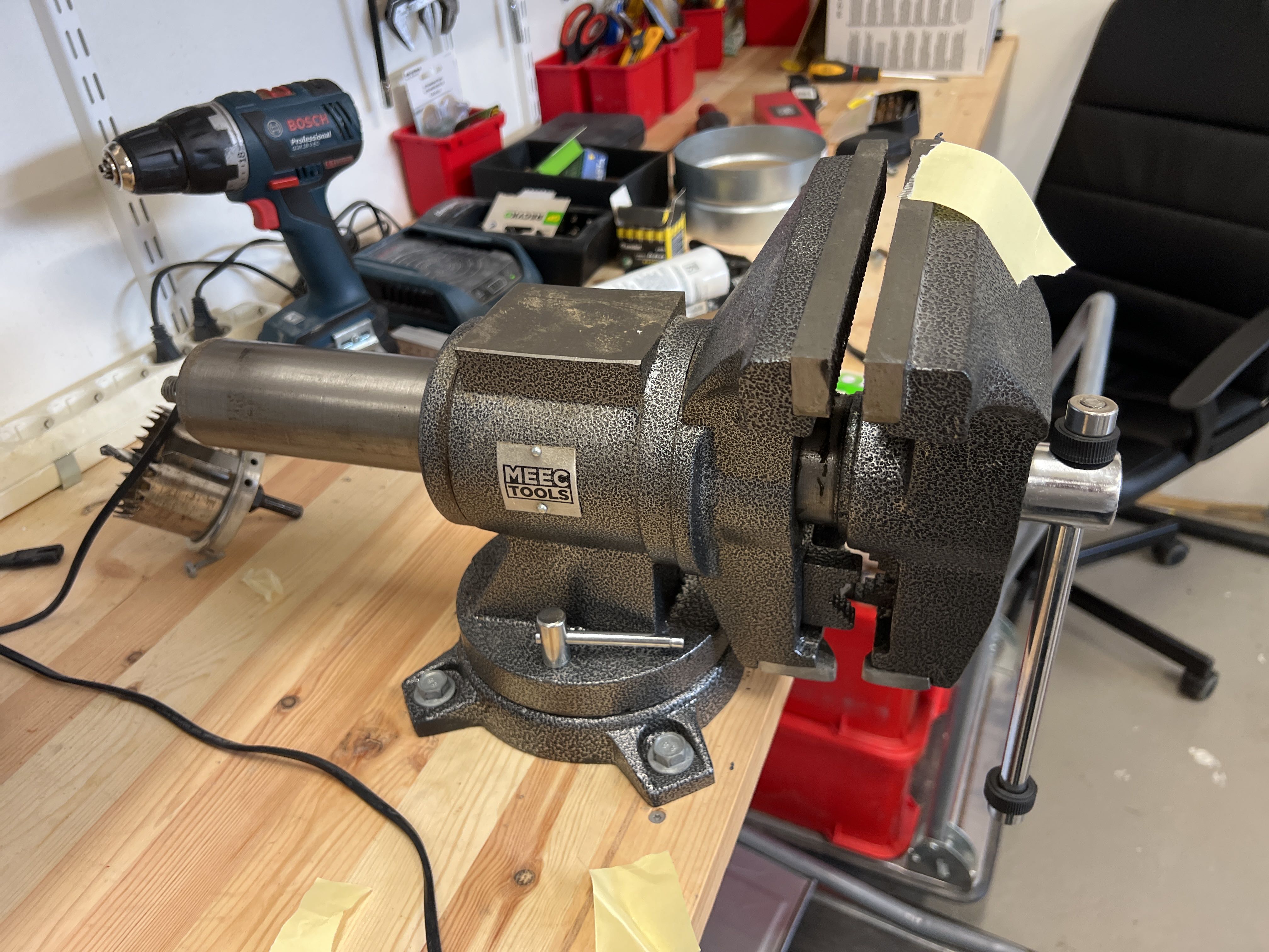 Wooden workbench with vise mounted