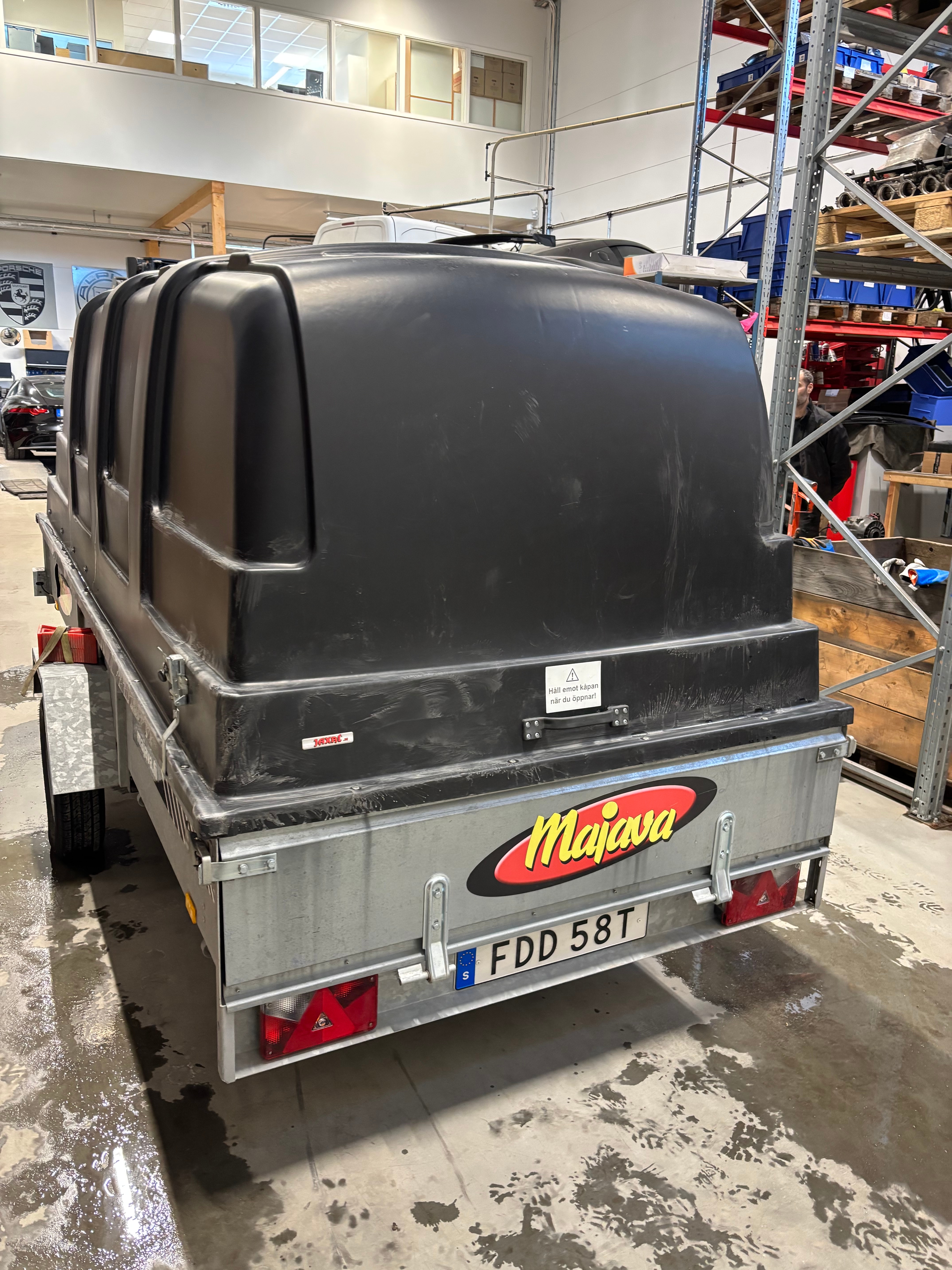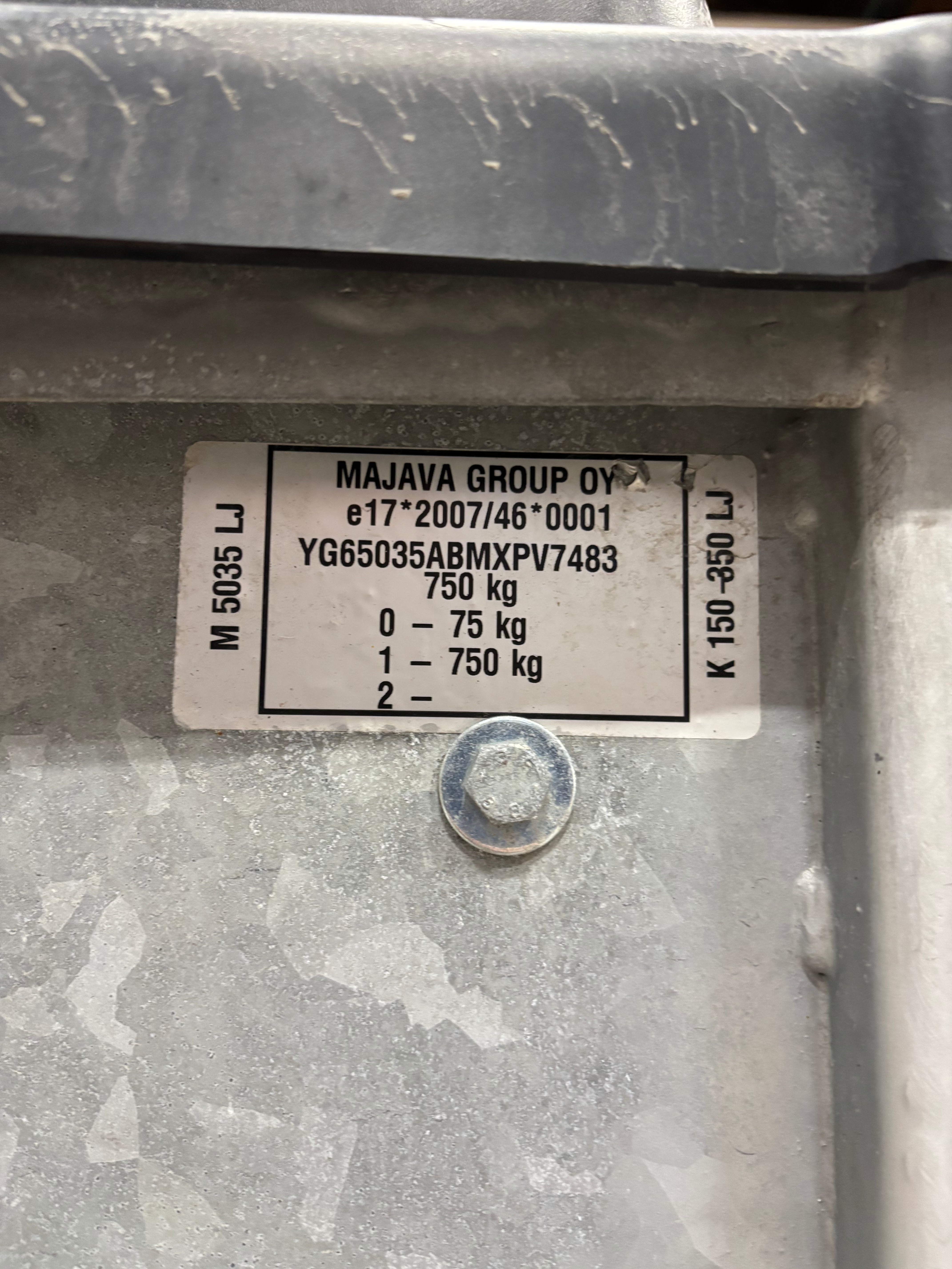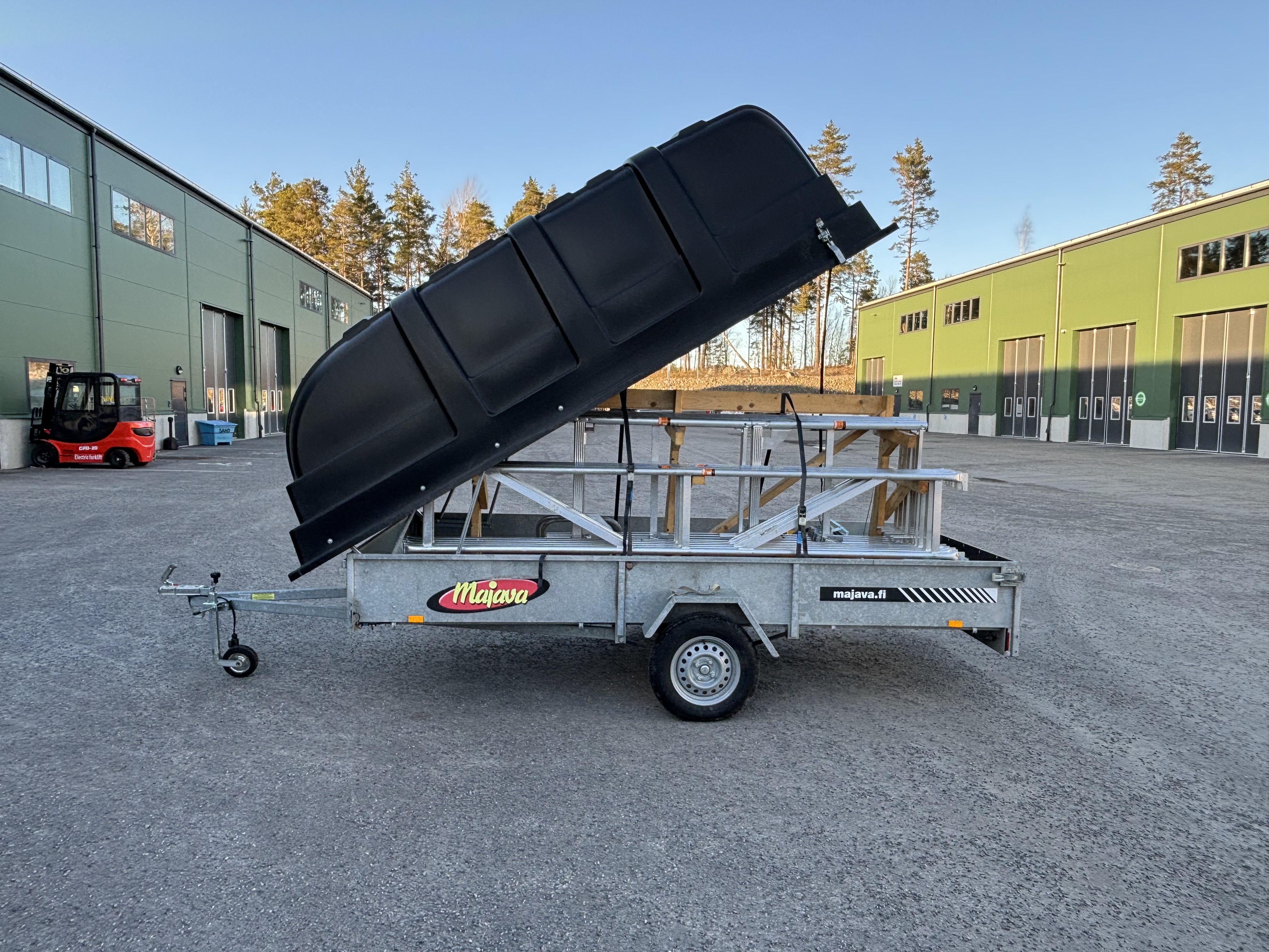 Trailer: Majava M5035LJ with cover that protects the stand against theft and snow. Unbraked, 750kg total weight, 558kg load weight.
