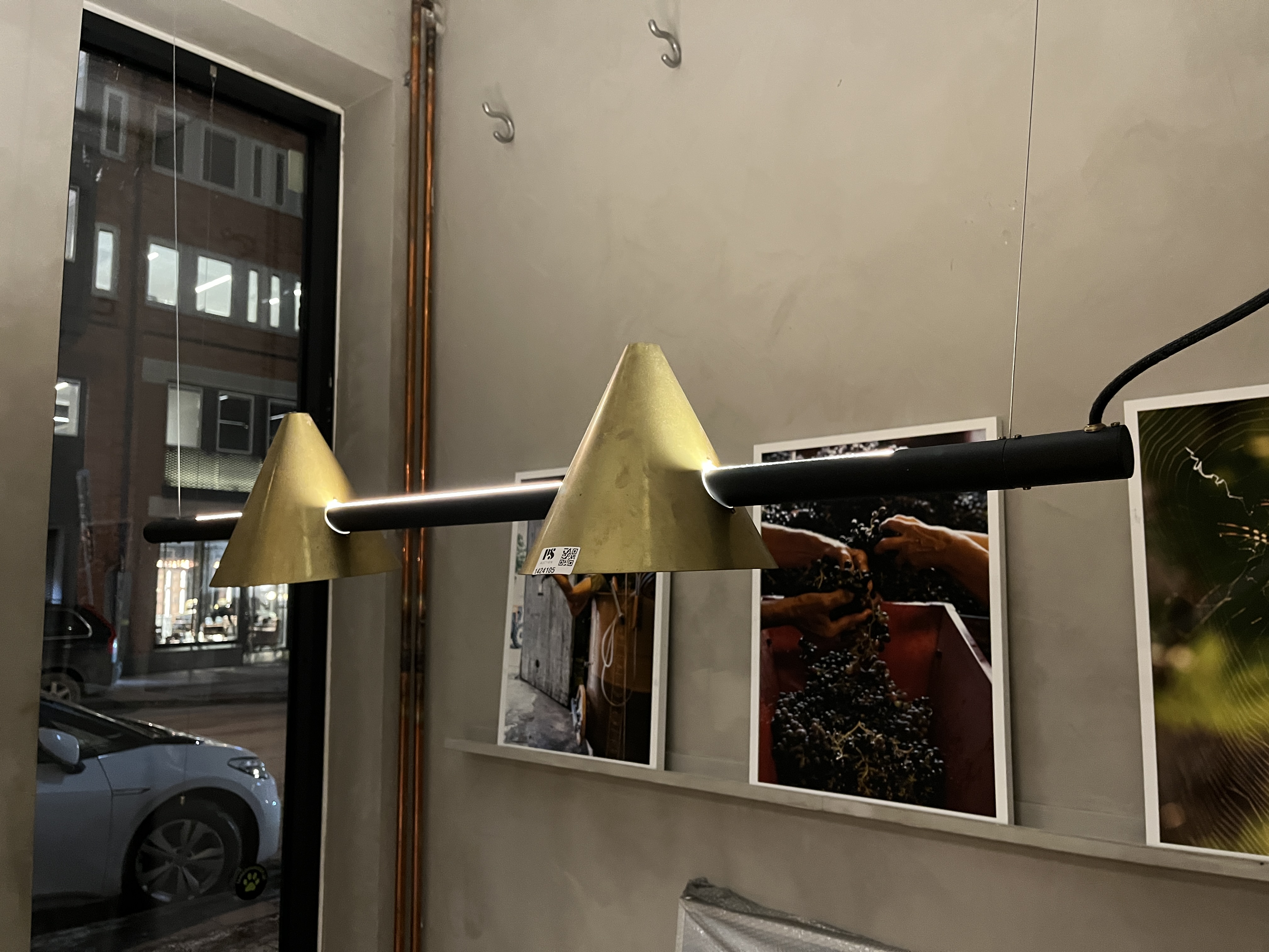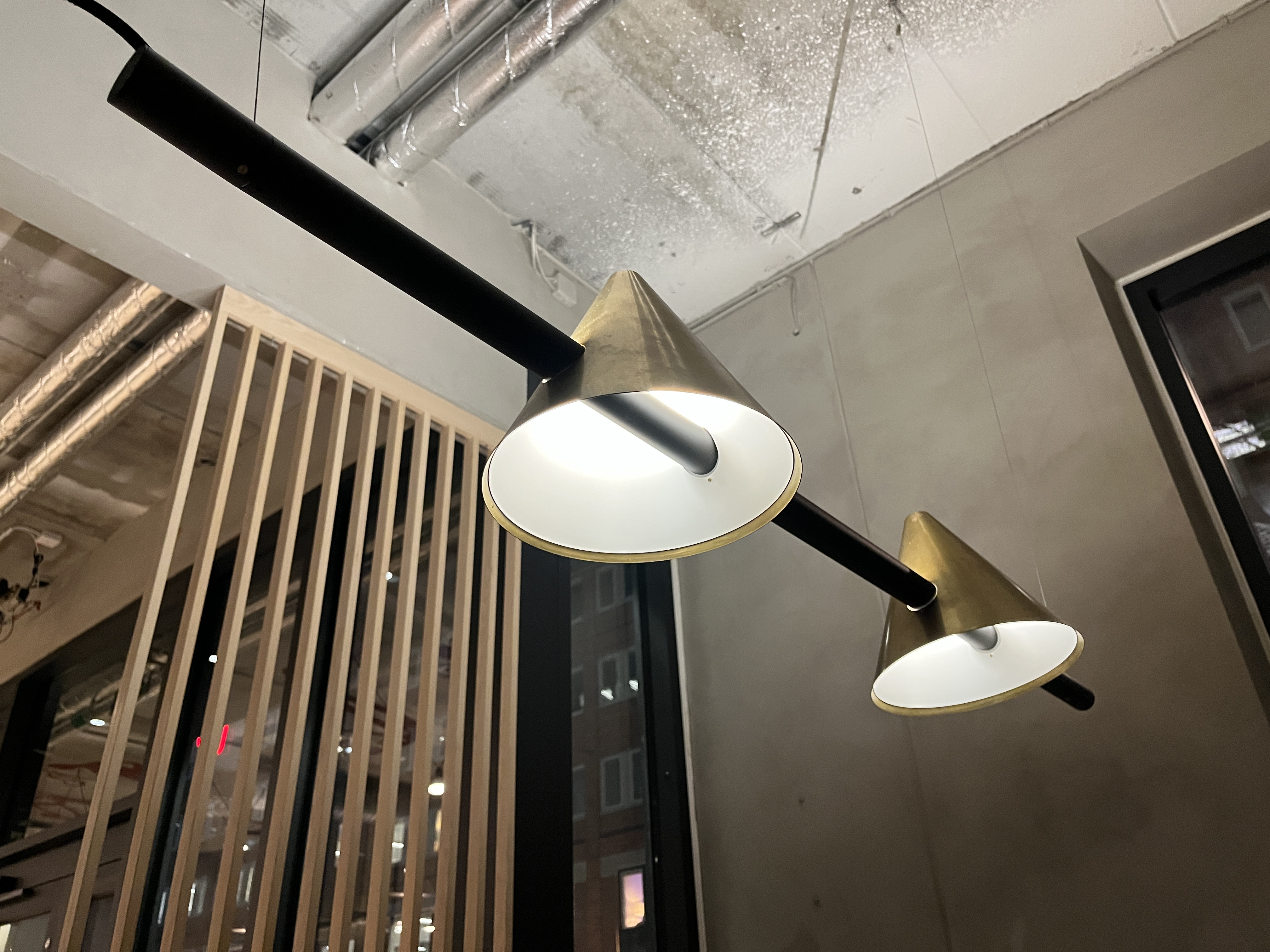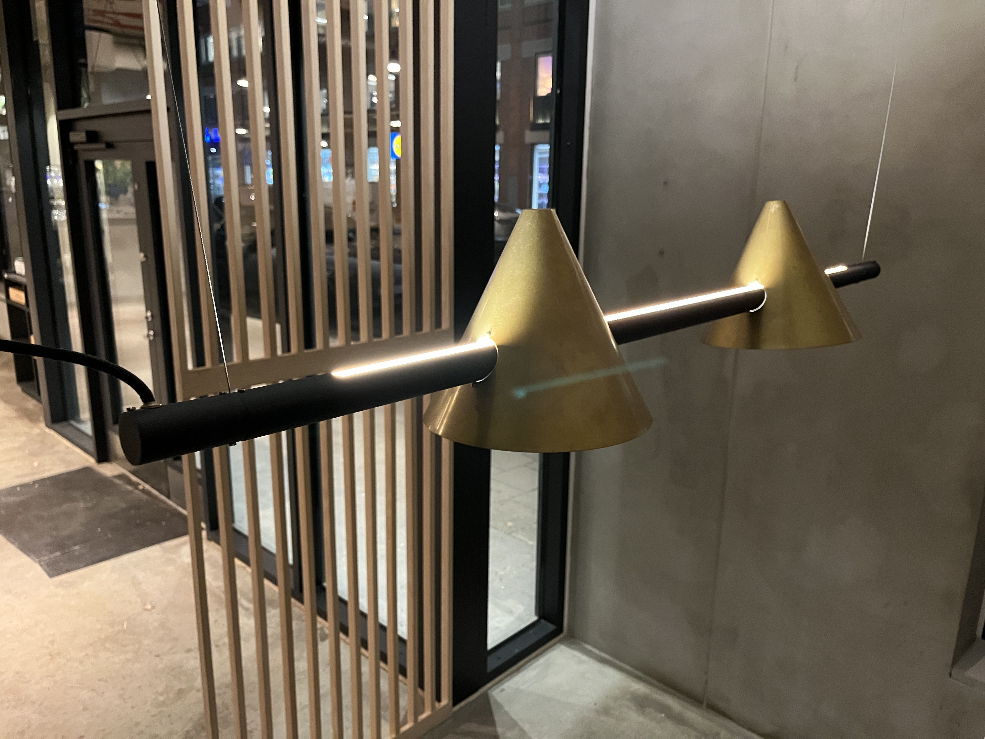 - Modern ceiling pendant from Örsjö Lighting with two cone-shaped shades mounted on a horizontal rod.