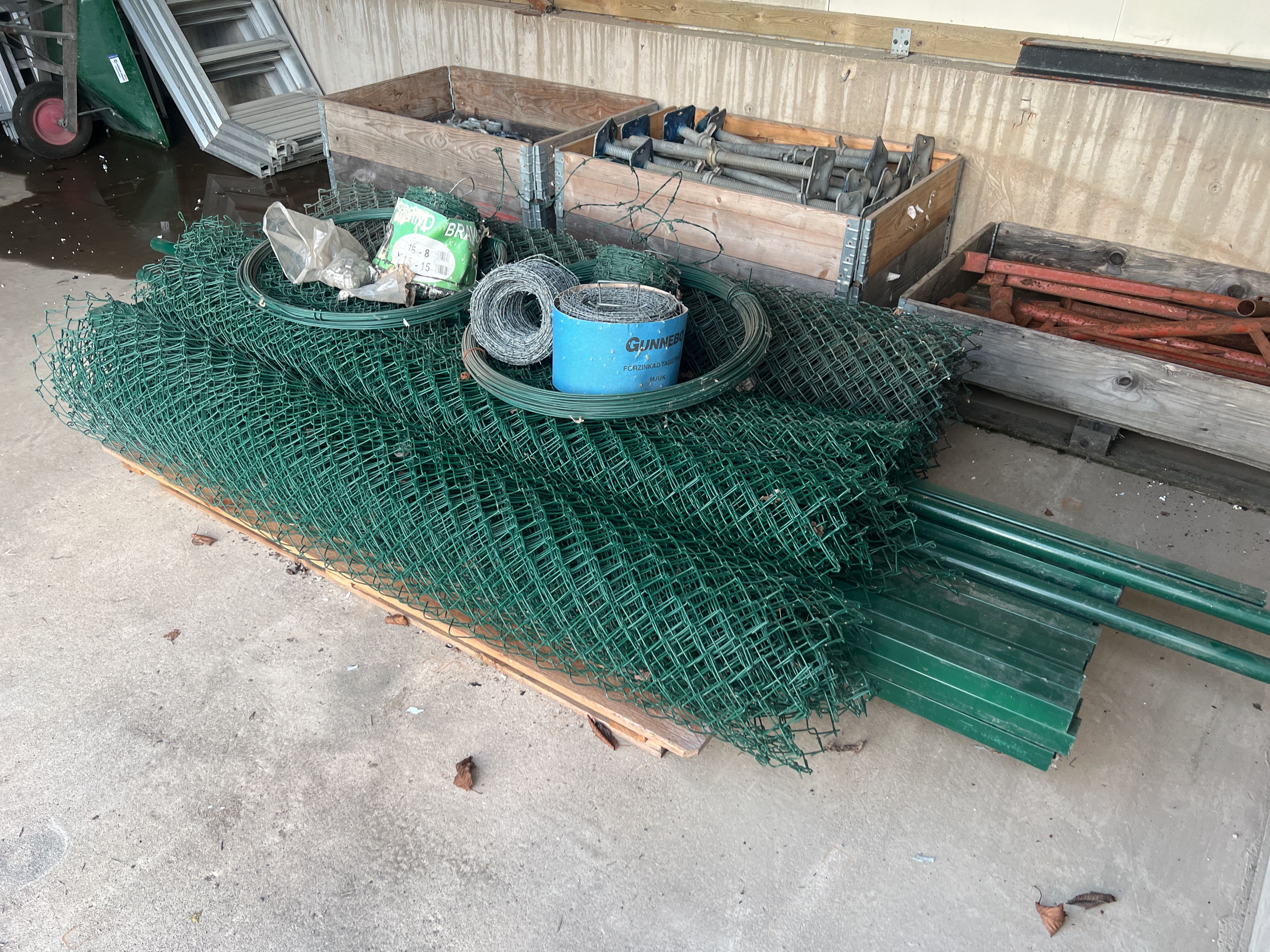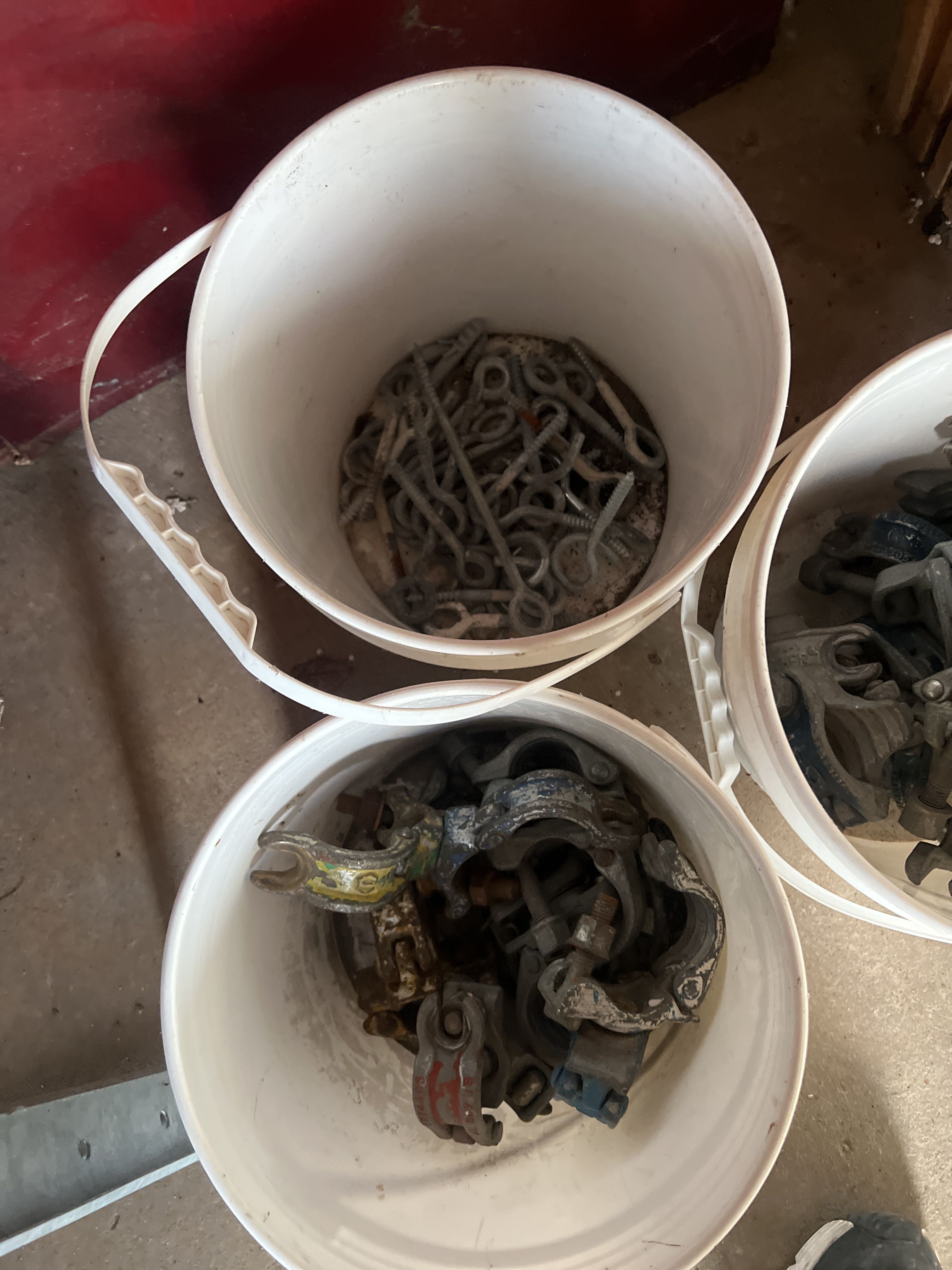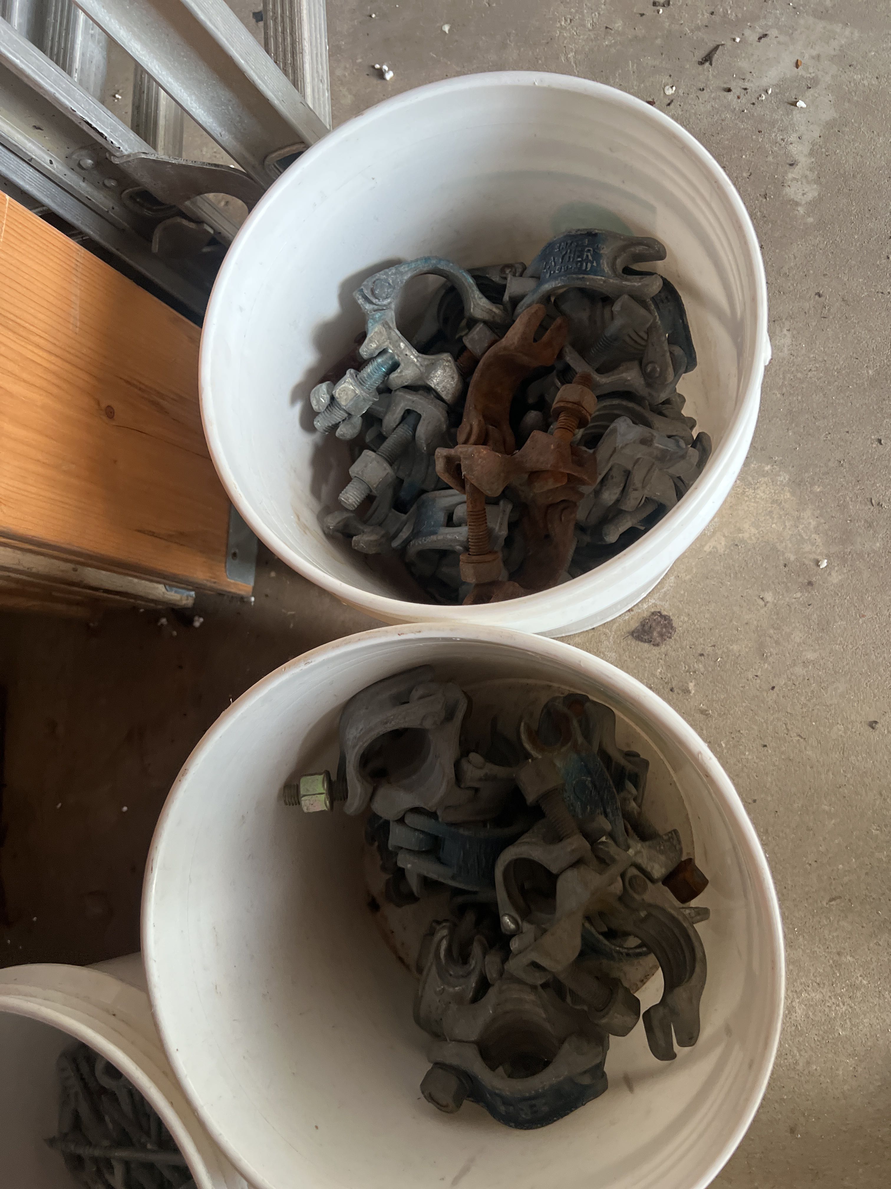 Various ladders, aluminum scaffolding steps, wheelbarrows, etc.