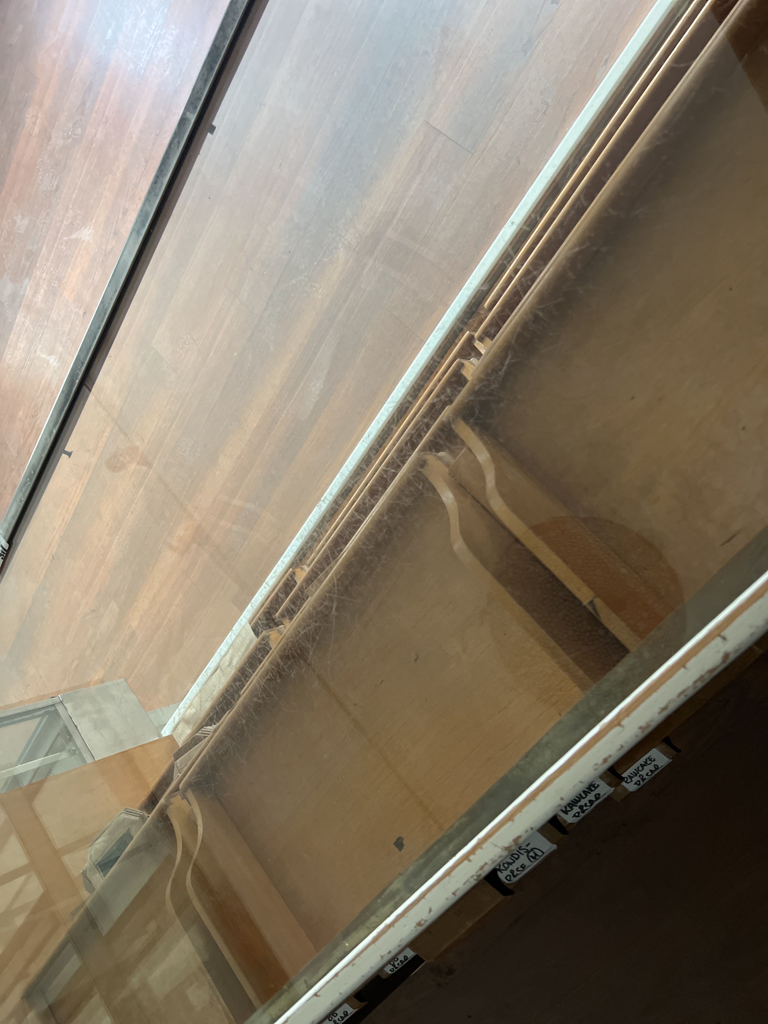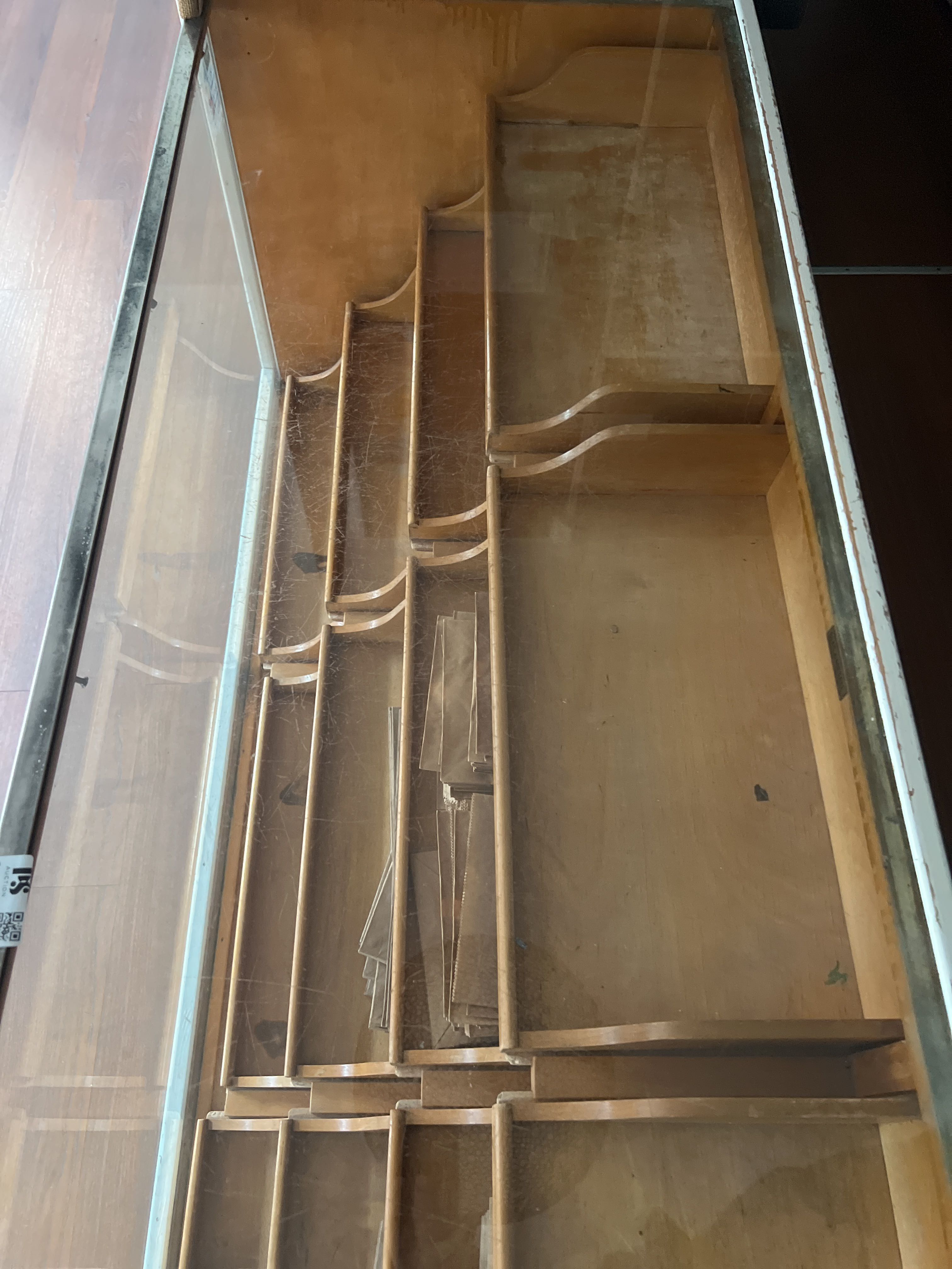 • Counter with glass top and wooden shelves, intended for store display or storage.