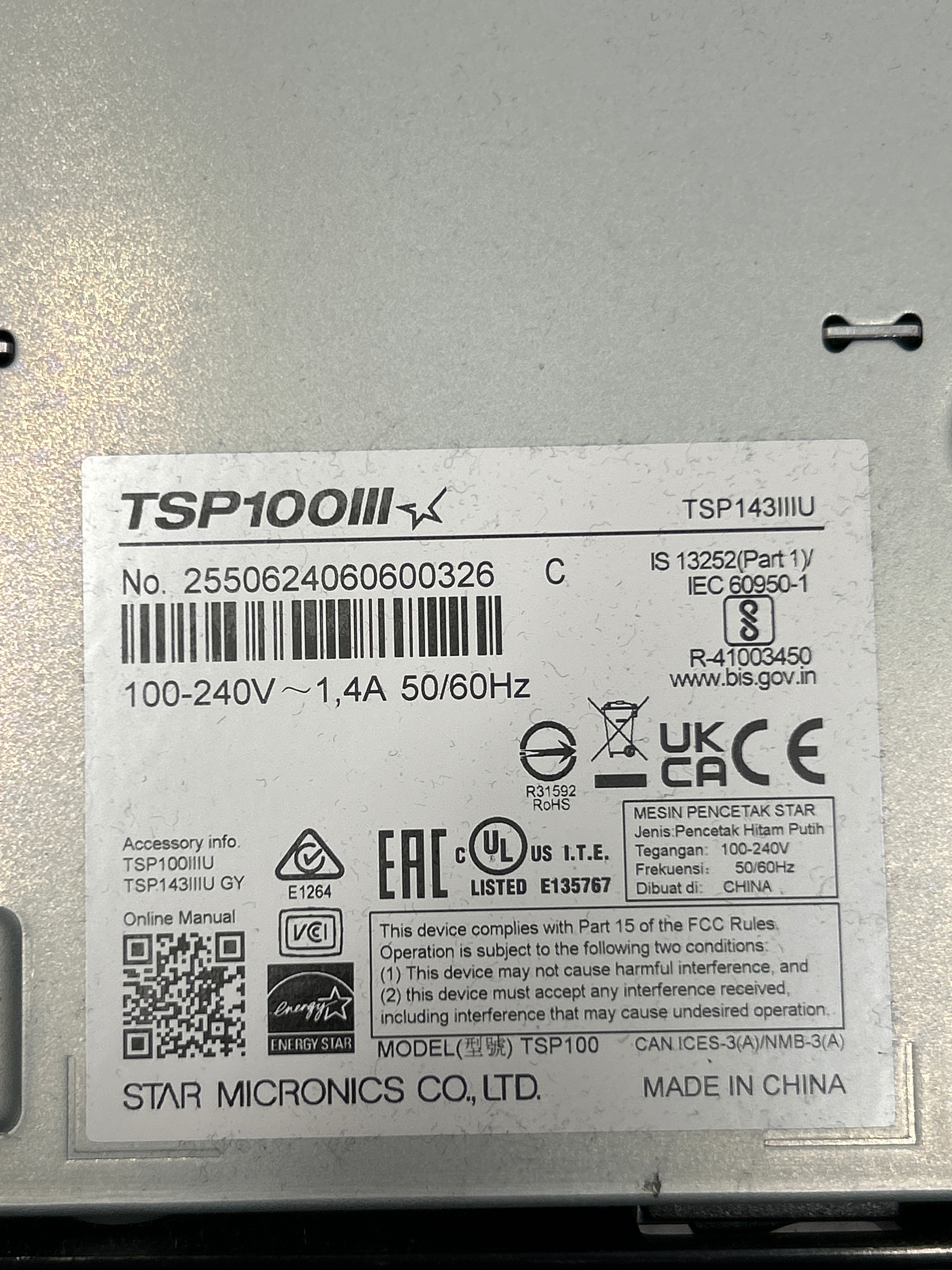 Voltage: 100–240V ~ 1.4A 50/60Hz
