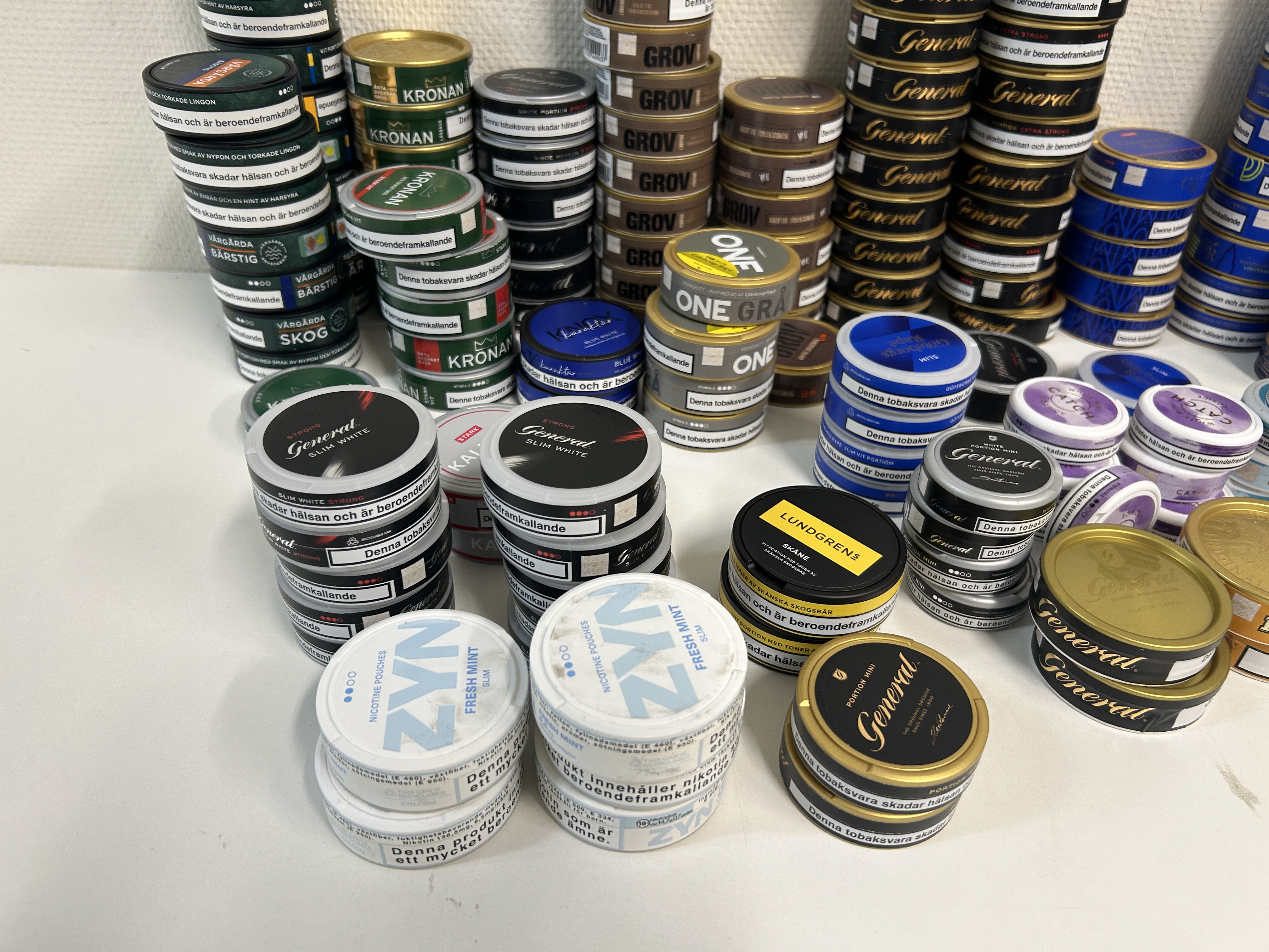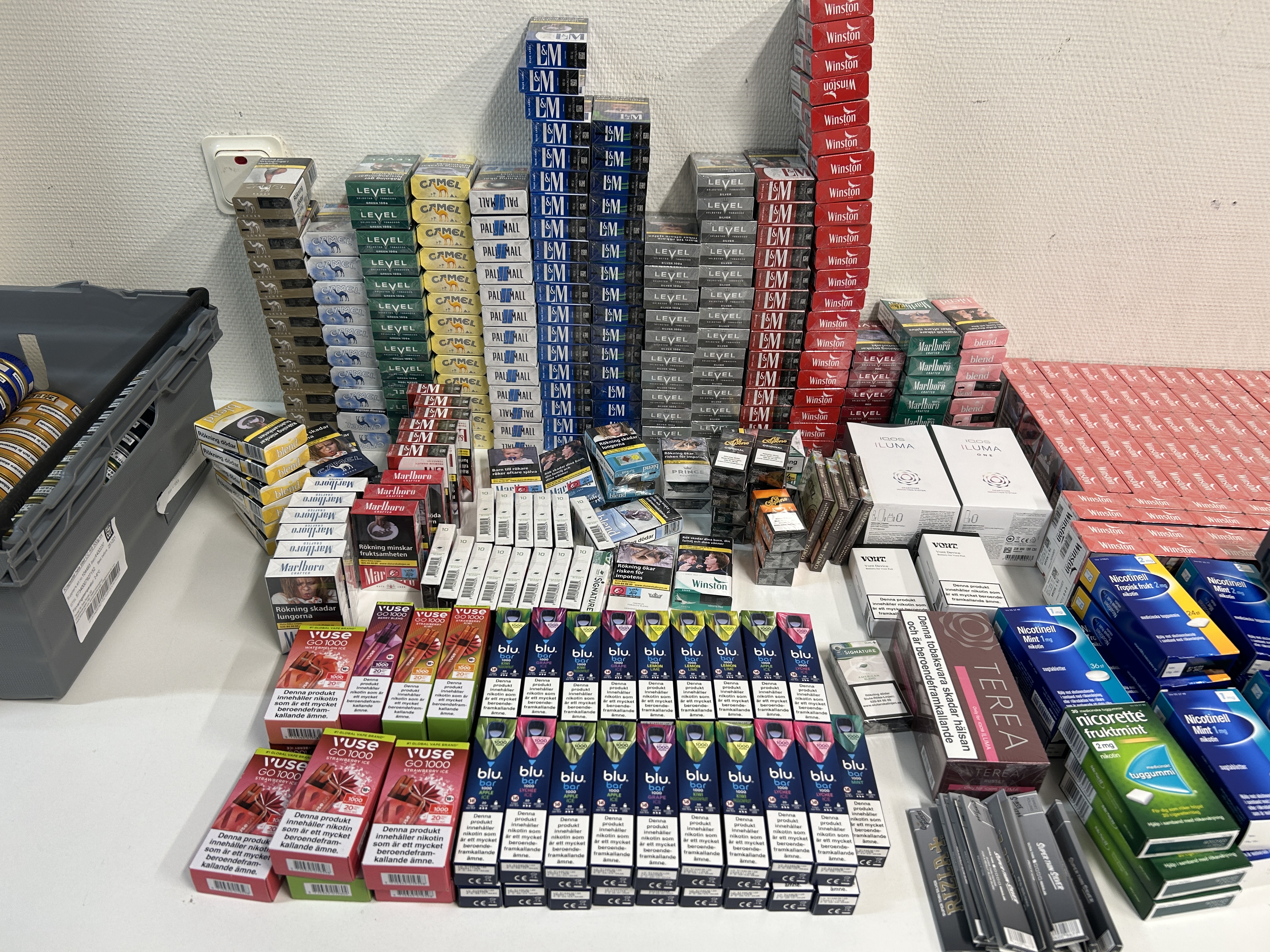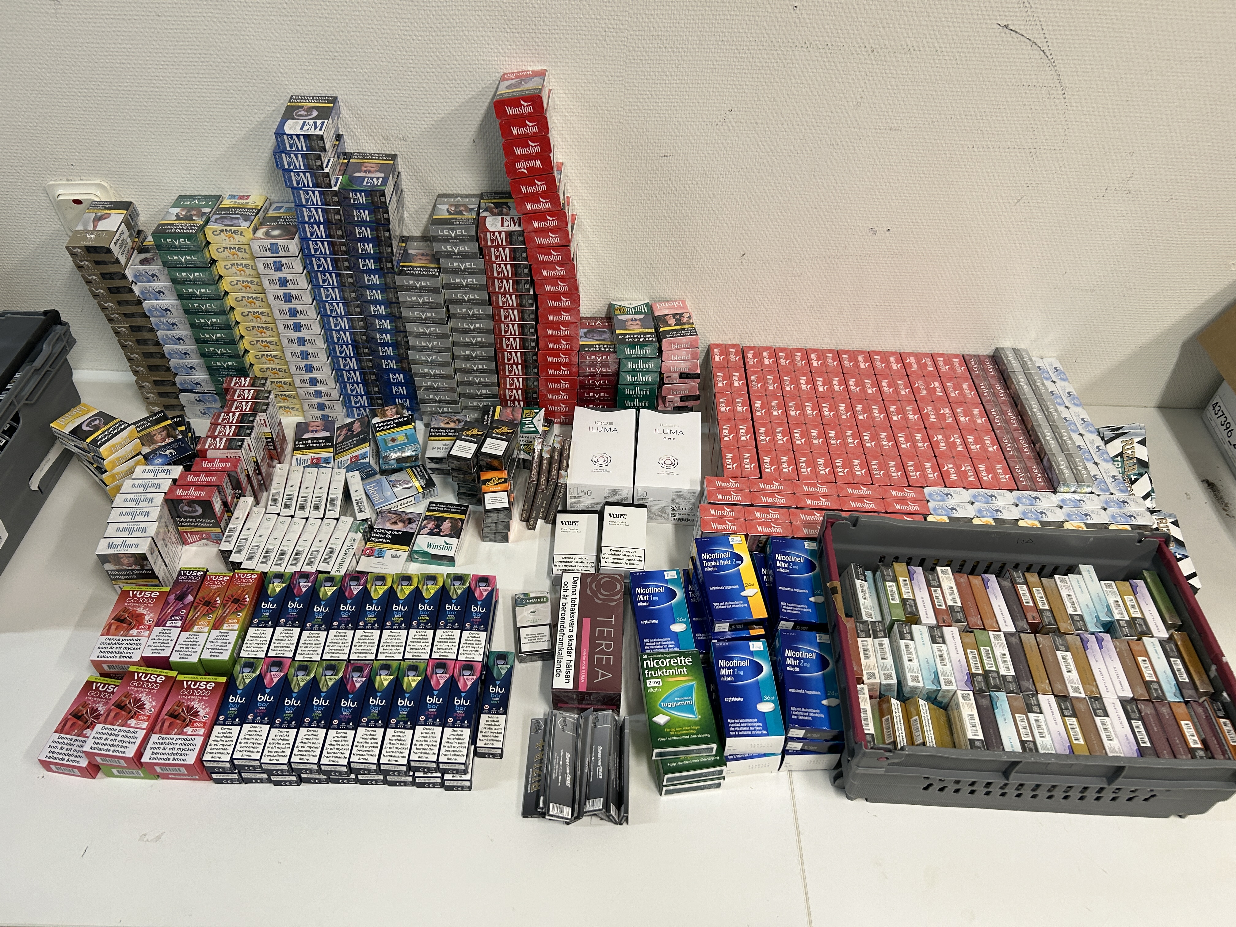 Approximately 400 boxes of cigarettes and cigarillos, 50 vapes and 190 cans of snus etc. (see pictures)