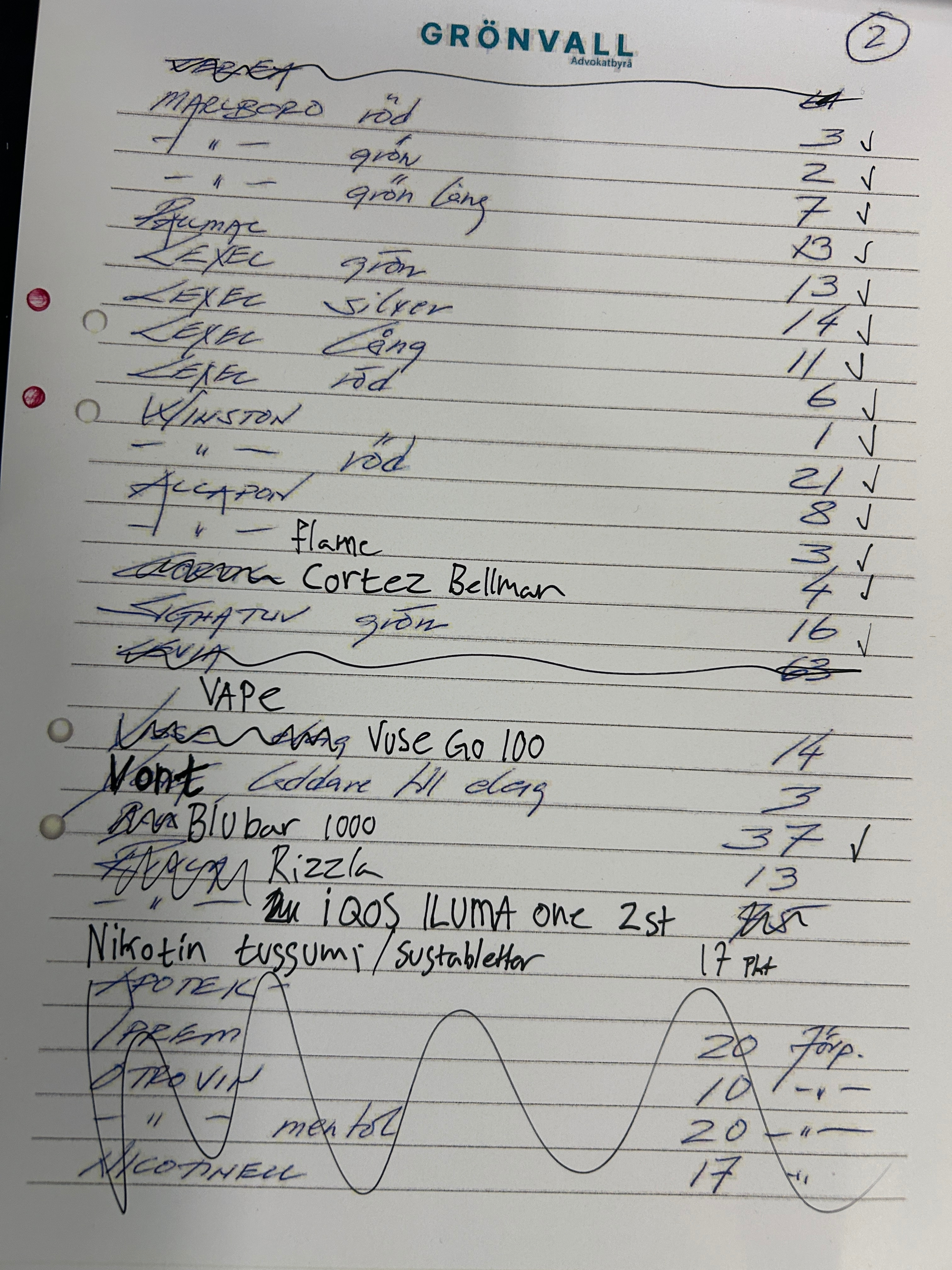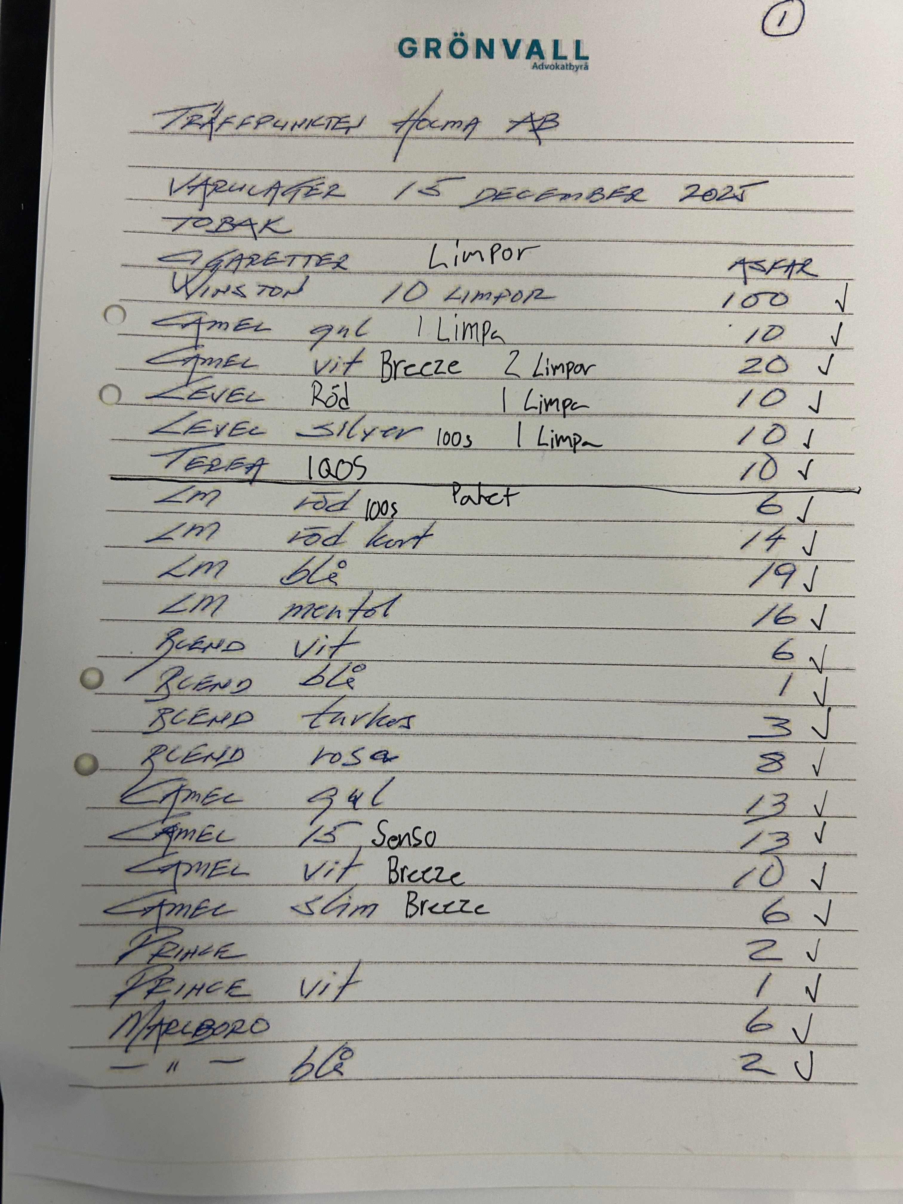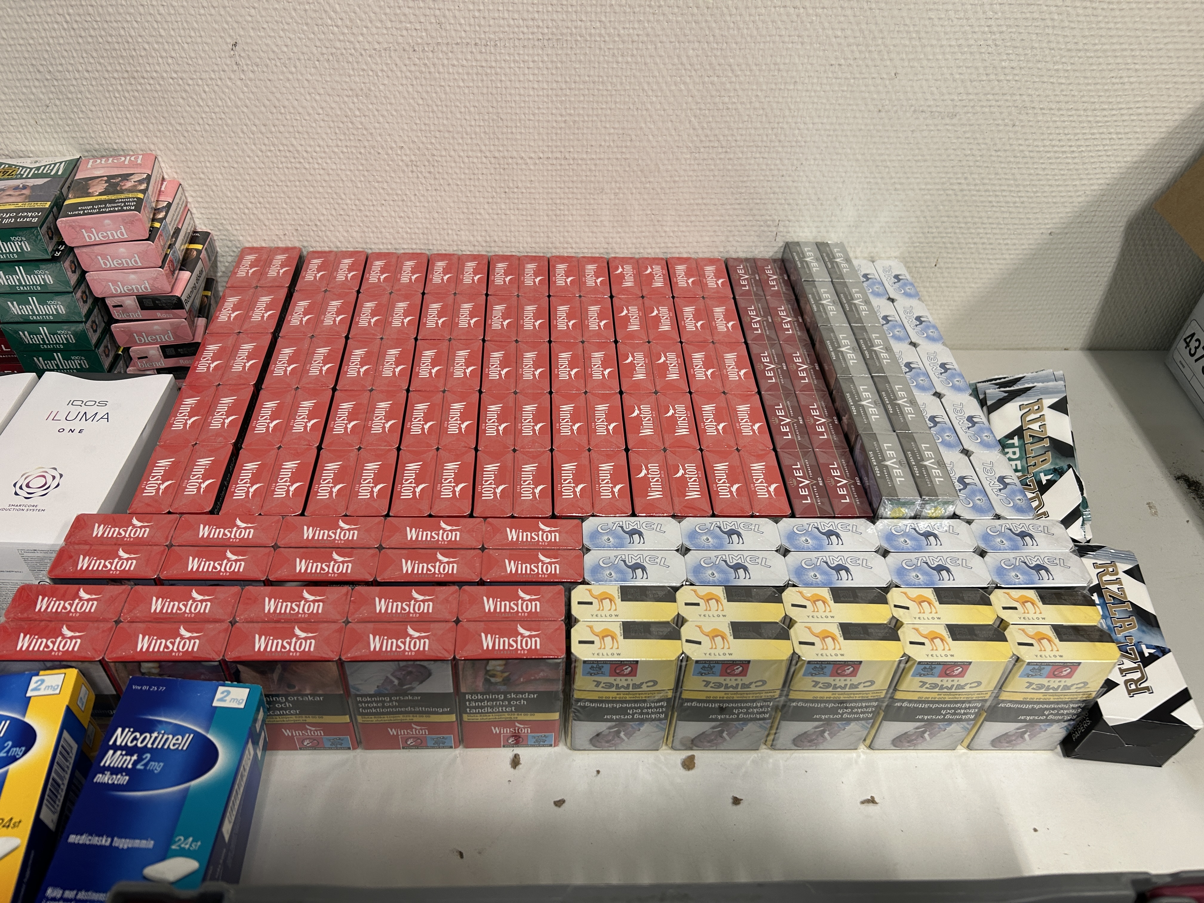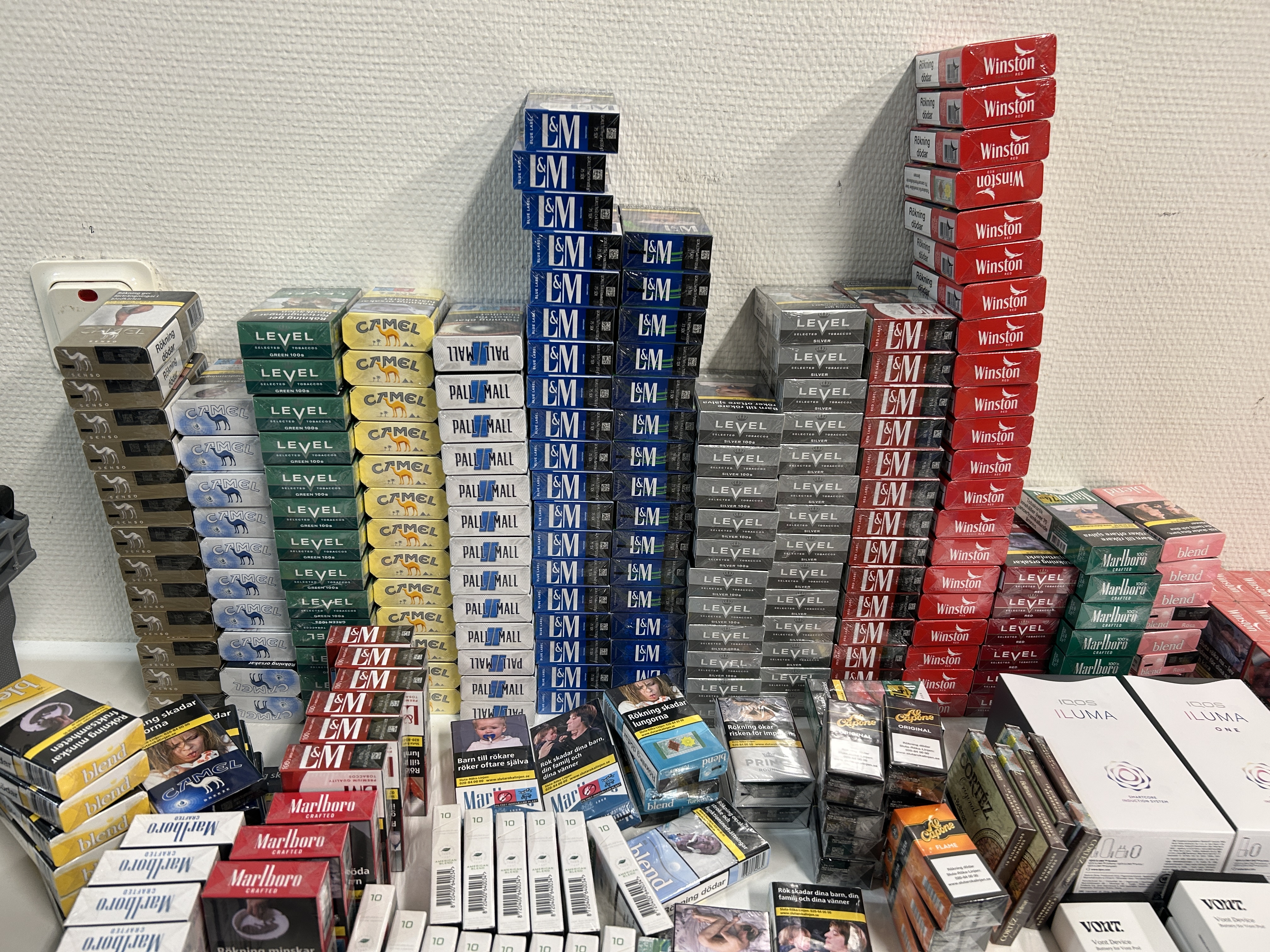 Approximately 400 boxes of cigarettes and cigarillos, 50 vapes and 190 cans of snus etc. (see pictures)
