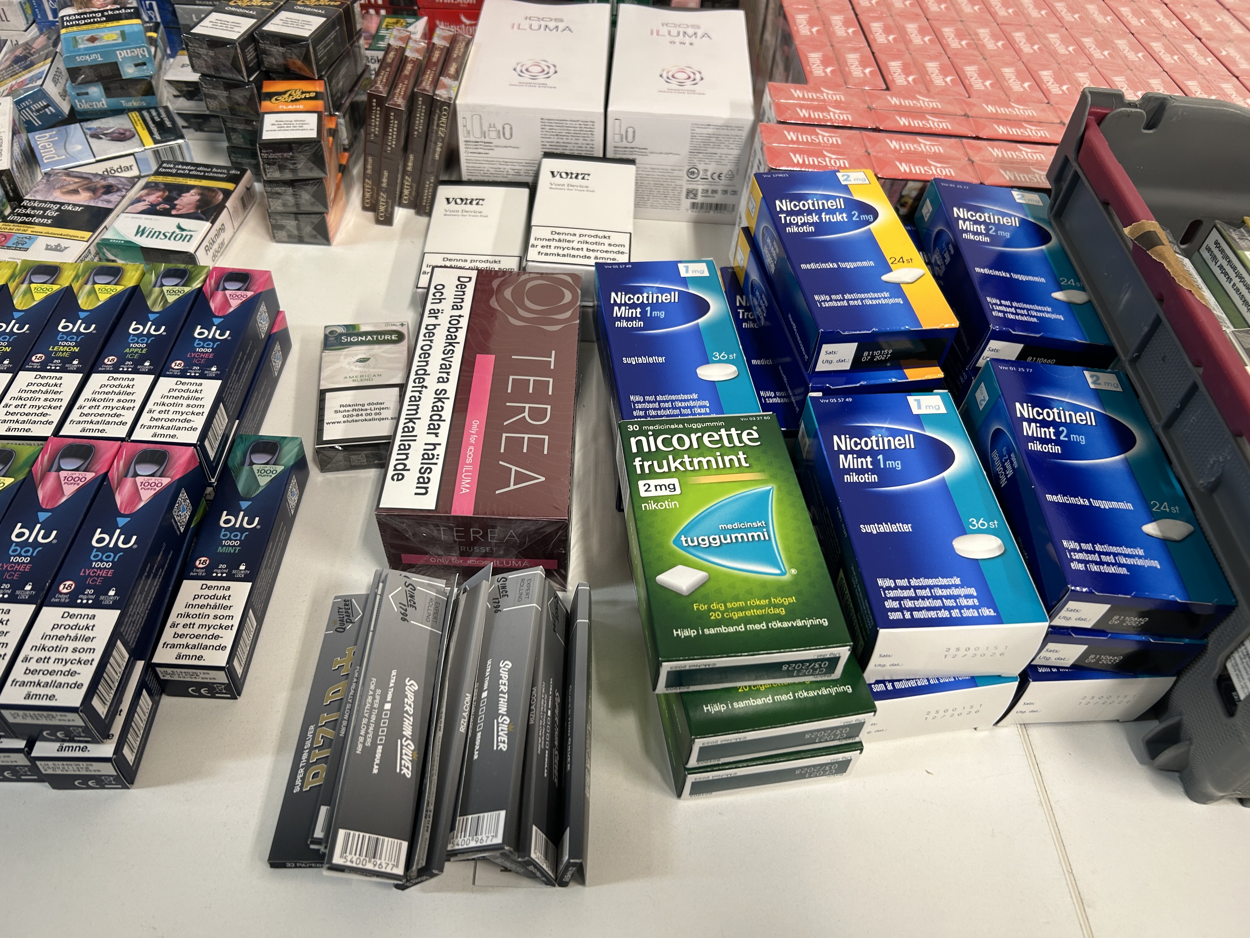 Lot of tobacco and nicotine products.