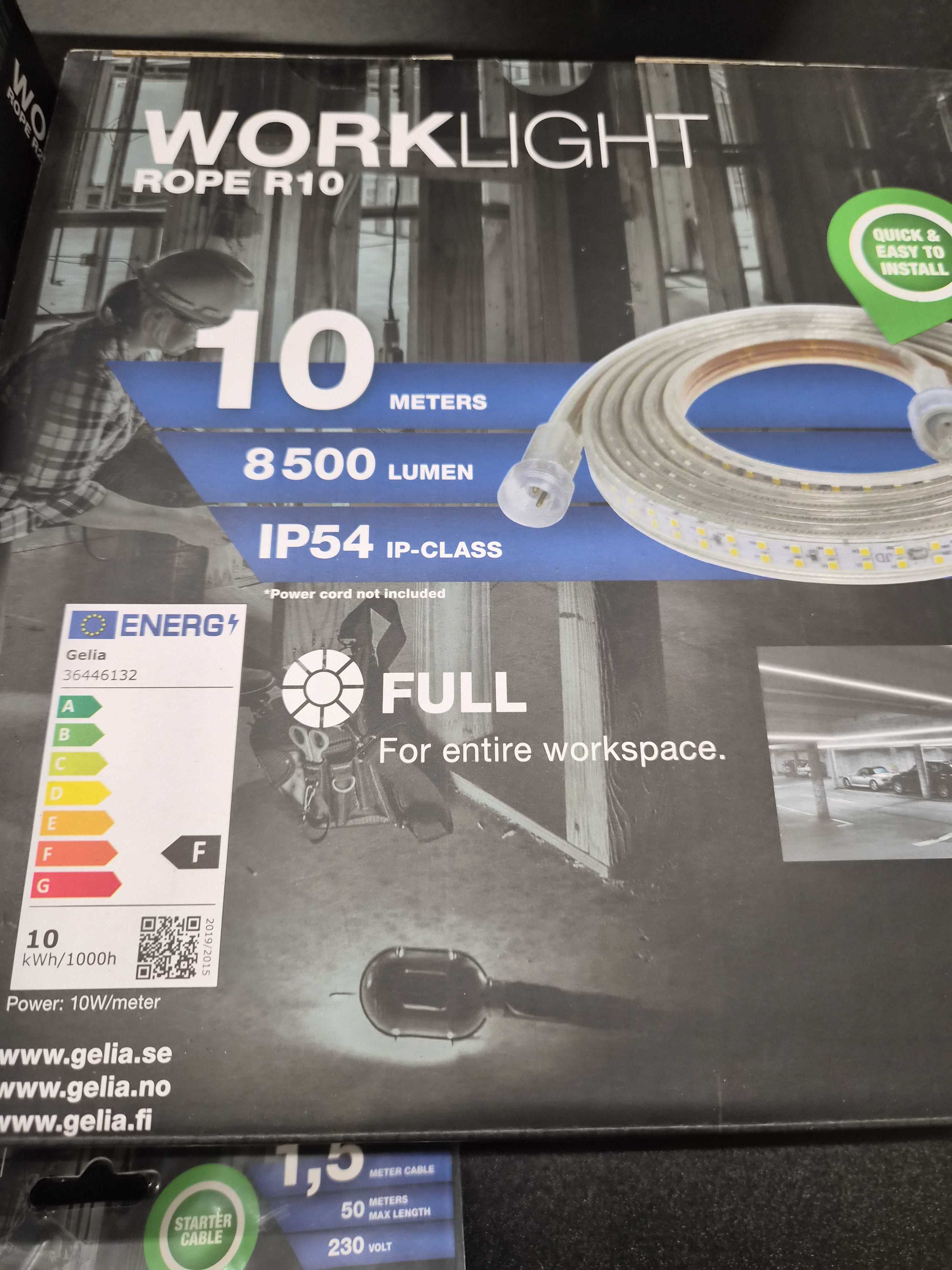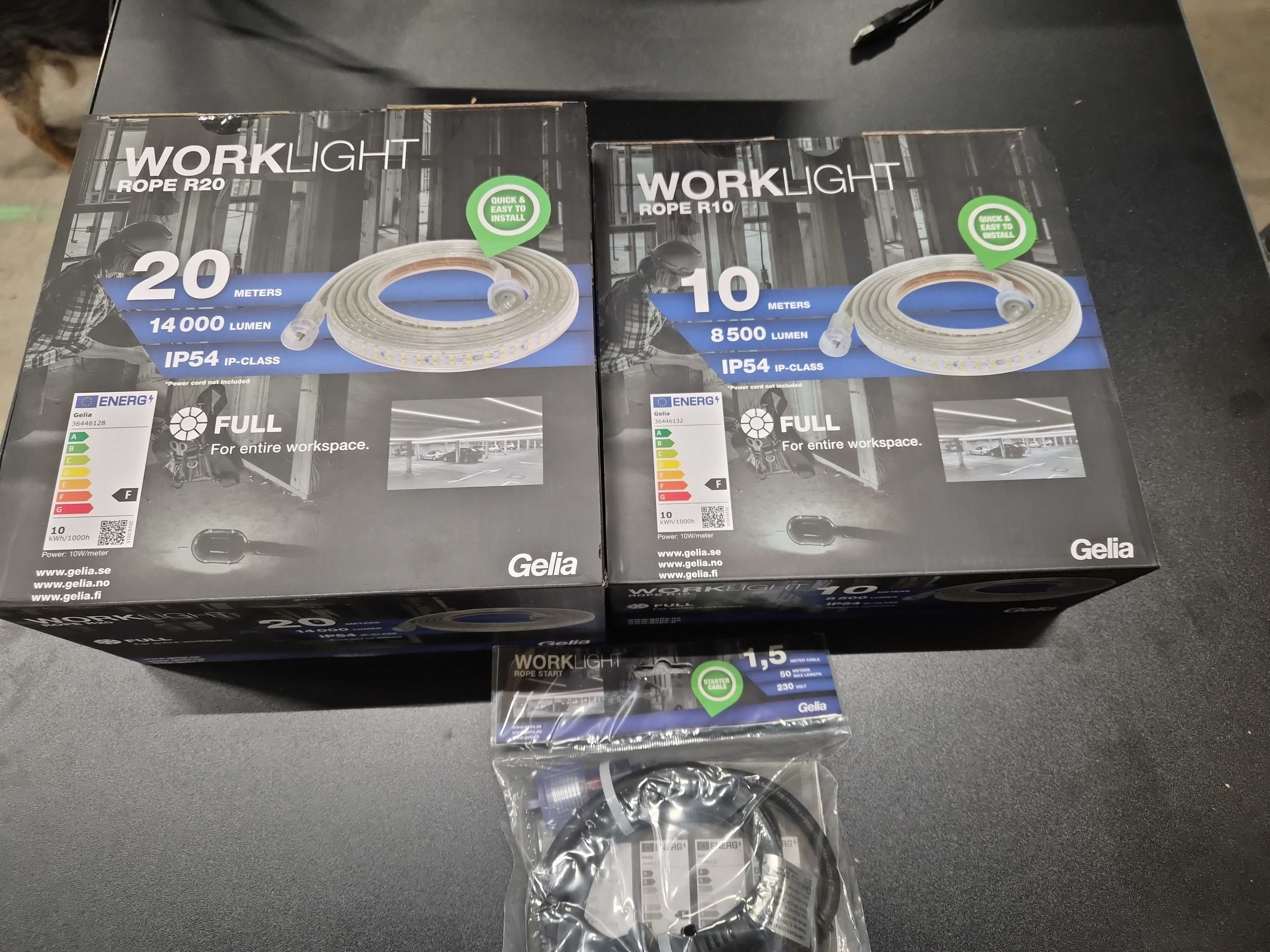 Practical LED light strips for the workplace, designed for easy installation and even illumination over larger areas. The package includes two light strips in different lengths and a starter cable for connection. Suitable for construction environments, renovation jobs and other workplaces where clear light is needed.