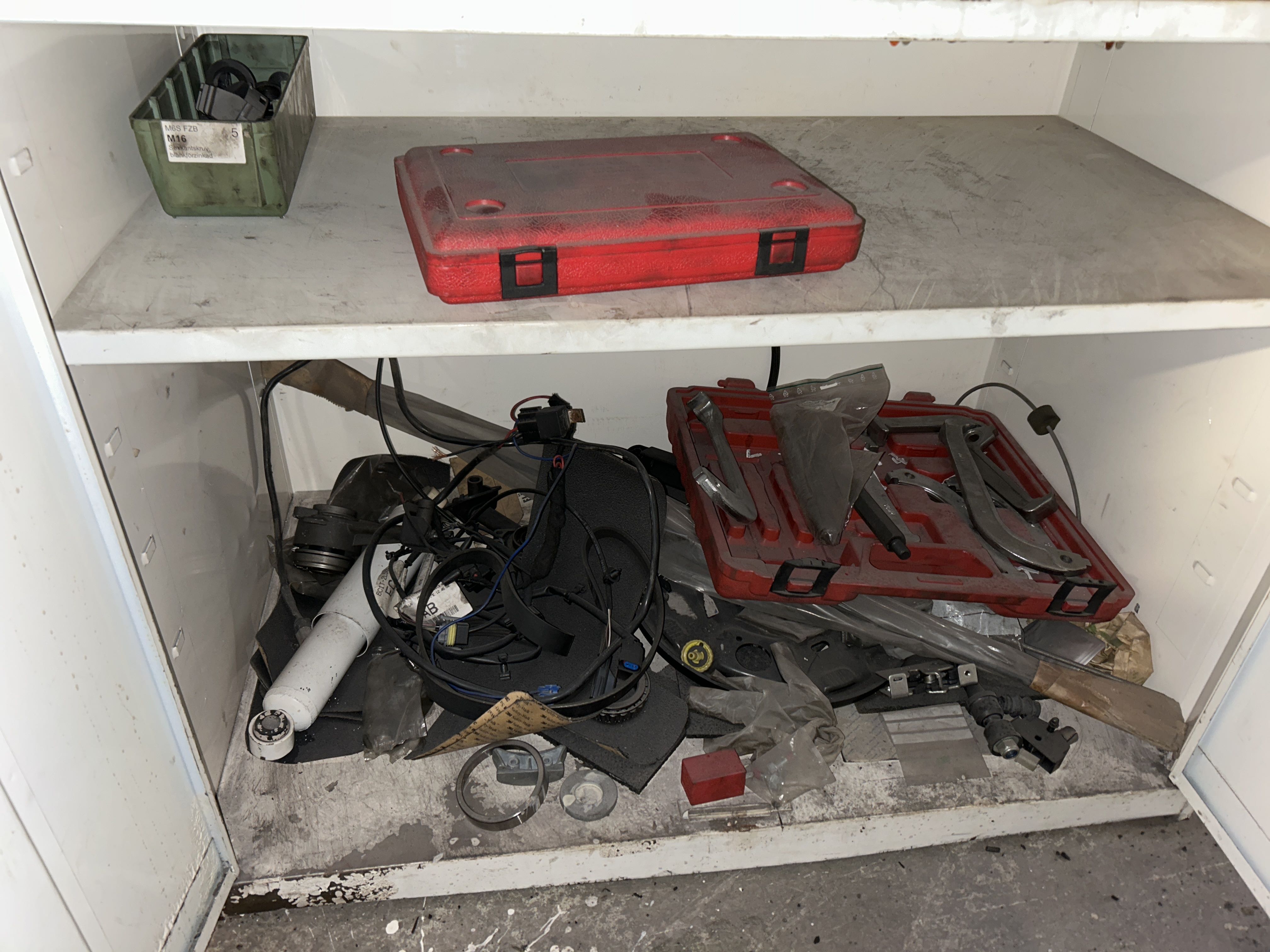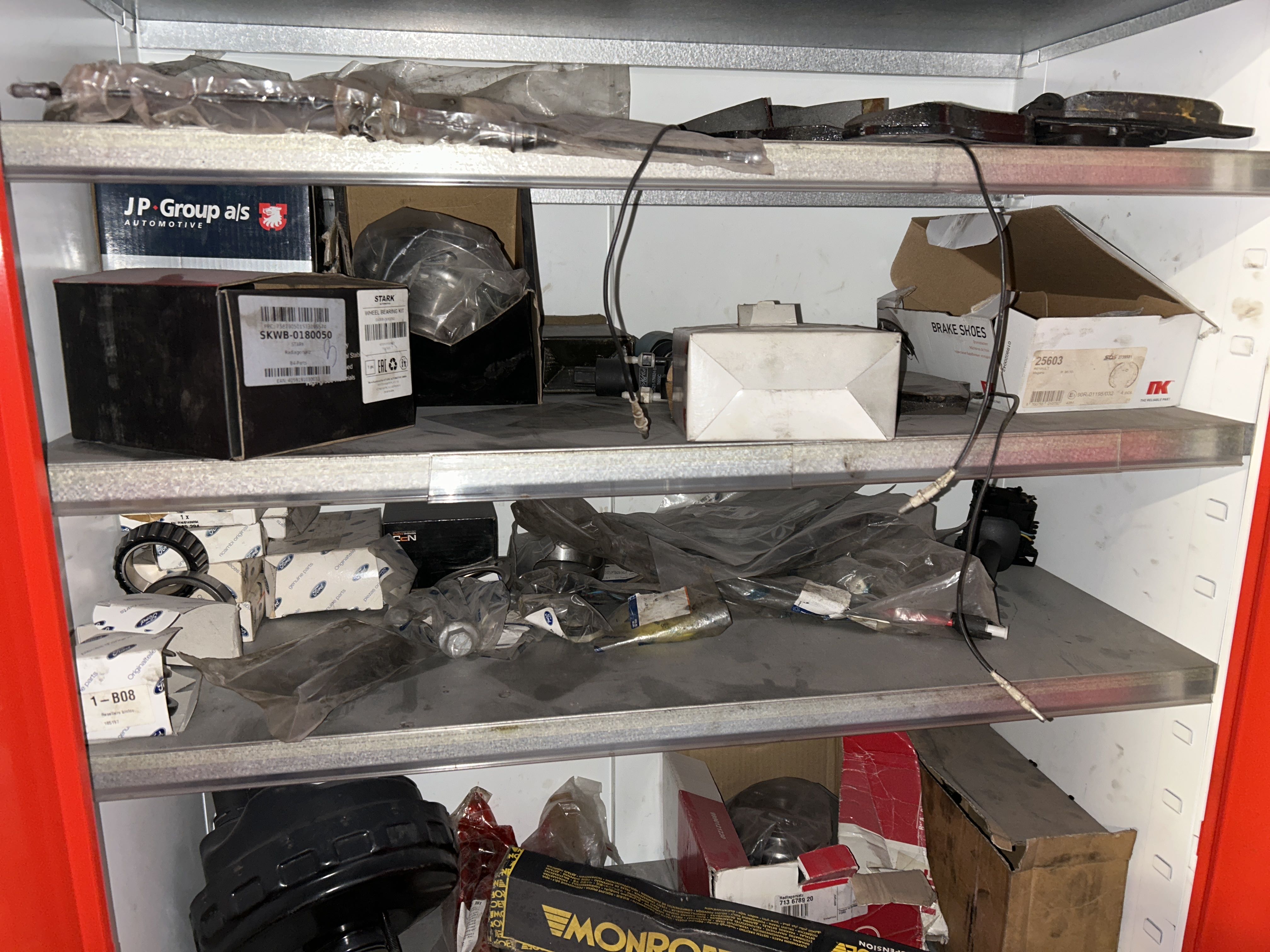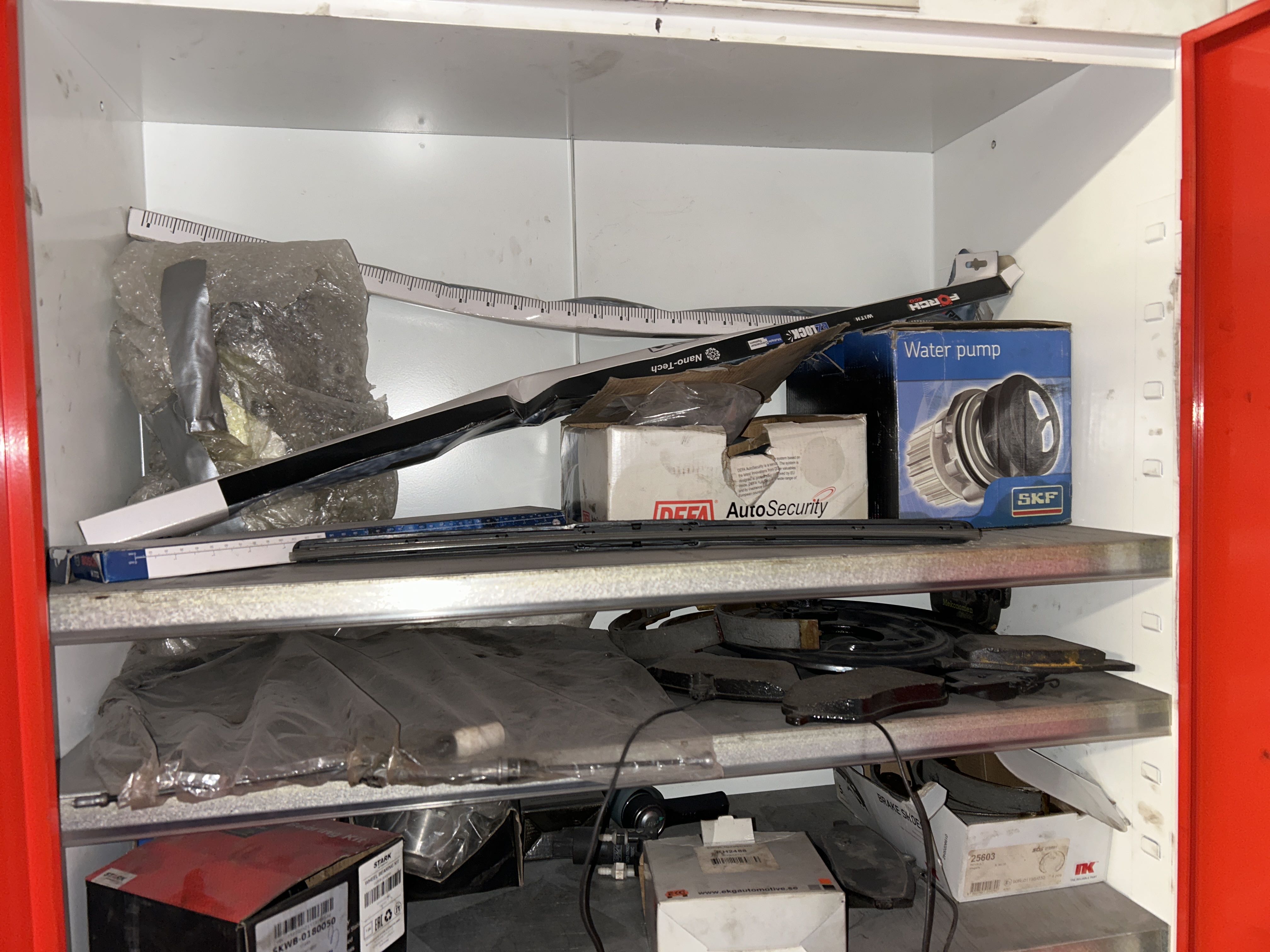 • Three metal cabinets filled with vehicle-related spare parts, service items and other workshop materials. The contents consist mainly of consumable parts for passenger cars.