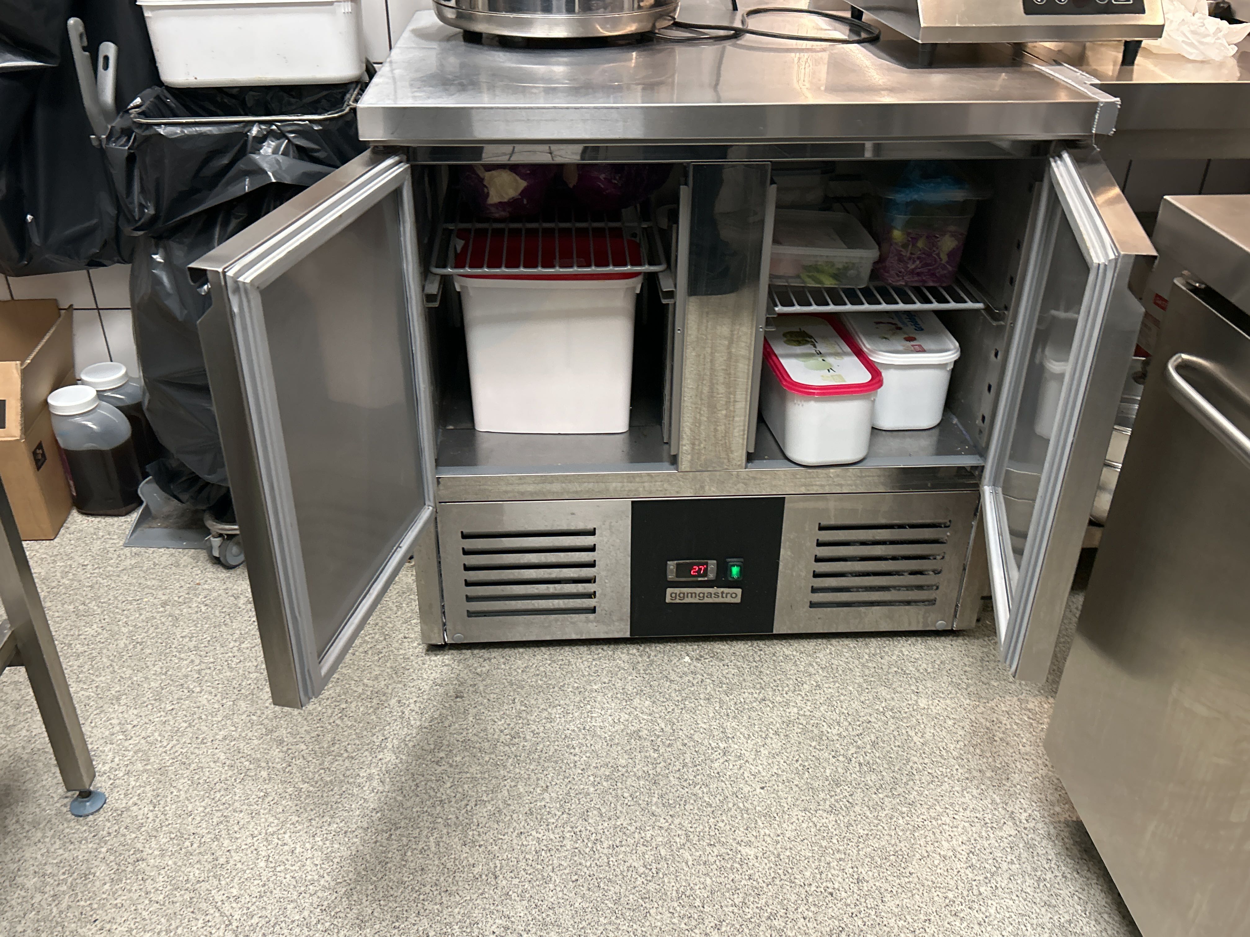 • Cold storage with electronic temperature display and stainless steel work surface on top.