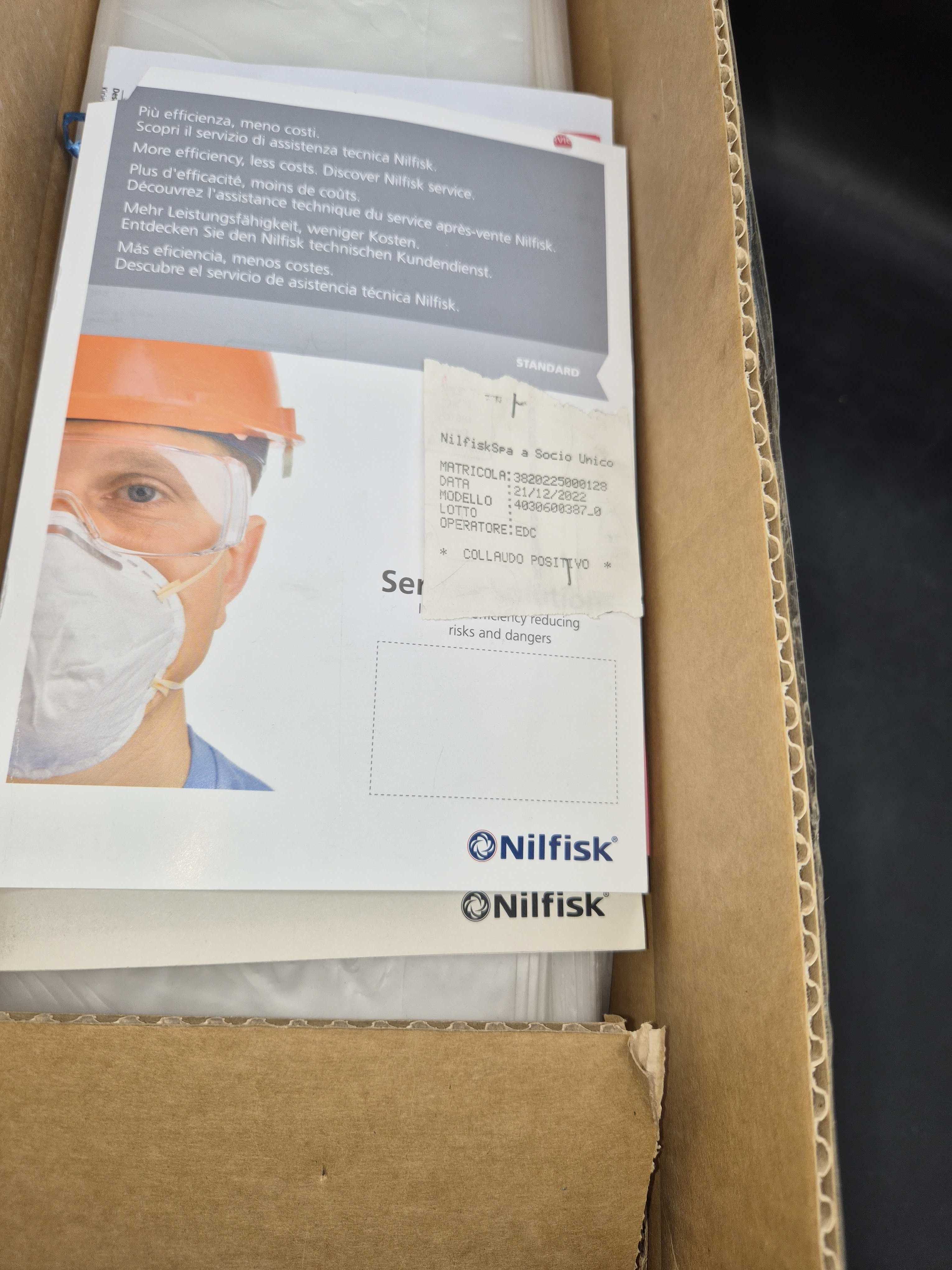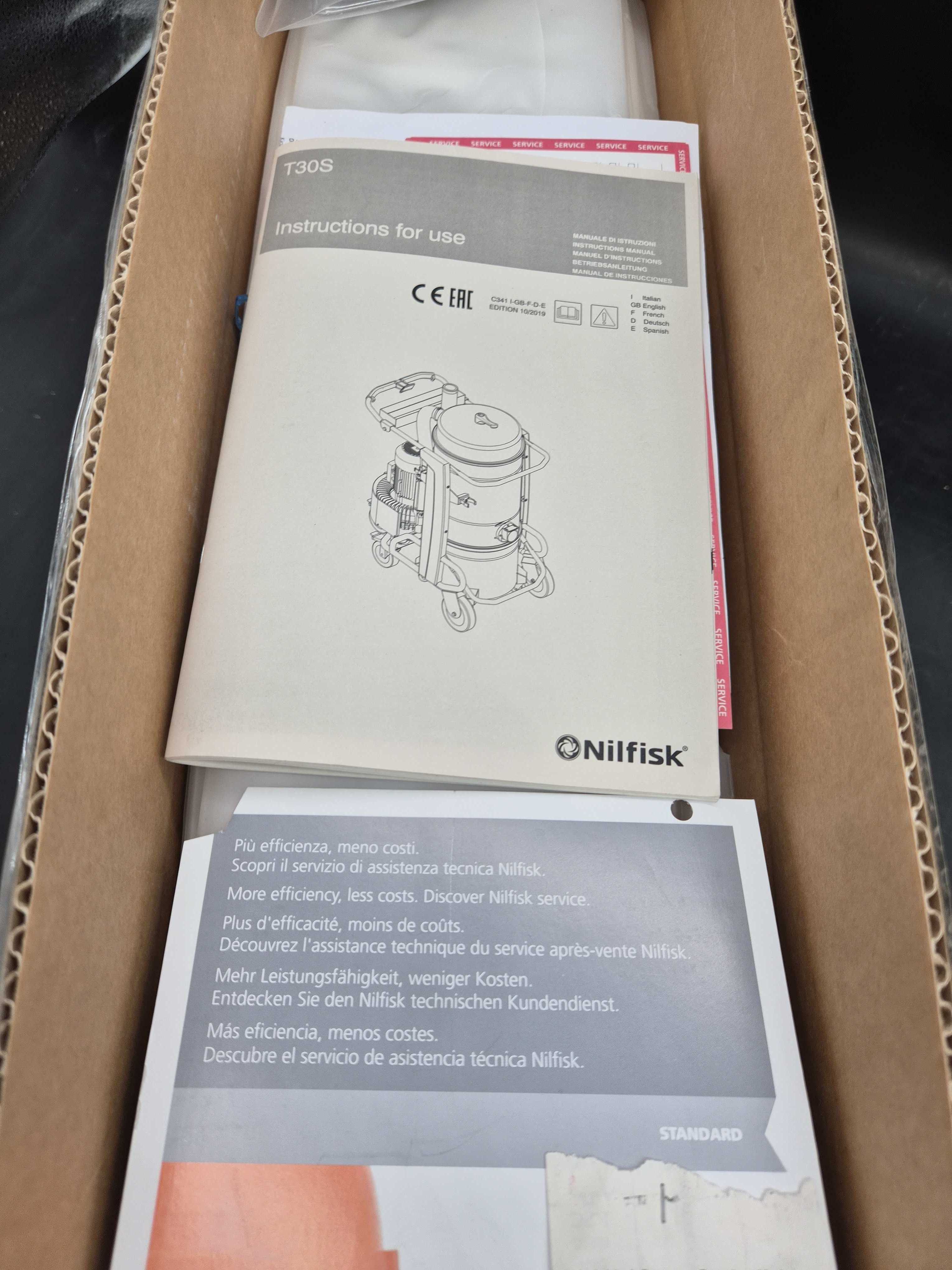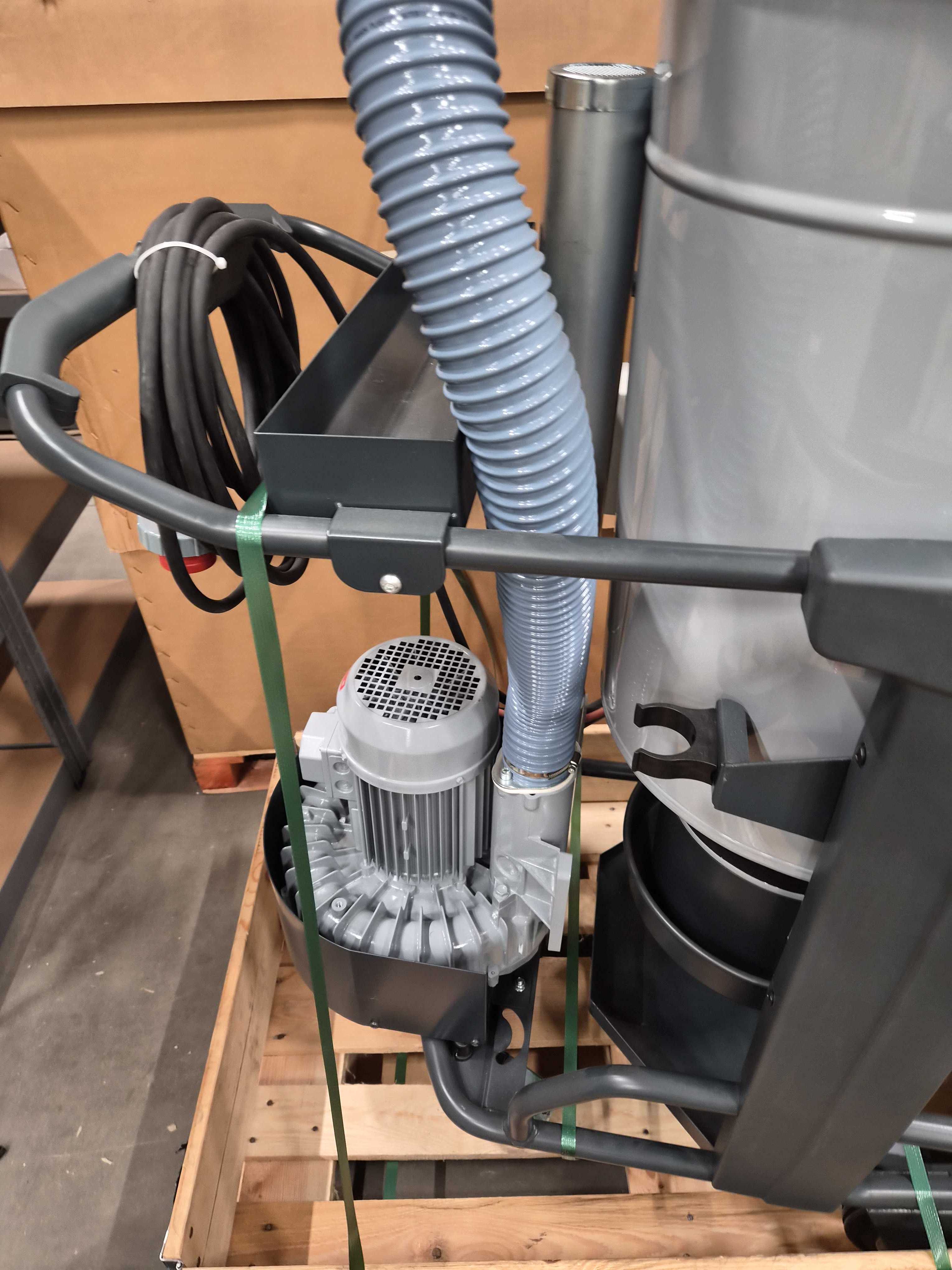 Industrial vacuum cleaner designed for handling both dust and liquid in demanding environments. The unit is built with a powerful 3-phase motor, robust steel tank and chassis on wheels for easy movement. Equipped with manual filter shaker and pressure gauge for filter monitoring. Supplied with accessories and documentation as shown in the pictures.