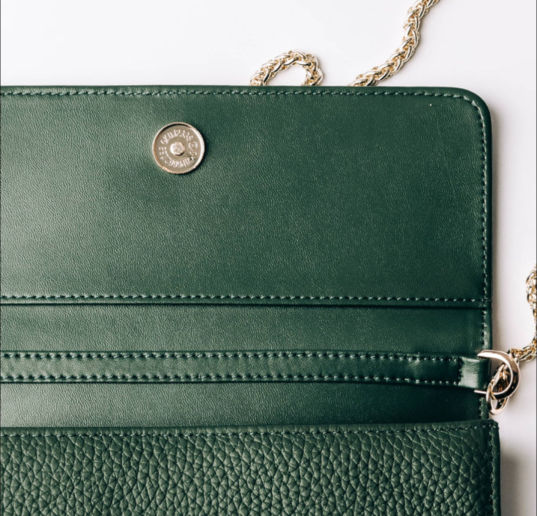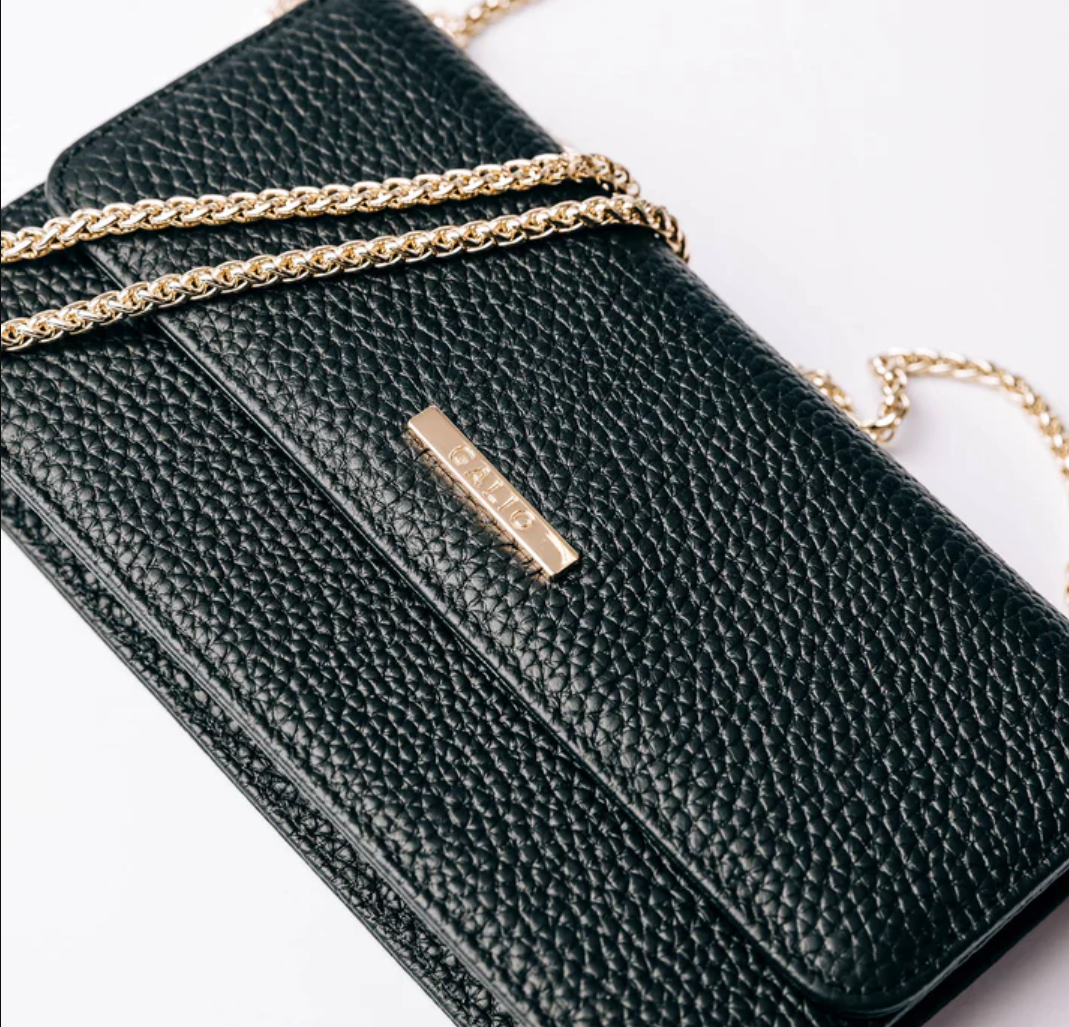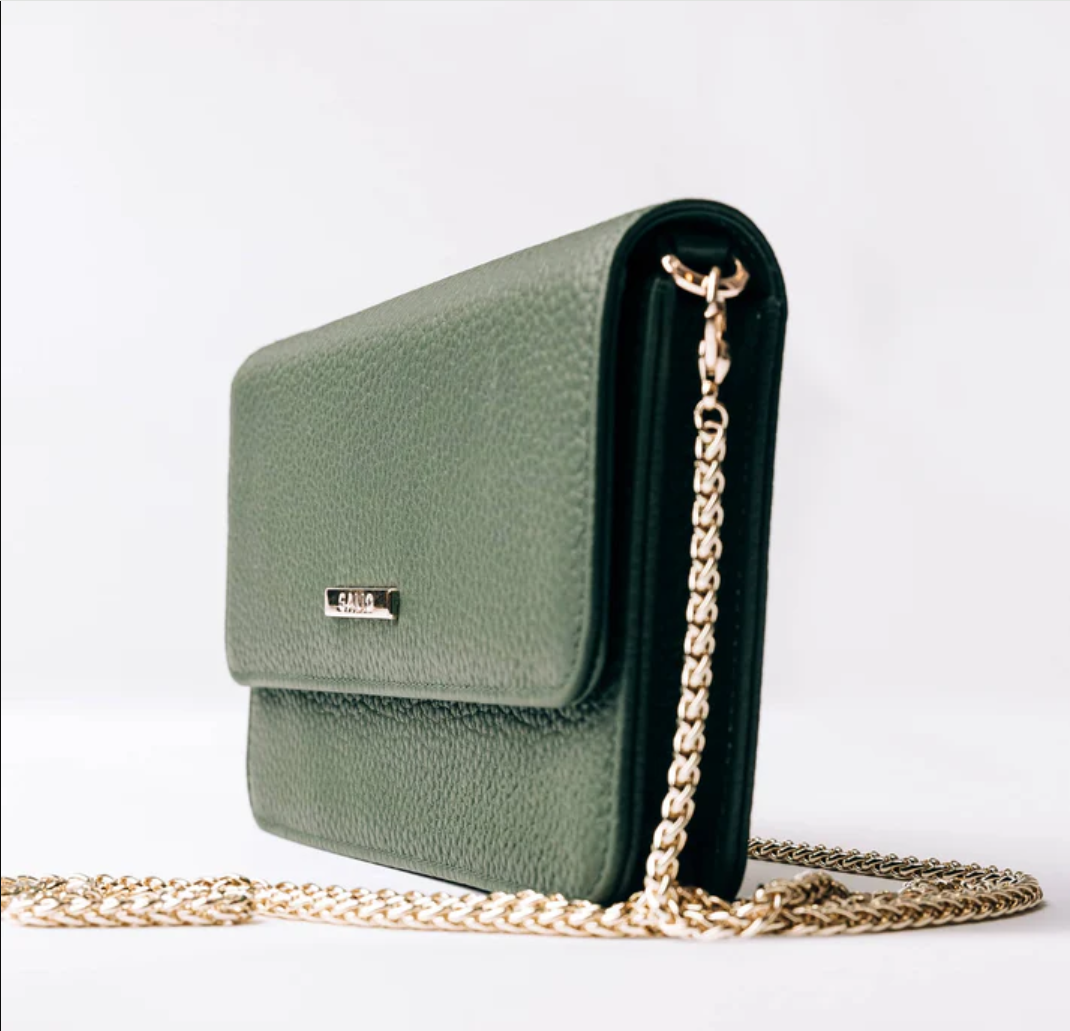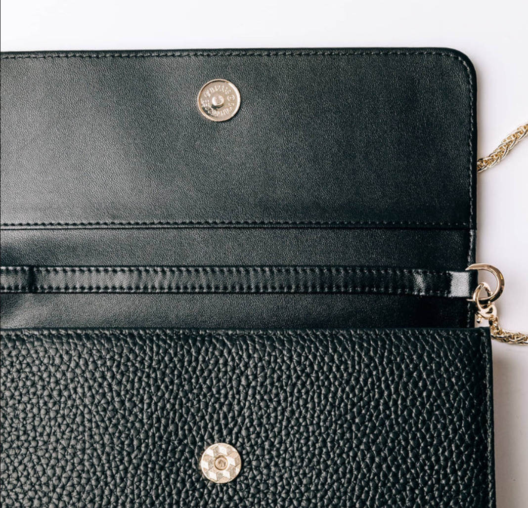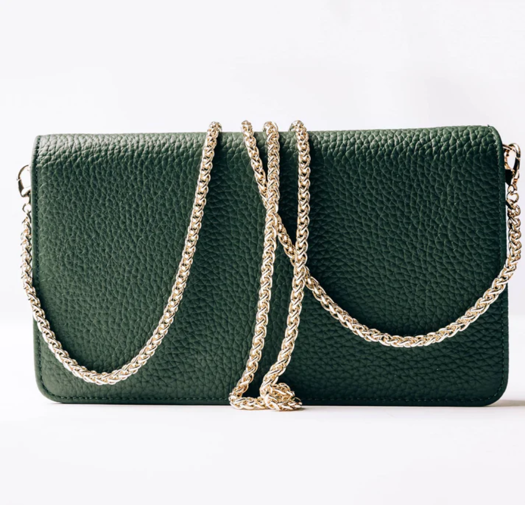 A compact and stylish bag in worked leather, designed to carry your essentials in an organized way. The chain strap provides an elegant contrast and makes the bag easy to carry over the shoulder.