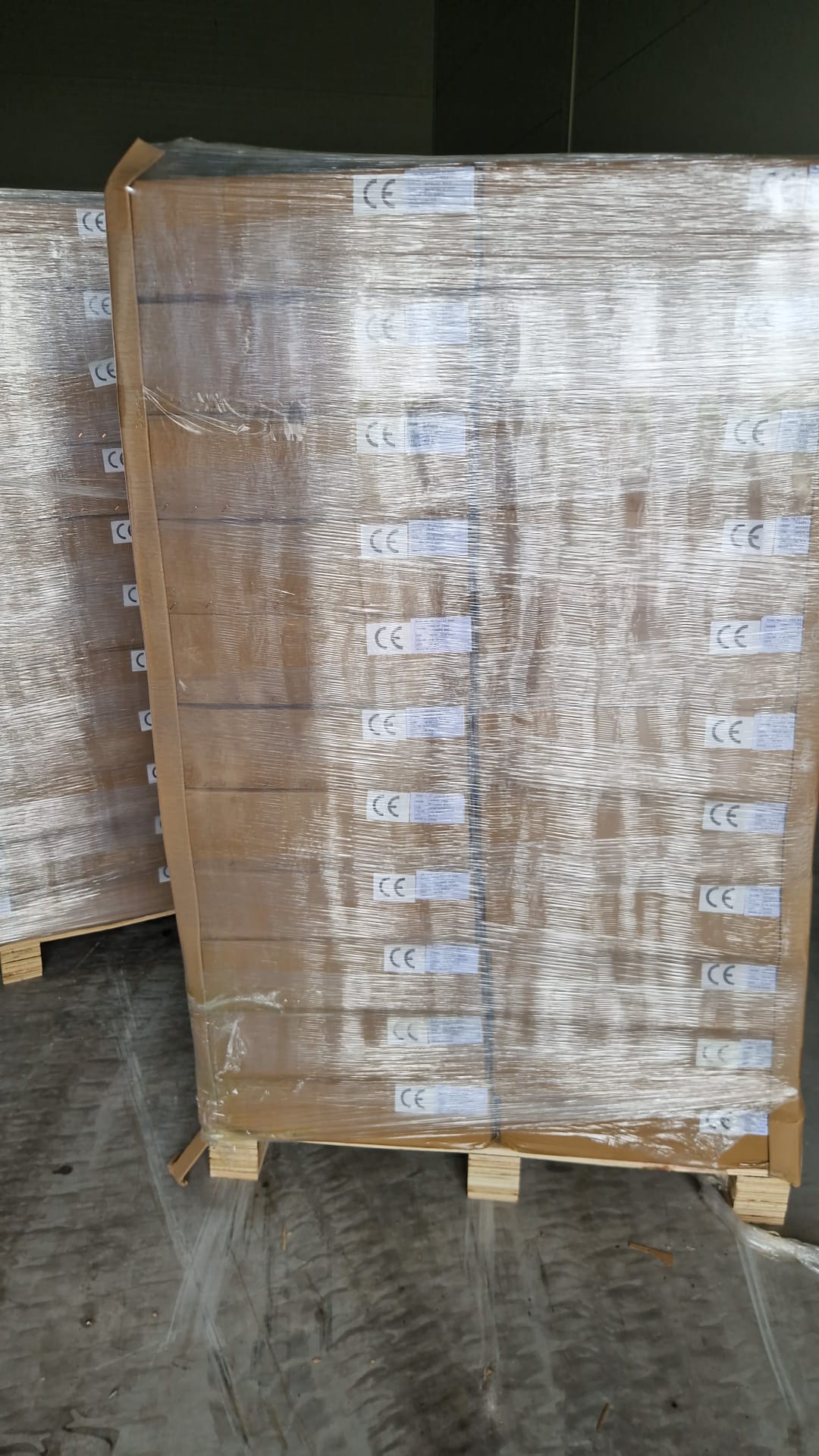Standing on a pallet in cardboard boxes