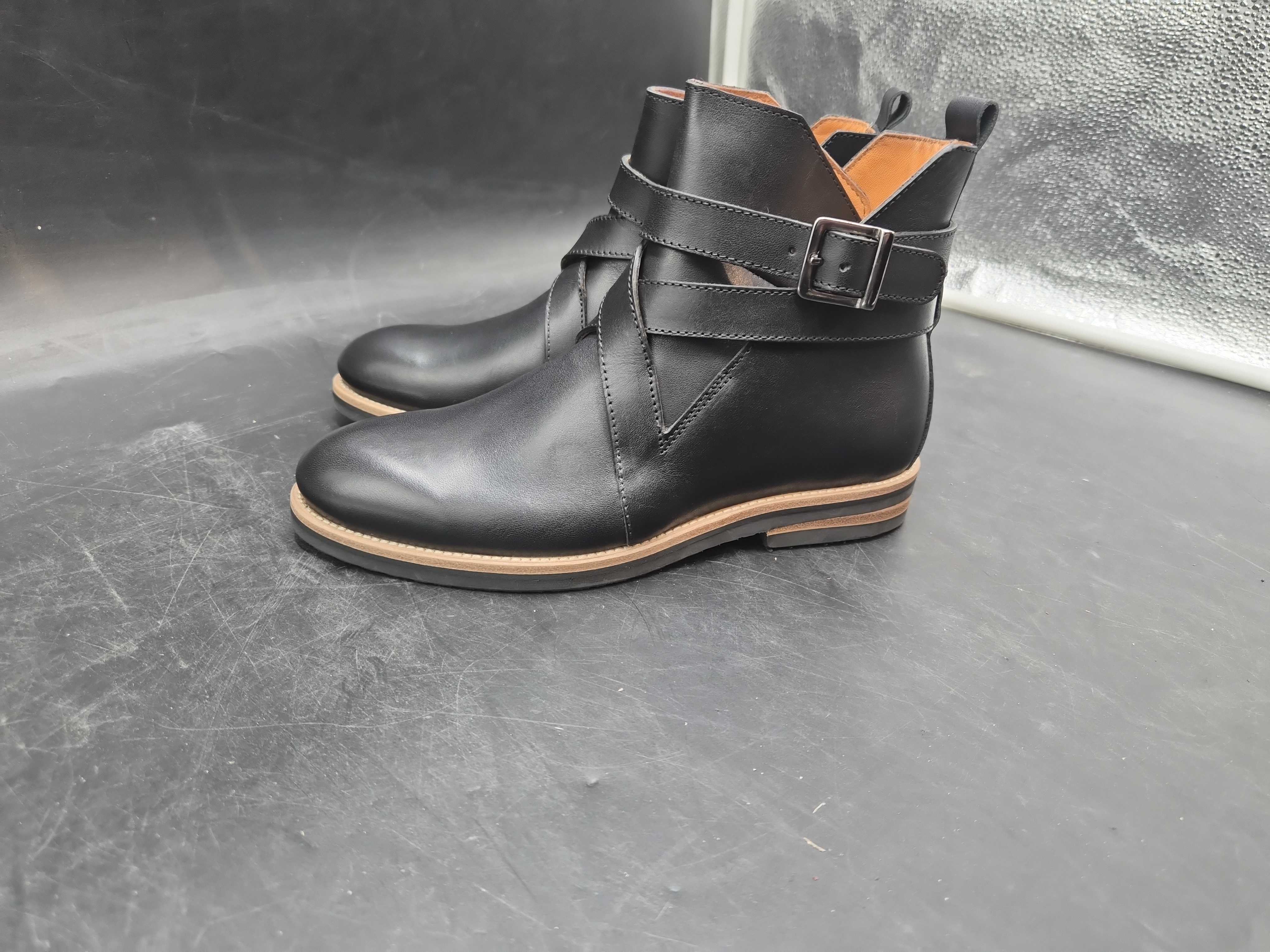 Stylish boots in black leather with a clear shape and elaborate details. The design is characterized by a strap with a buckle around the shaft that gives a sober but characteristic expression. Suitable for both everyday wear and more dressed-up occasions.