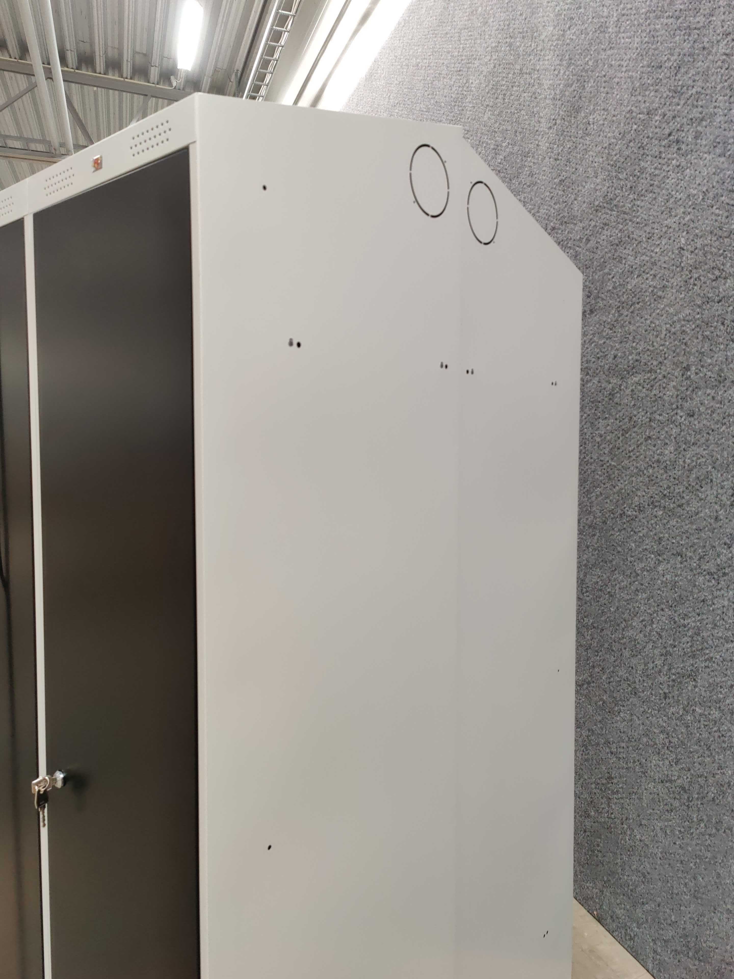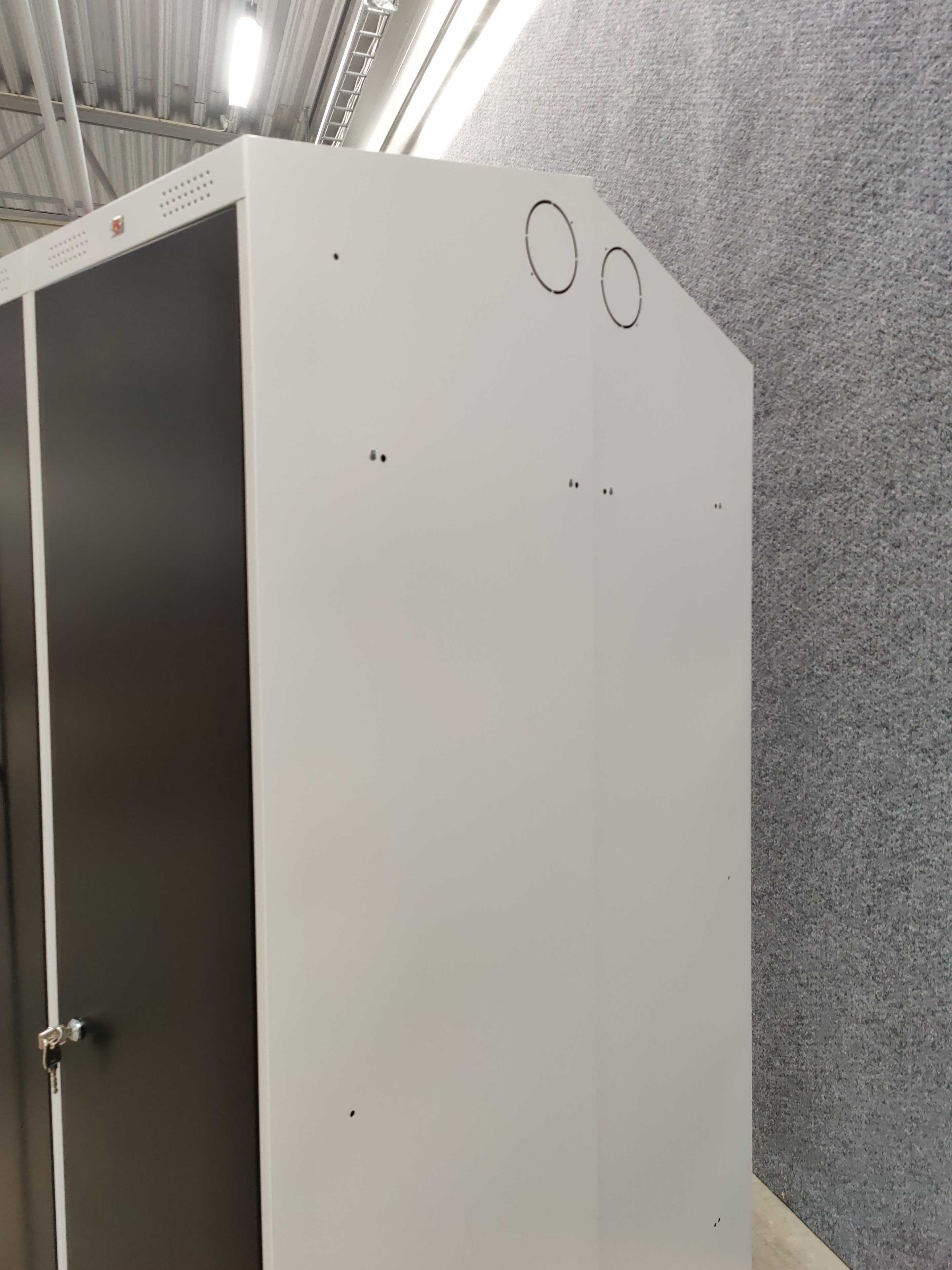 Wardrobe with hat shelf, clothes rail with two hooks, sloping ceiling and ventilation holes. Prepared for ventilation system. Doors with door stop at 90° and rubber cushioning. Incl. plinth