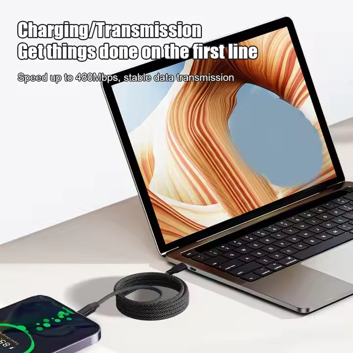 Practical and durable charging cable with magnetic structure that retracts using magnets without tangling. Perfect for charging mobile phones, tablets, laptops and other Type-C devices. The braided design provides extra durability and a more organized use.