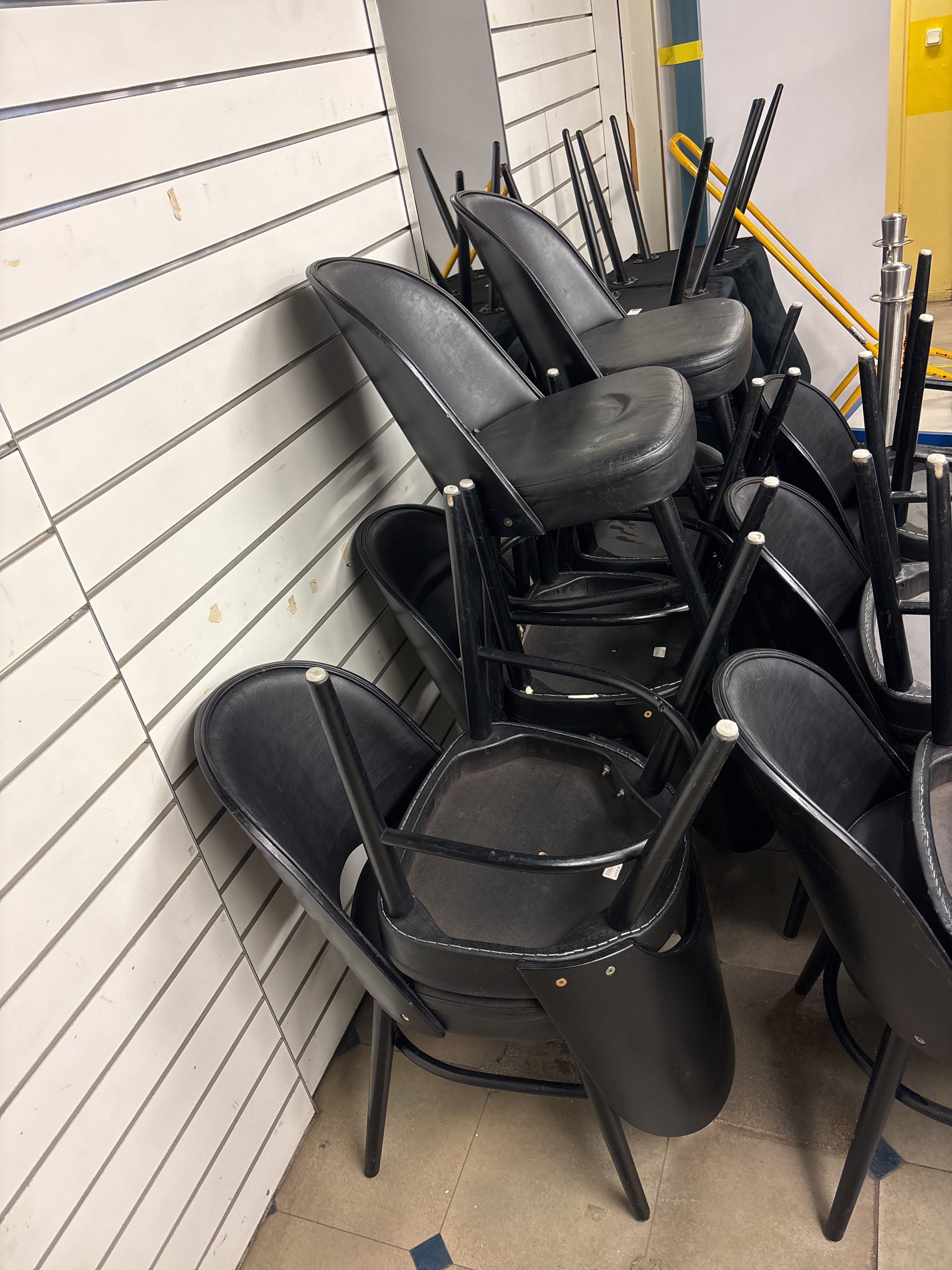 • 20 chairs with black lacquered wooden base and seat and backrest upholstered in black imitation leather