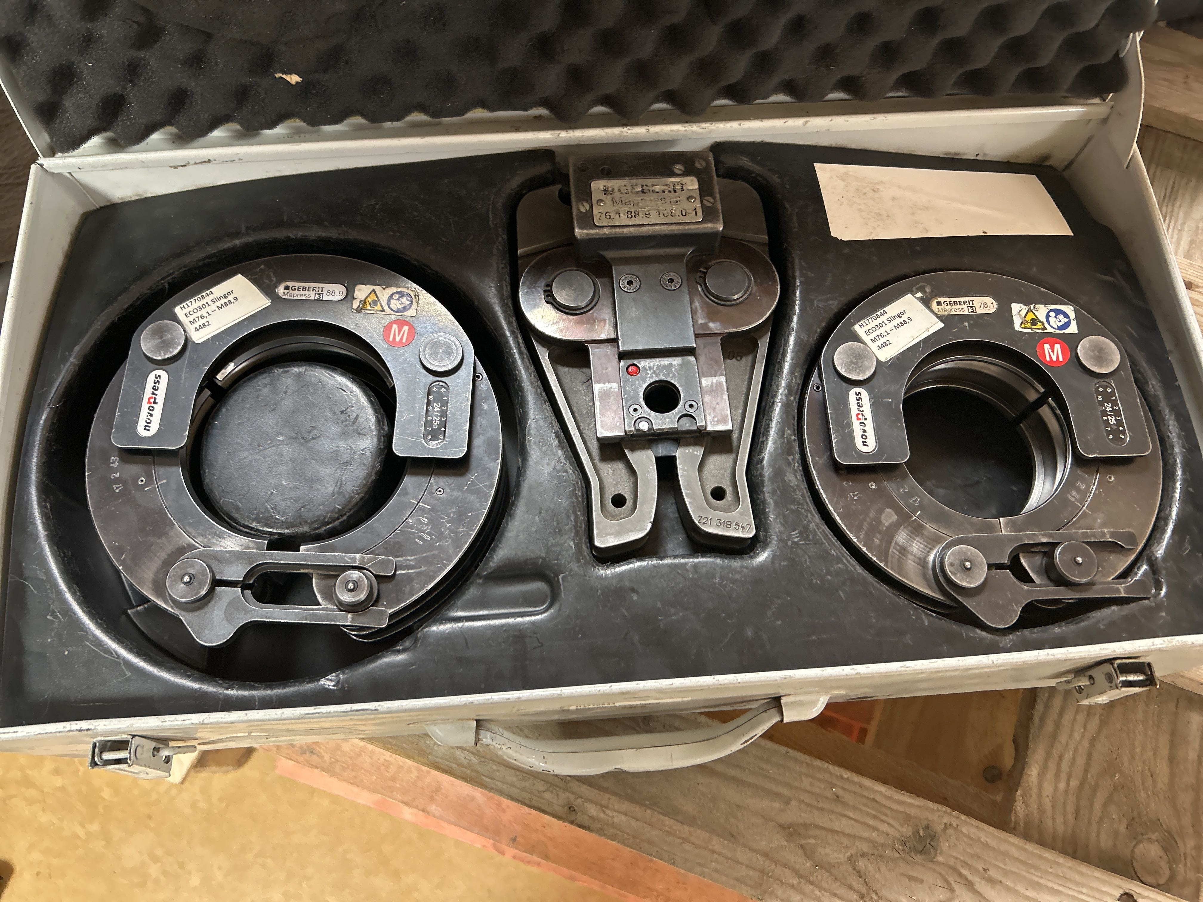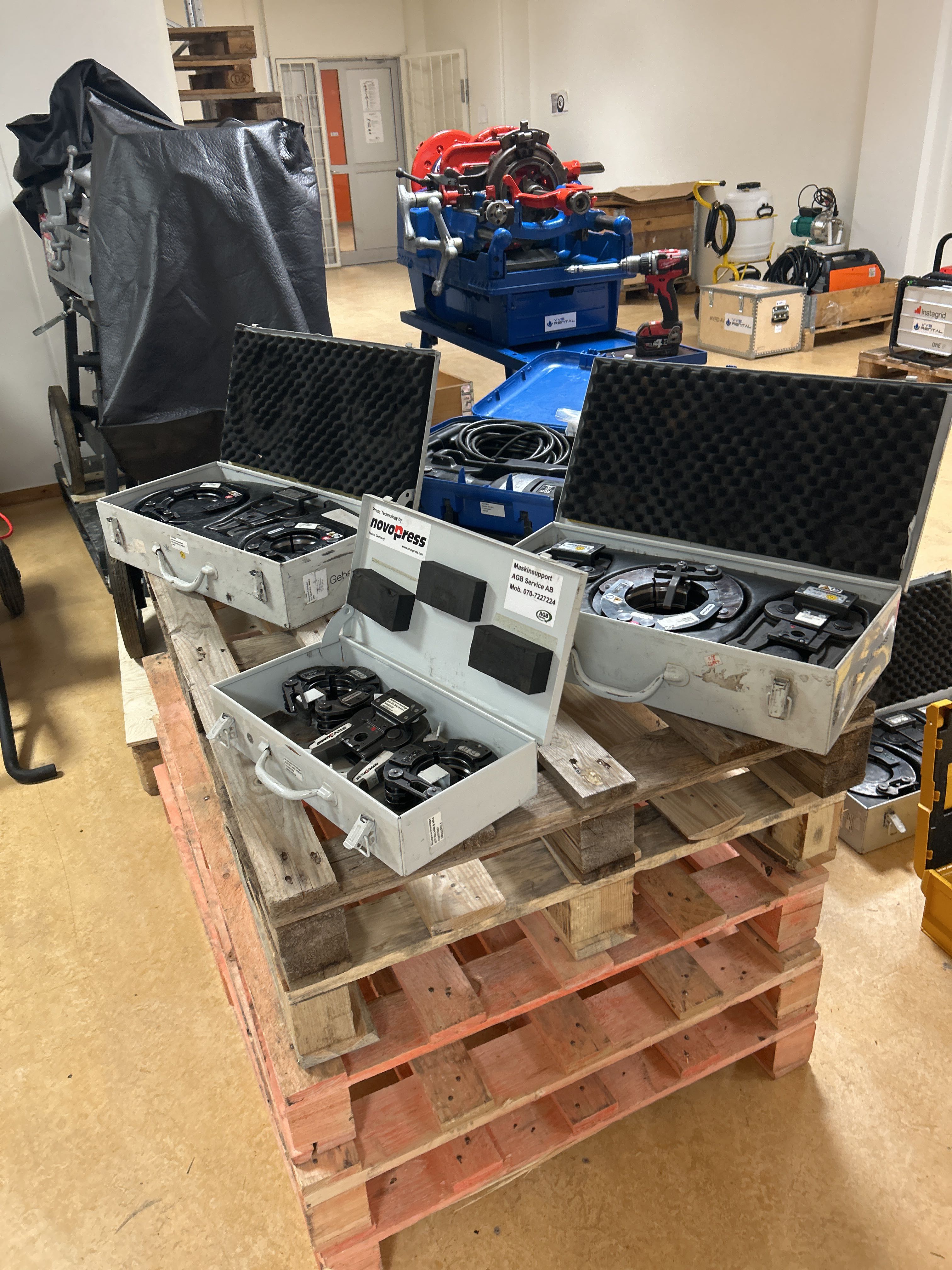 The auction includes: Press machines from Novopress, groove saws, press tools, water heaters, etc.