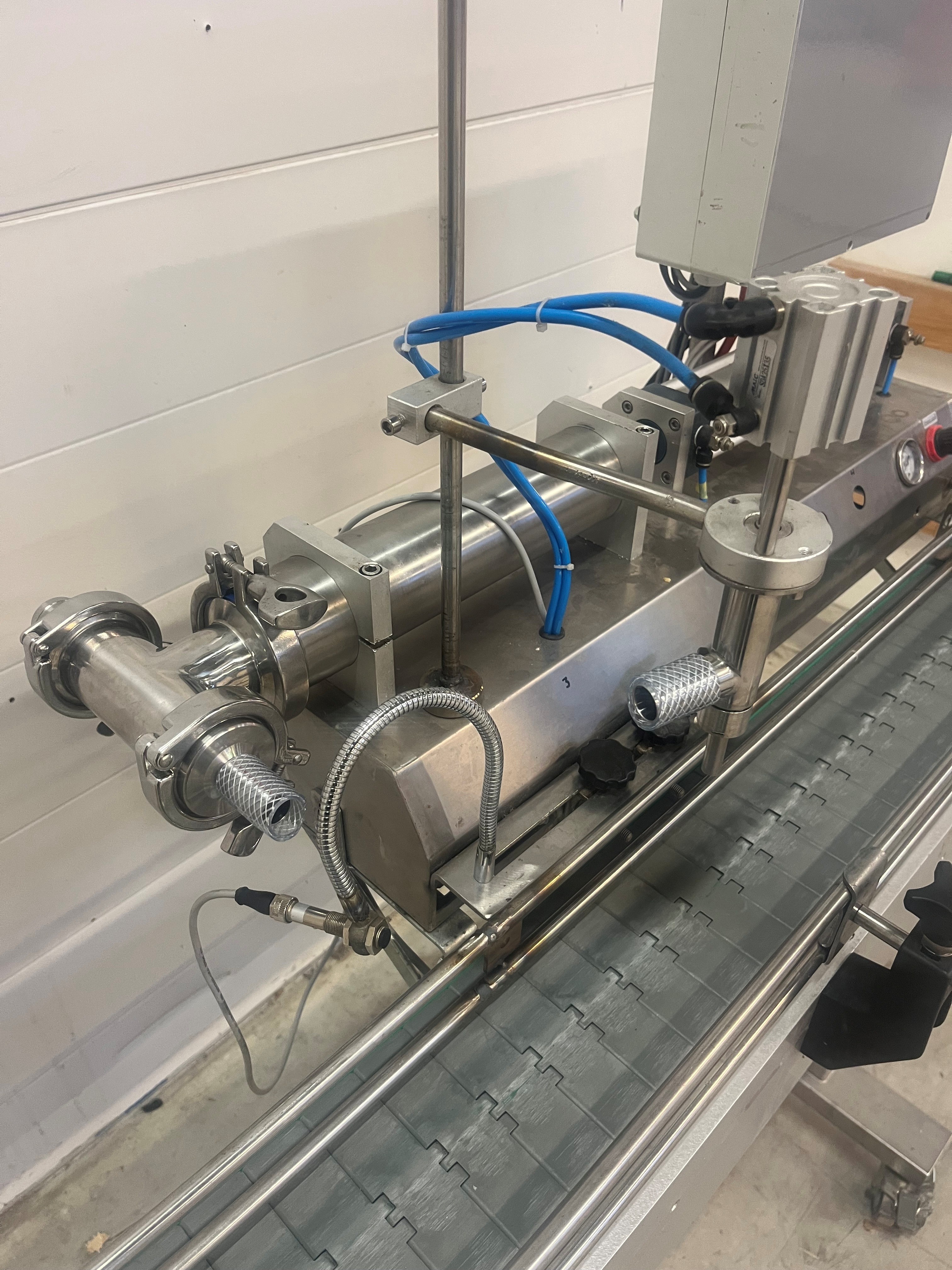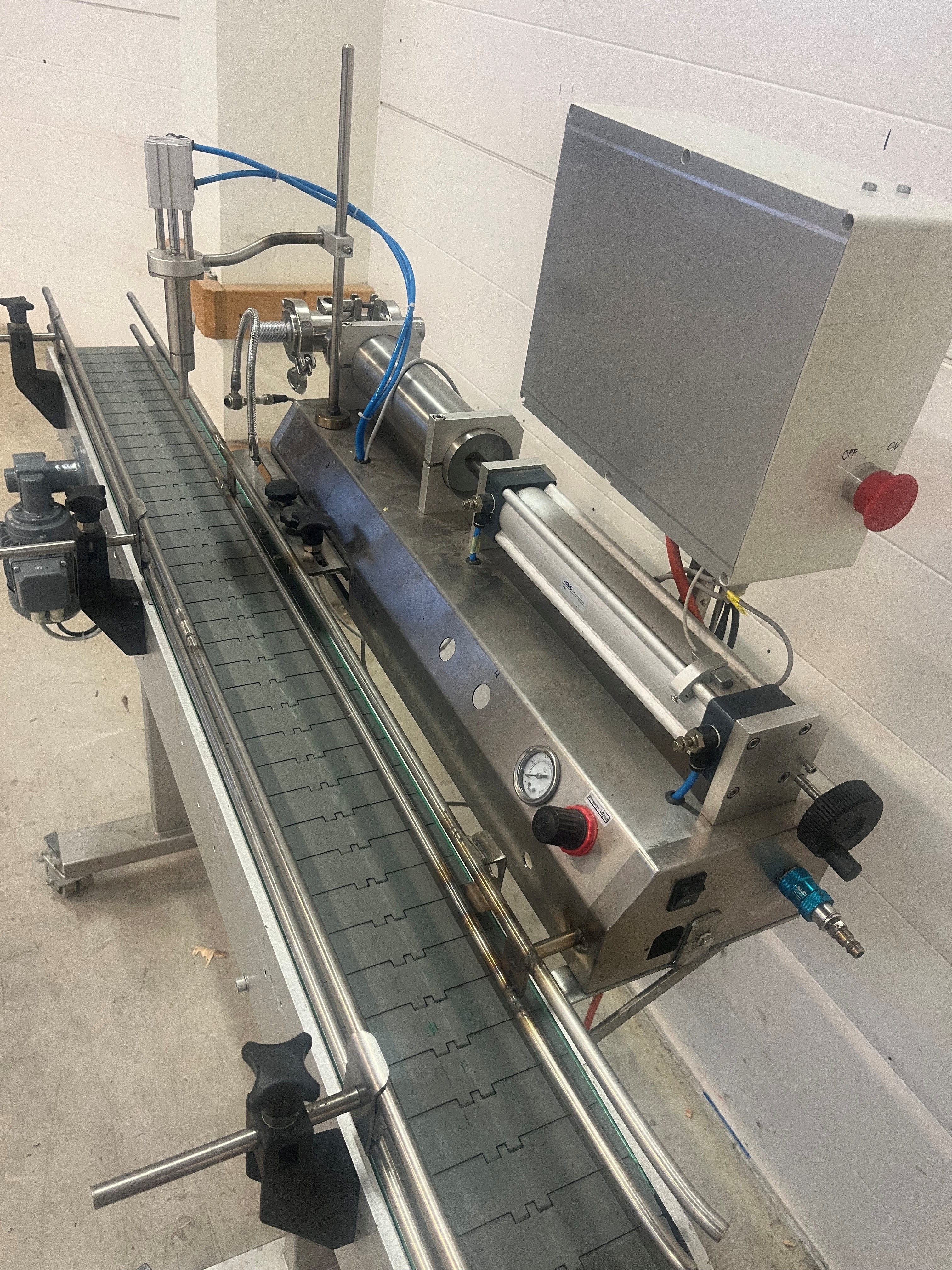Semi-automatic filling machine with conveyor belt