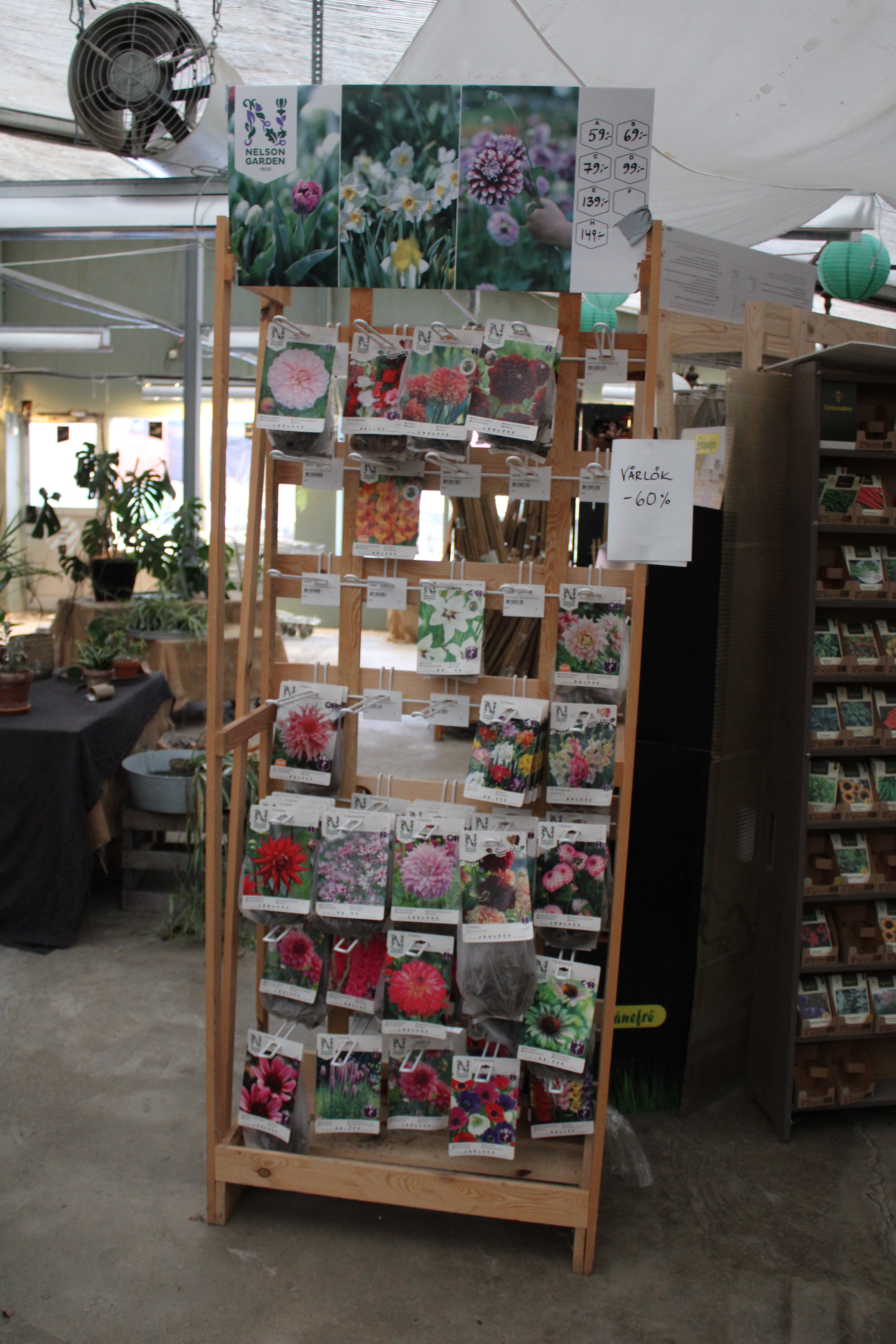 Three racks of seeds and onions.