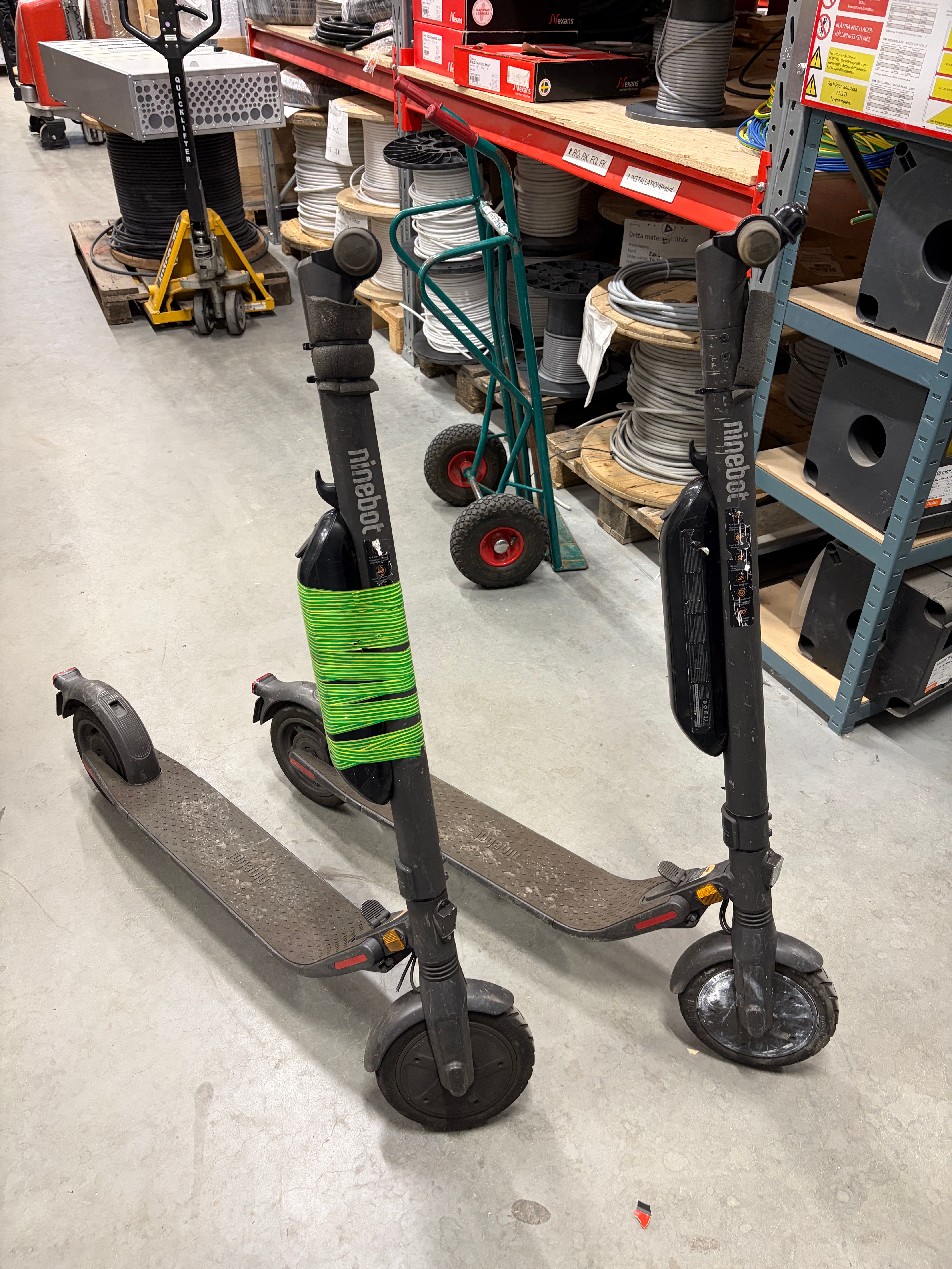 This auction includes office furniture such as desks, filing cabinets and storage cabinets, as well as ladders from Skeppshult and Scando in various lengths. There are also cable drums, cord racks, material carts and a pair of electric scooters from Ninebot by Segway.