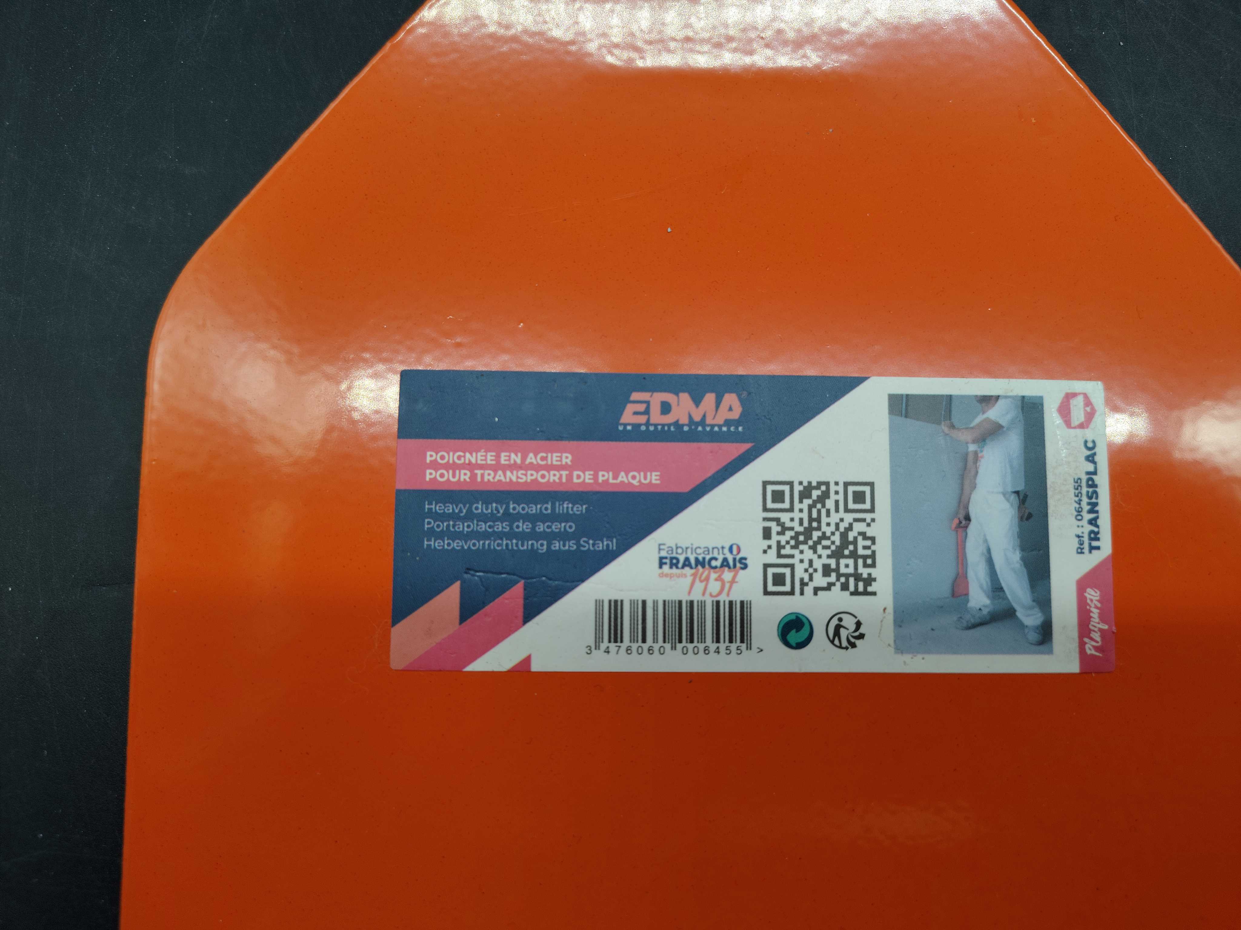 Ergonomic carrying handle in an angled design intended for safe handling of board material. The construction is designed to facilitate lifting and transporting, for example, plasterboard, plywood and board boards when working where precision and relief are important. Made of painted steel with a wide contact surface and a rounded handle with patterned rubber for a stable grip.