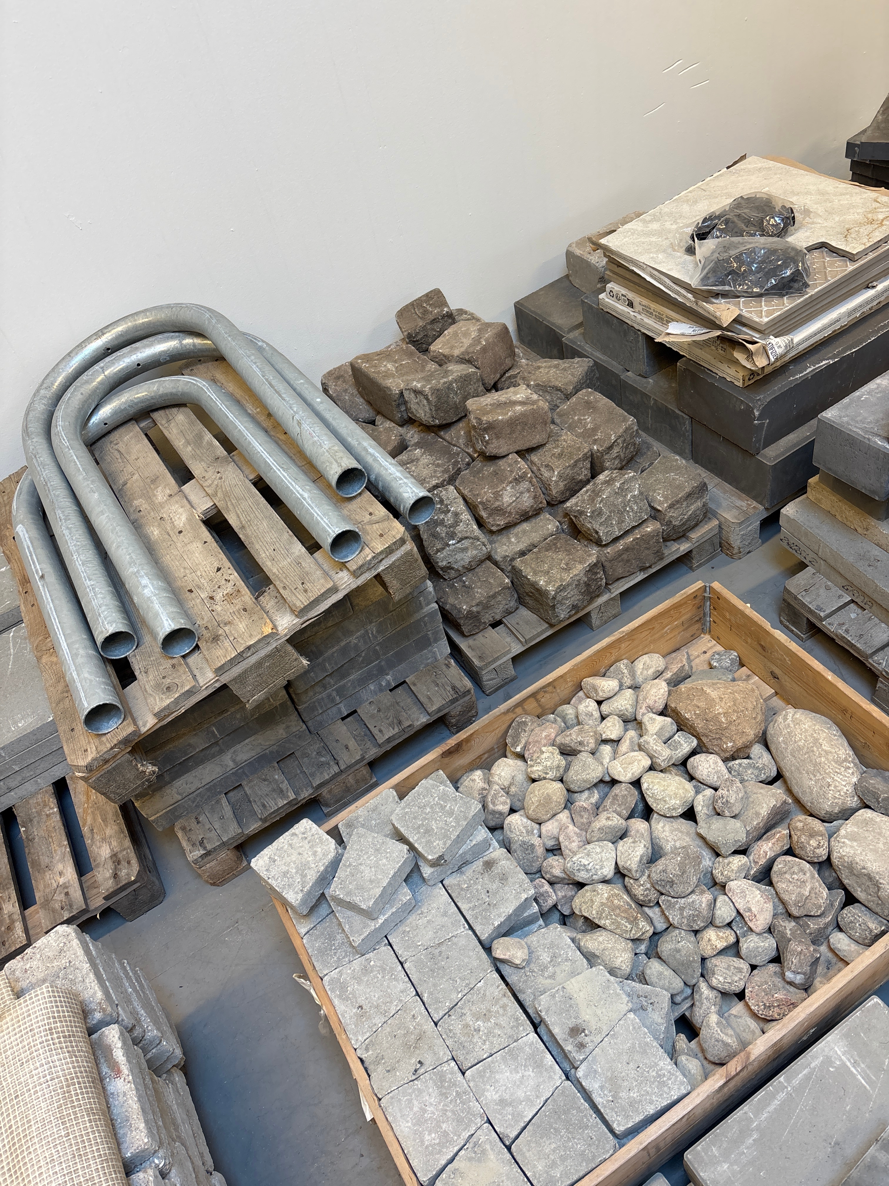 - Lot with mixed materials for paving and construction work. Contains various types of paving stones, cobblestones, bricks, wooden details, pallet collars and pipe and sheet metal materials