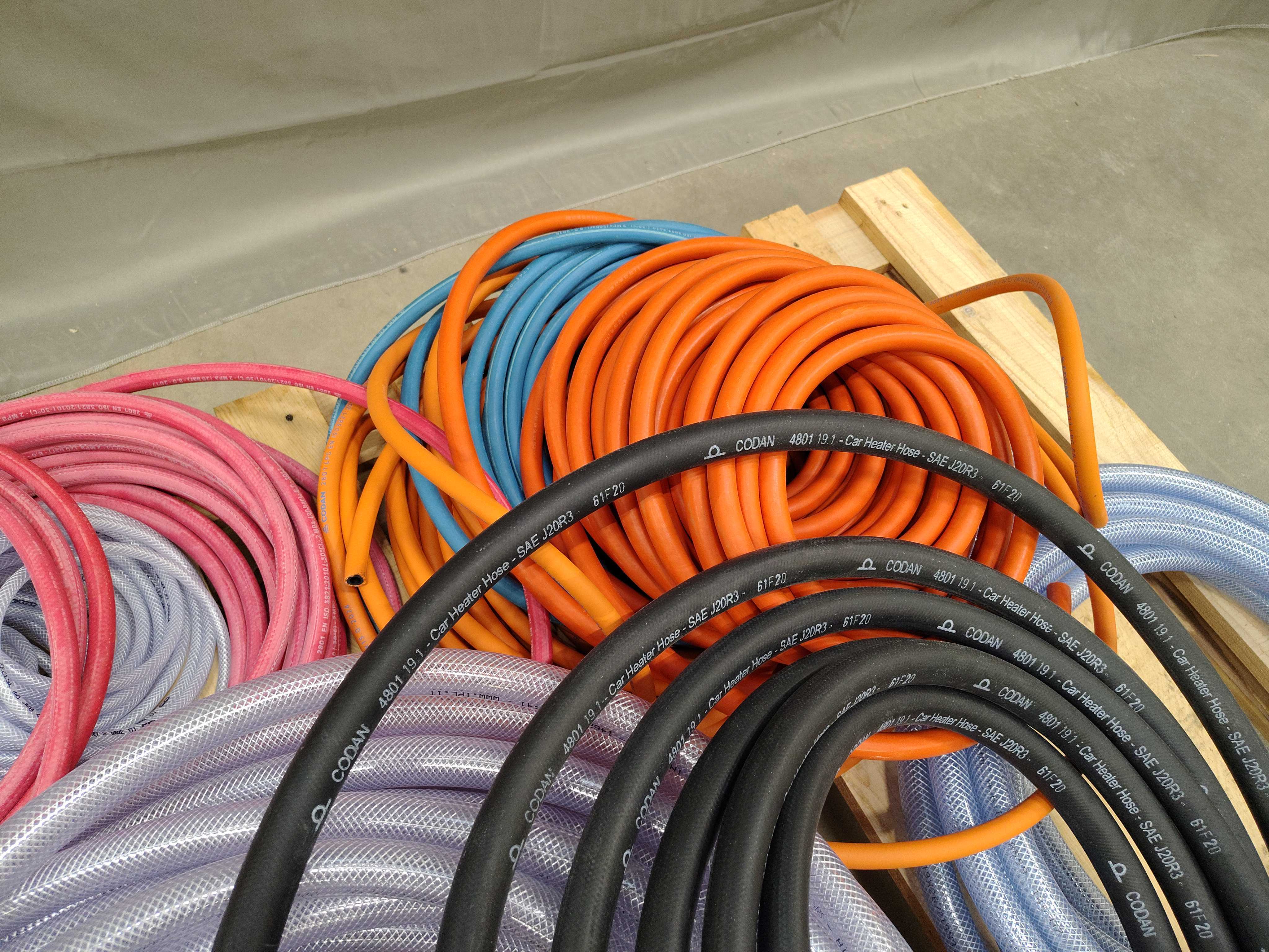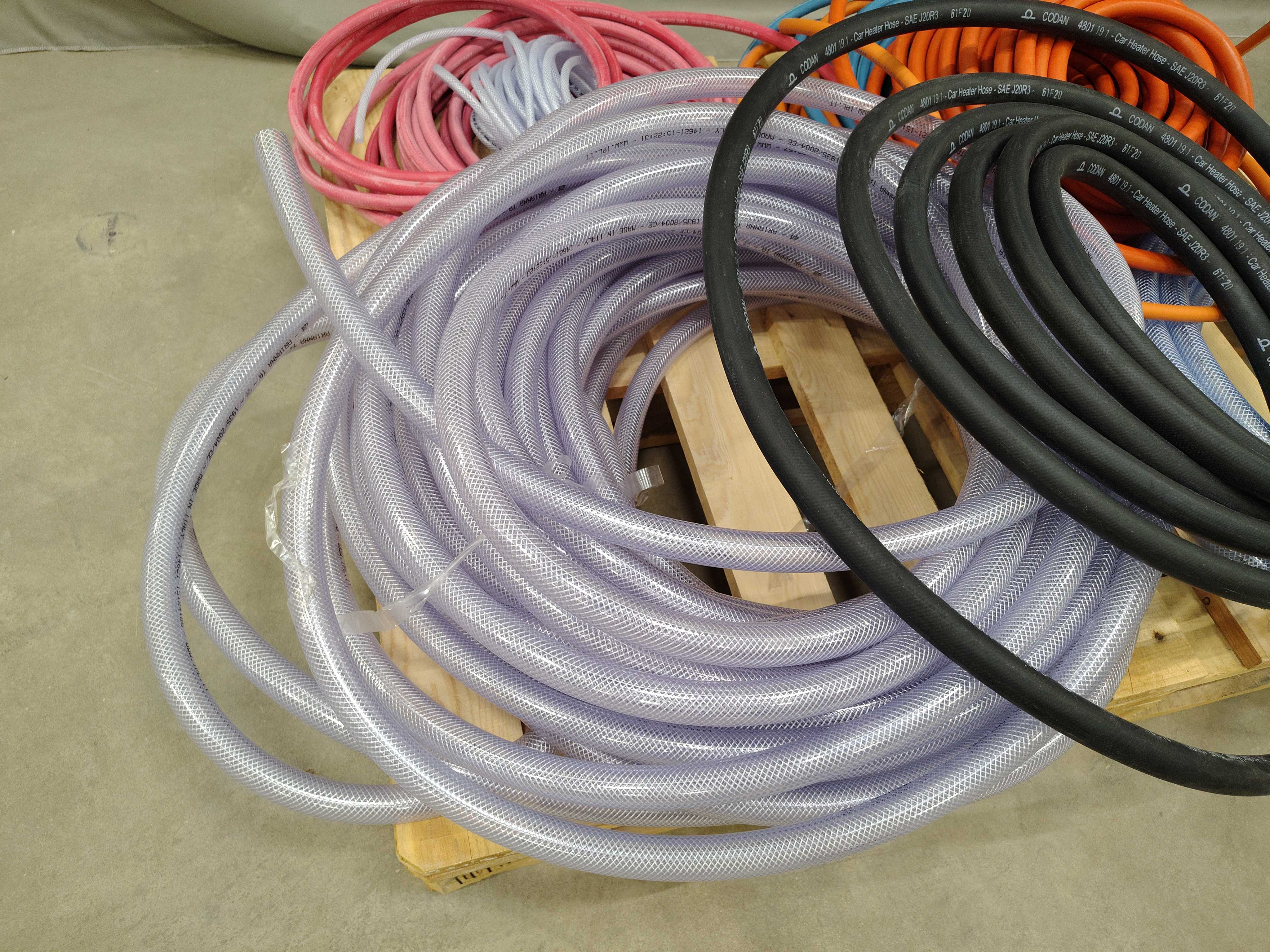 Mixed lot of hoses in different materials and colors, suitable for several applications in industry, workshop and installation. Flexible hoses for liquids, air and technical applications, for example. Delivered loose on a pallet.
