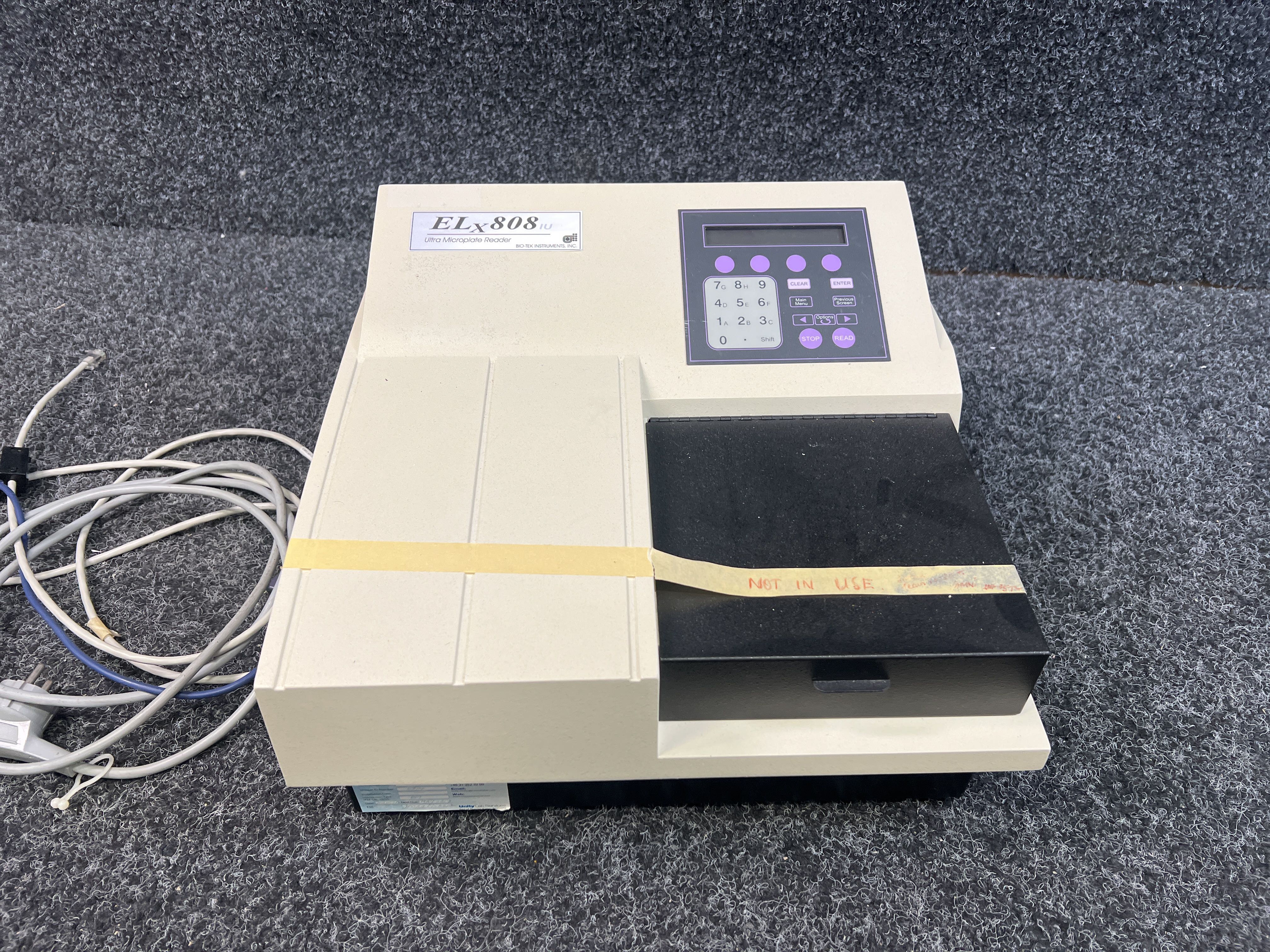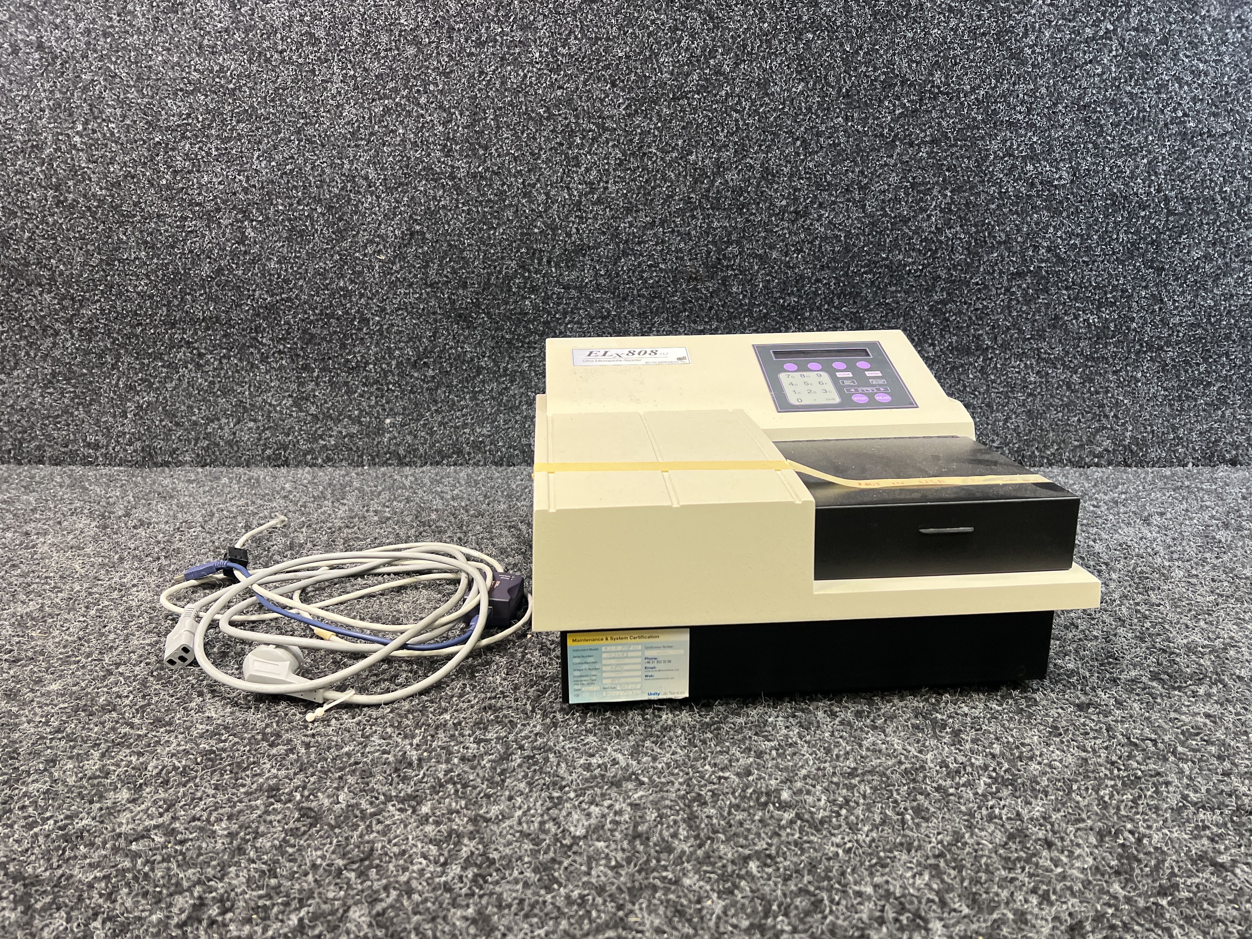 This ELx808 microplate reader is used in laboratories to analyze samples based on optical density. It is often used for ELISA tests, cell analyses, and drug development.