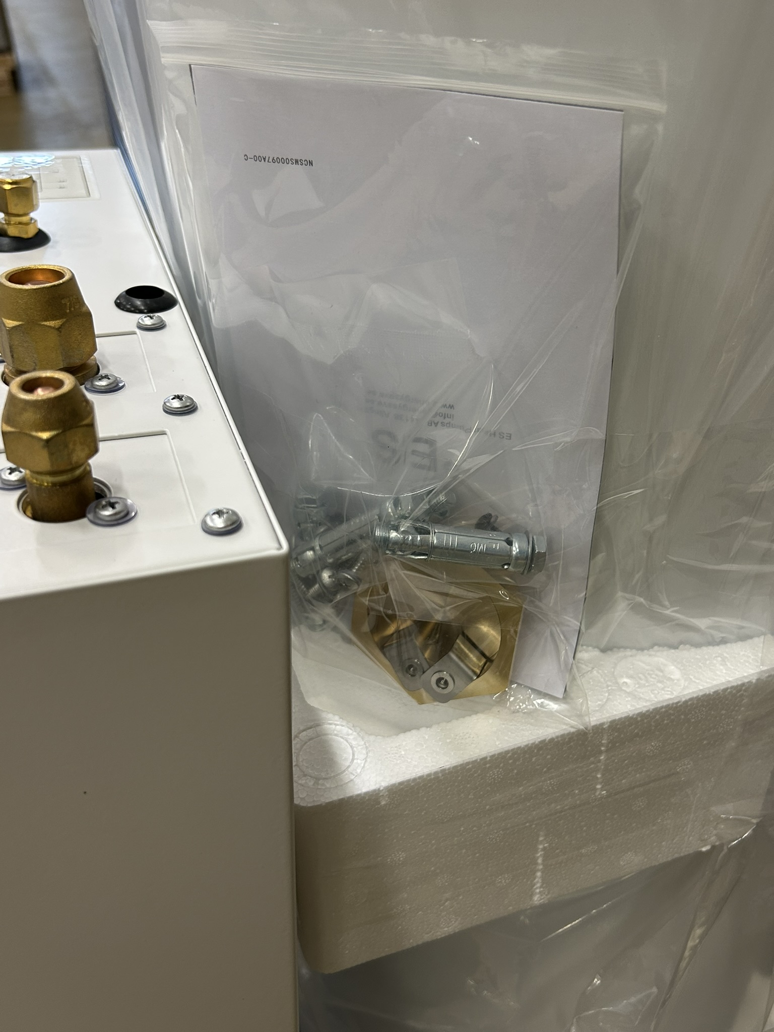 The heat pump is sold together with a stainless steel buffer tank and condensation water tray.