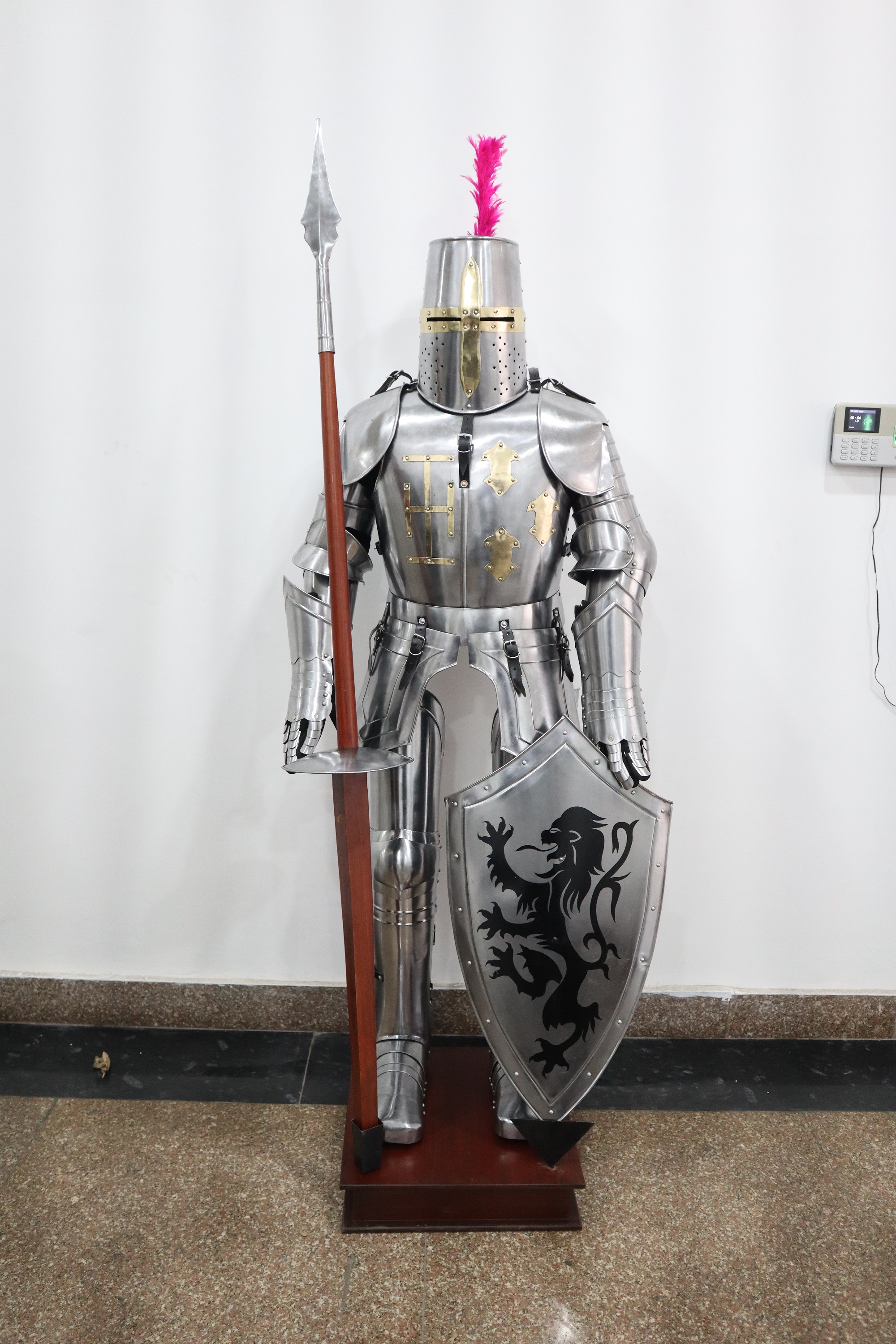 Handmade medieval armor with spear, shield and wooden platform.